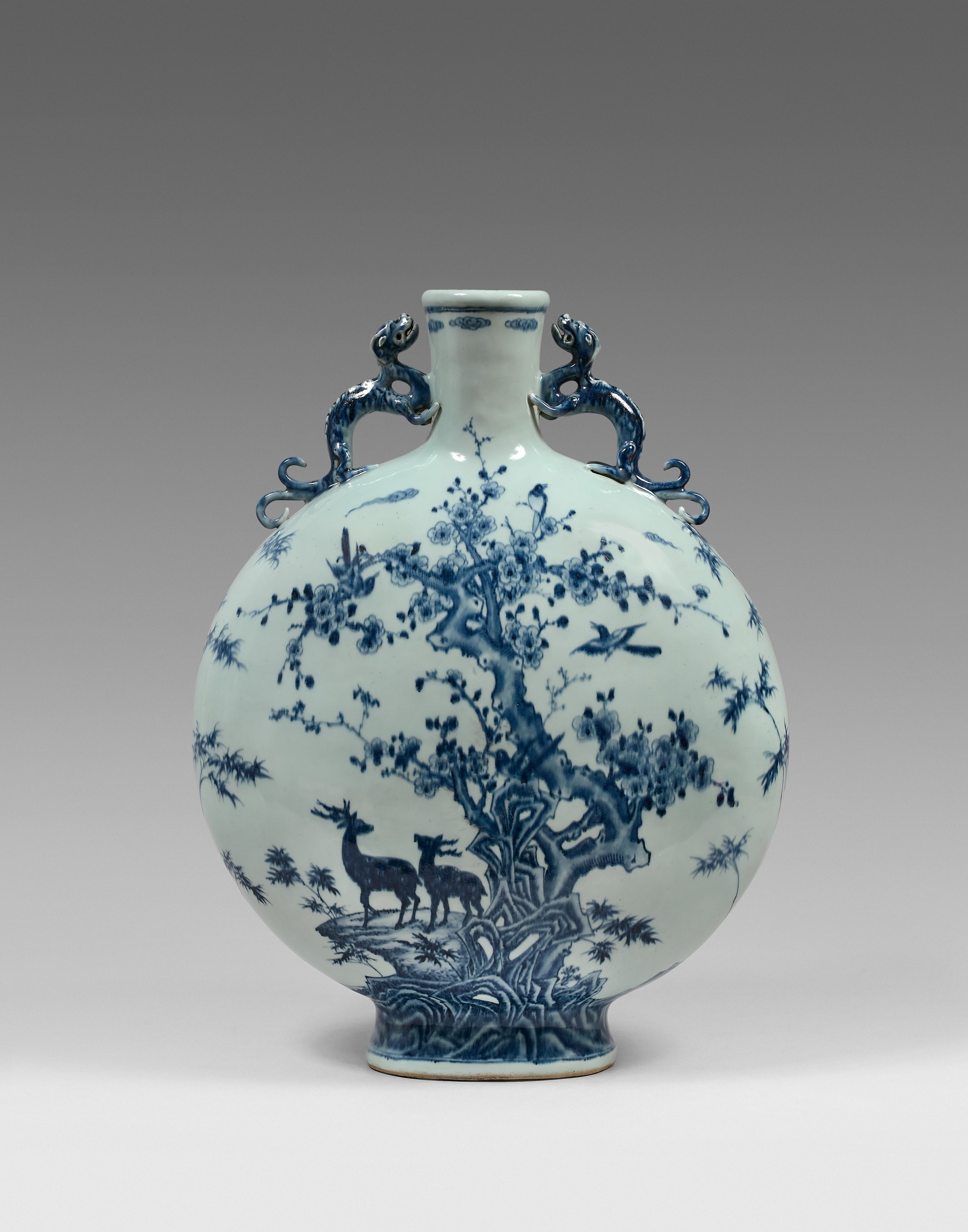 à décor en bleu sous couverte de daims parmi les rochers, s'ébattant sur l'une des faces sous un pin duquel s'envolent des grues, sur l'autre face sous un prunier en fleurs, les côtés ornés de bambous, formant ainsi le motif des trois amis de l'hiver (pin, bambou, prunier). Les anses formées par des chilong émaillés bleu en relief et détachés, le col légèrement ourlé orné de motifs de nuages stylisés.