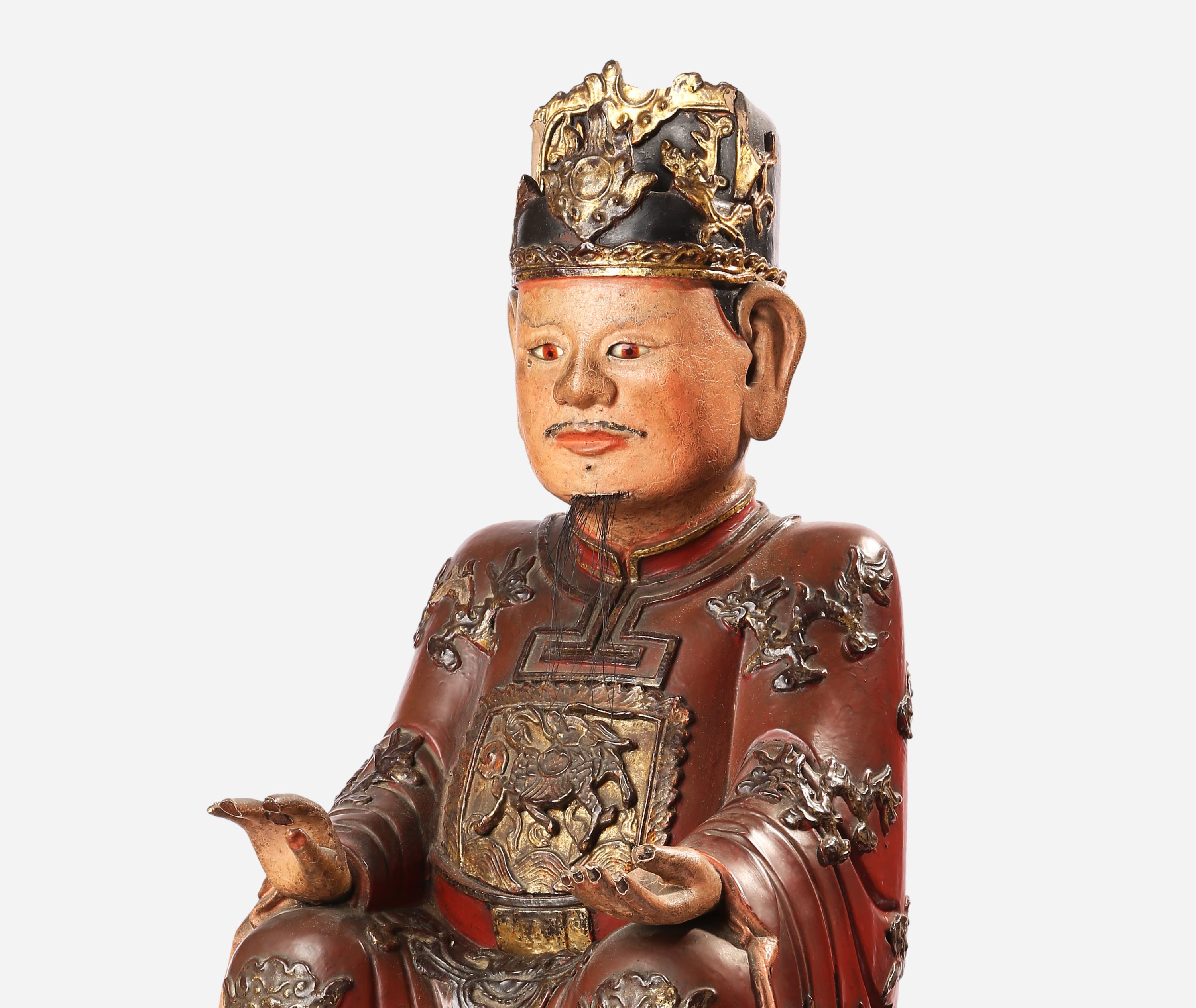 Vietnamese statuette of a dignitary in carved and lacquered wood, offered for the birth of Emperor Bao Daï in 1913 to the delivering physician.