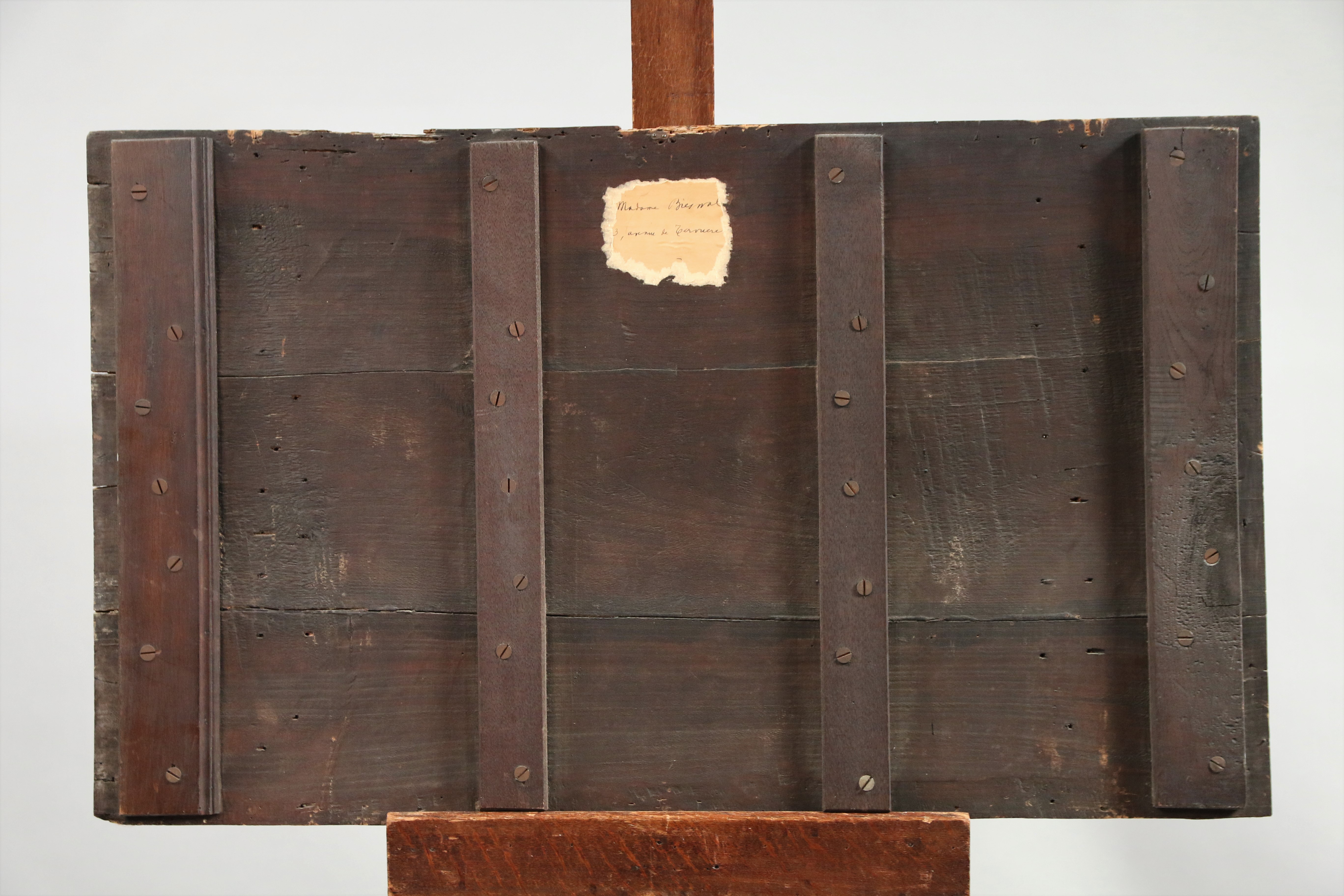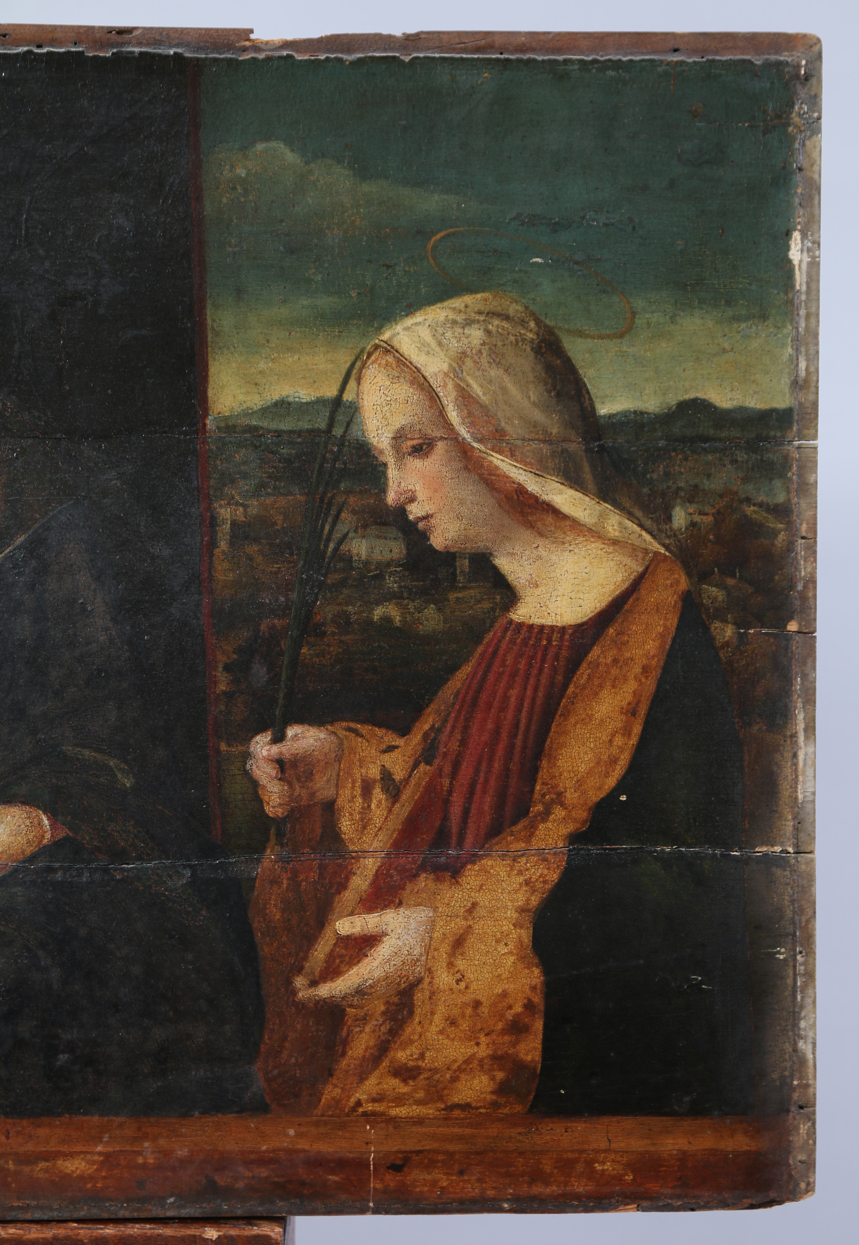 Sans doute originaire de Trévise puis actif un moment à Padoue, Francesco Bissolo est documenté pour la première fois en 1492 auprès de Giovanni Bellini dont il fut laide, travaillant au Palais des Doges de Venise. Dans les deux premières décennies du XVIème siècle, Bissolo subit principalement l'influence de ce grand maître vénitien dont il reprend les modèles de composition: format en largeur, présentation de saints personnages accostant la Vierge et l'Enfant magnifiée par un drap d'honneur, tous représentés à mi-corps devant un lointain paysage. Les attitudes de la Vierge et celle de l'Enfant sont également puisées parmi les oeuvres du catalogue de Bellini ; ne citons que la Madone et l'Enfant de Bellini à Venise (Galleria dell'Accademia inv. 881) signée vers 1500-1504 ou celle de Milan (Pinacoteca Brera, inv. 193) datée de 1510.
