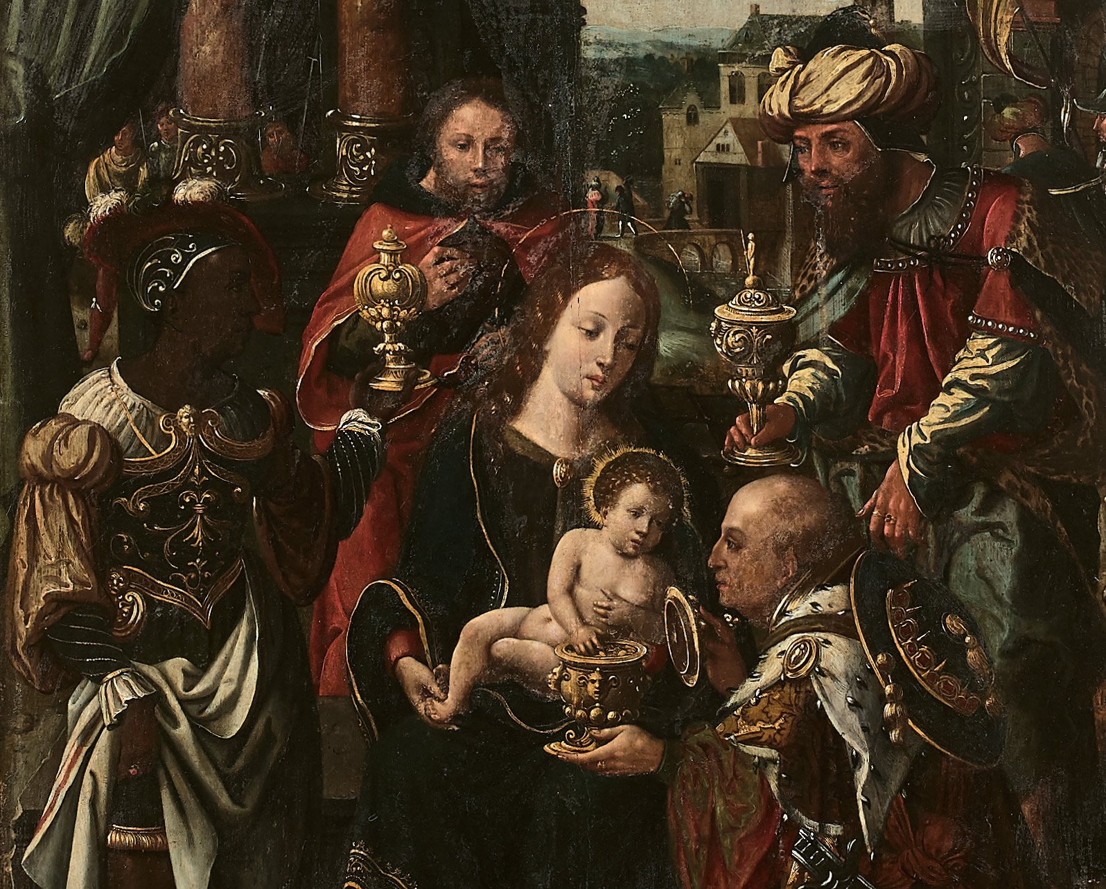 Dans le panneau central, l'il peut retrouver le goût du détail caractéristique de la tradition picturale flamande dans les riches brocarts, rehaussés de motifs de fils d'or et argent, les bijoux, les pièces d'orfèvrerie, les armes et armures aux ornements ciselés, l'étroit et lumineux liseré qui borde les manteaux, ainsi que dans les paysages rustiques au second plan. Les draperies souples et monumentales dénotent l'influence de la Renaissance italienne.