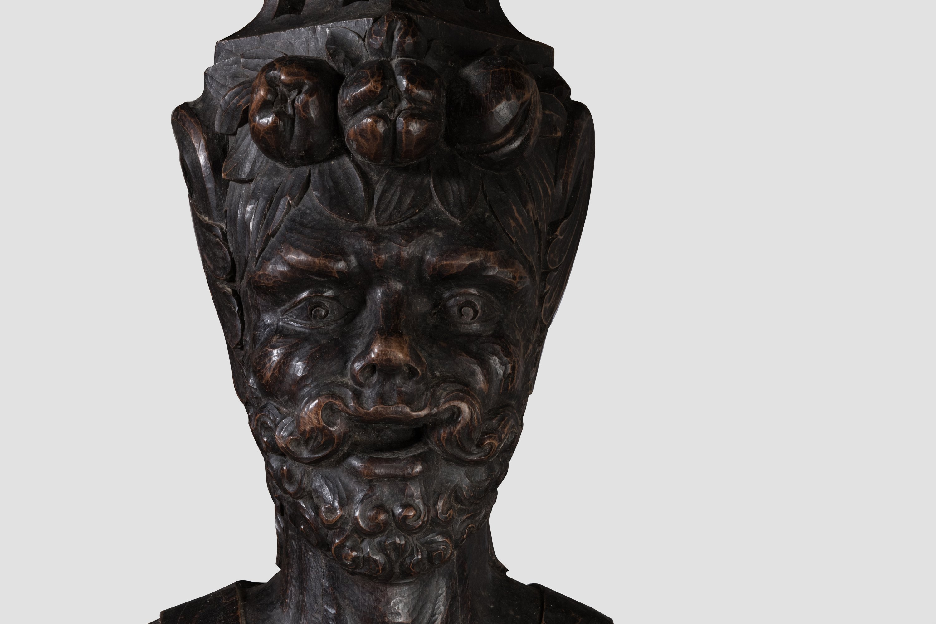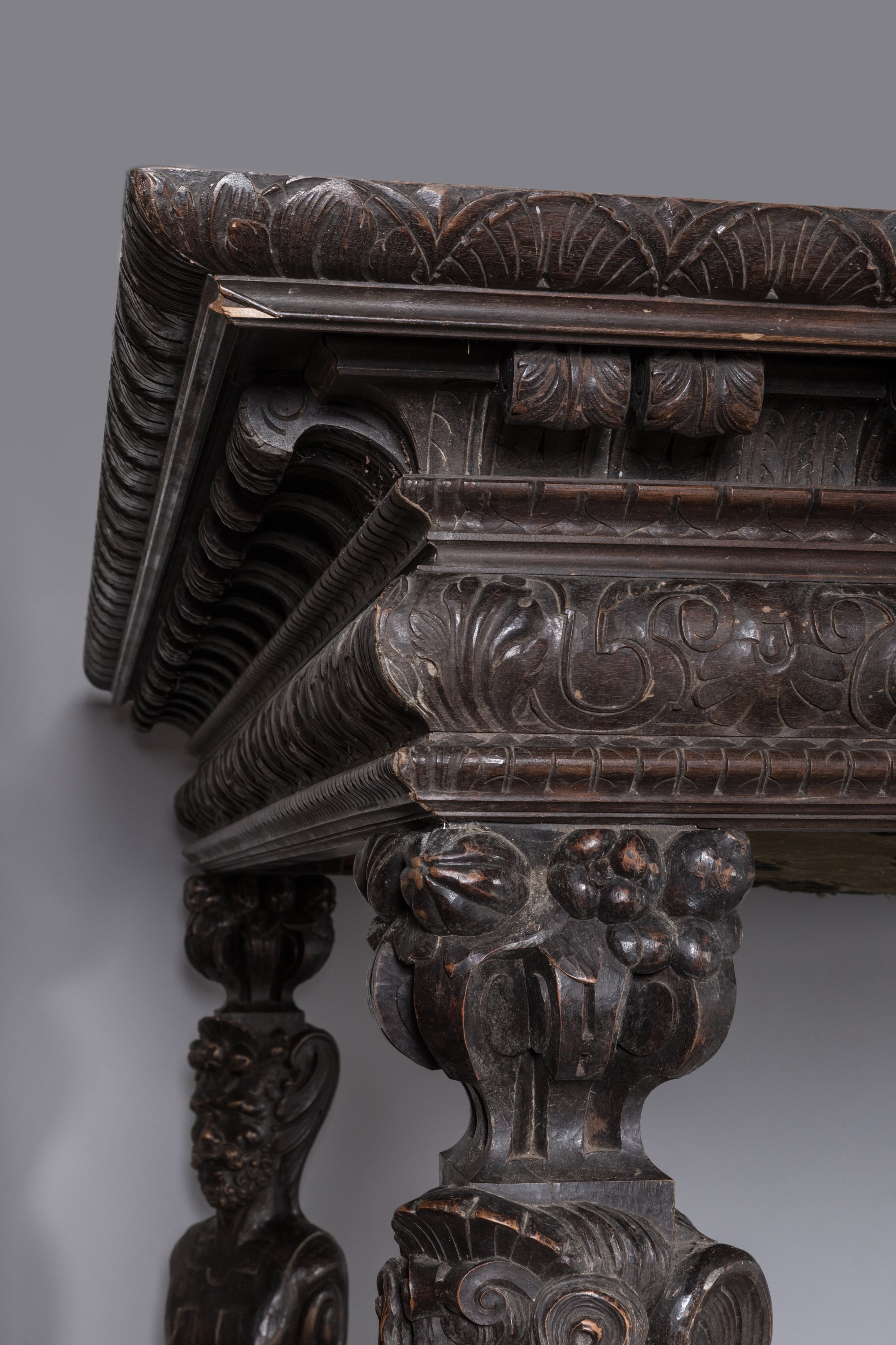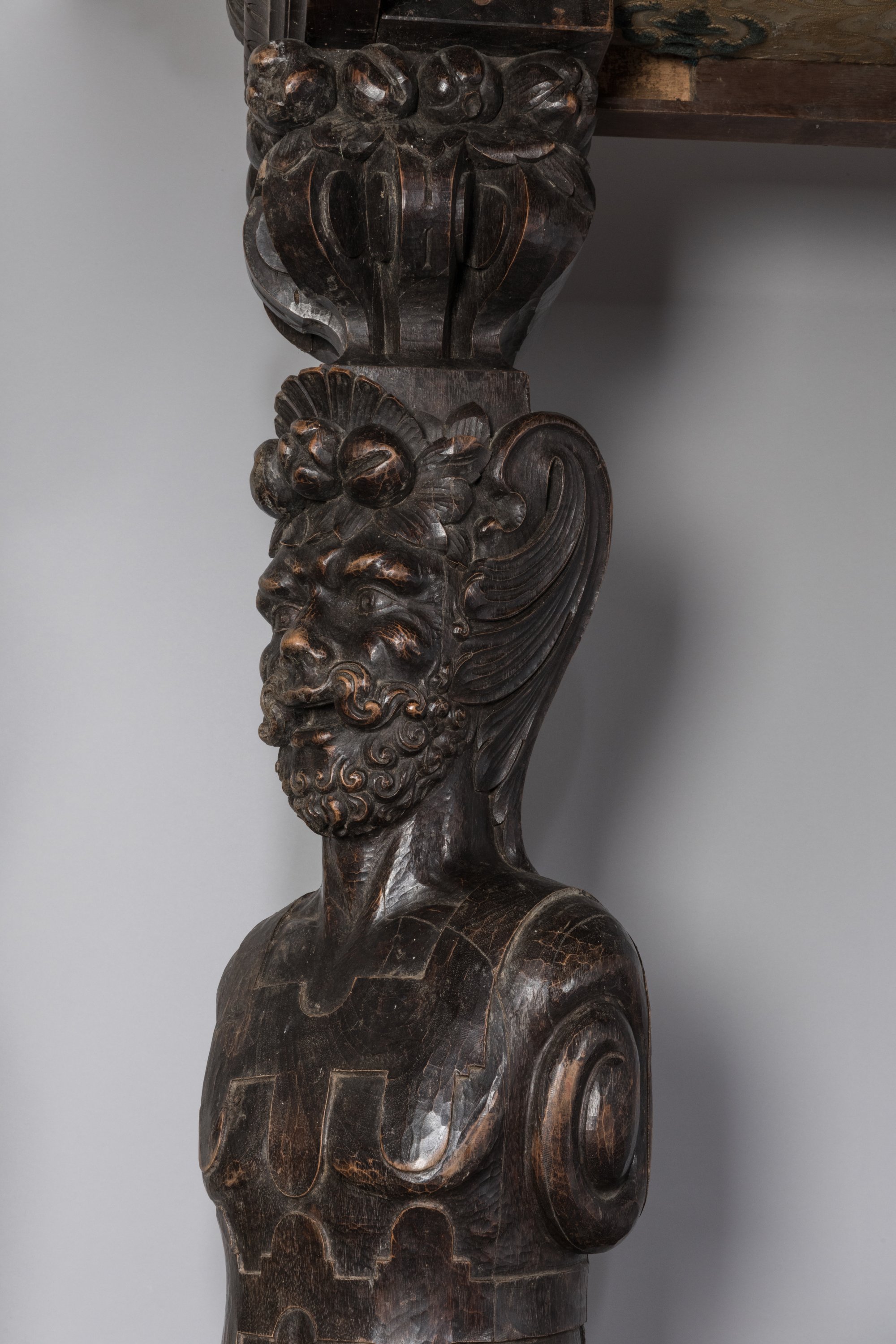 Le dossier du lit en fort relief est décoré d'un masque de femme au centre, accosté de rinceaux, de corbeilles de fruits et masques grimaçants.