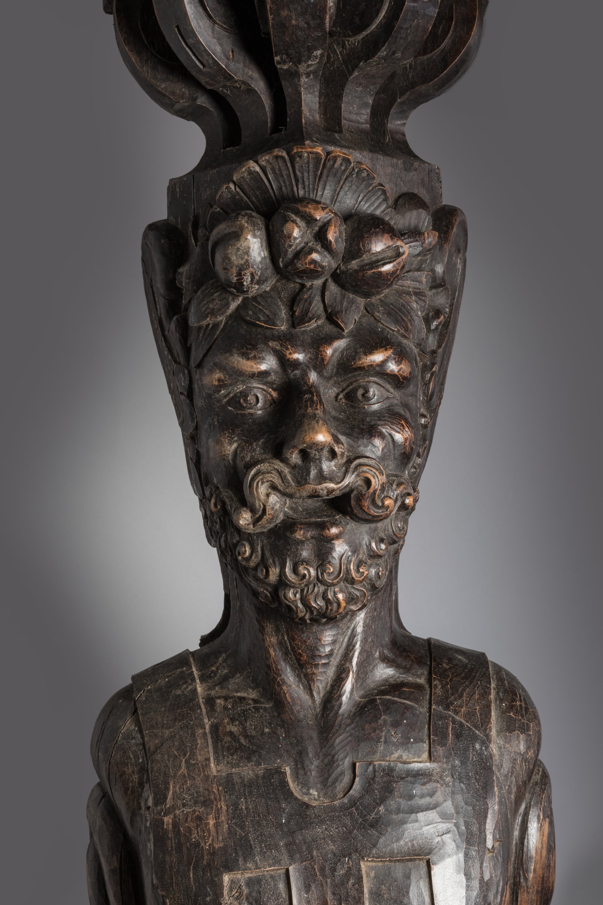 Le baldaquin est soutenu par quatre colonnes formant termes disposées deux à deux en diagonale. Les cariatides et atlantes prennent la forme de satyres et de femmes sculptés du haut du crâne jusqu'à leur bassin. Leurs oreilles en ailes de papillon participent à l'hybridation des figures. Leurs bassins sont ornés de mascarons prenant une forme féminine ou masculine en alternance du sexe de chaque terme. La base de la colonne en forme de gaine est sculptée de rinceaux et repose sur quatre pieds boules.