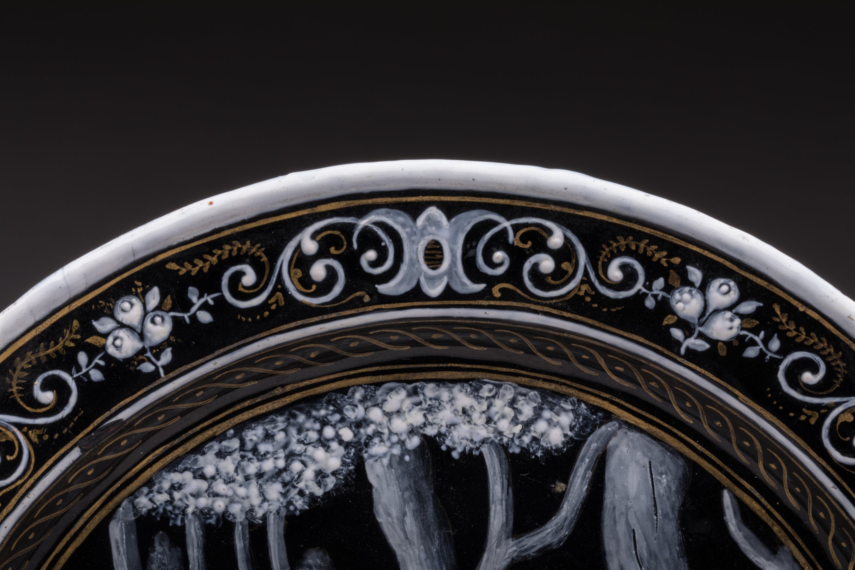 en émail peint en grisaille et doré sur fond noir représentant dans le fond une chasse à courre composée de deux cavaliers et leurs montures accompagnés de deux chiens. La descente ornée de motifs de points et vaguelettes, le marli composé d'une frise de fruits et rinceaux en grisaille. Le revers sur fond noir présente au centre un motif floral accompagné de fleurs de lys. La bordure ornée d'une branche de lierre courant sur l'ensemble.