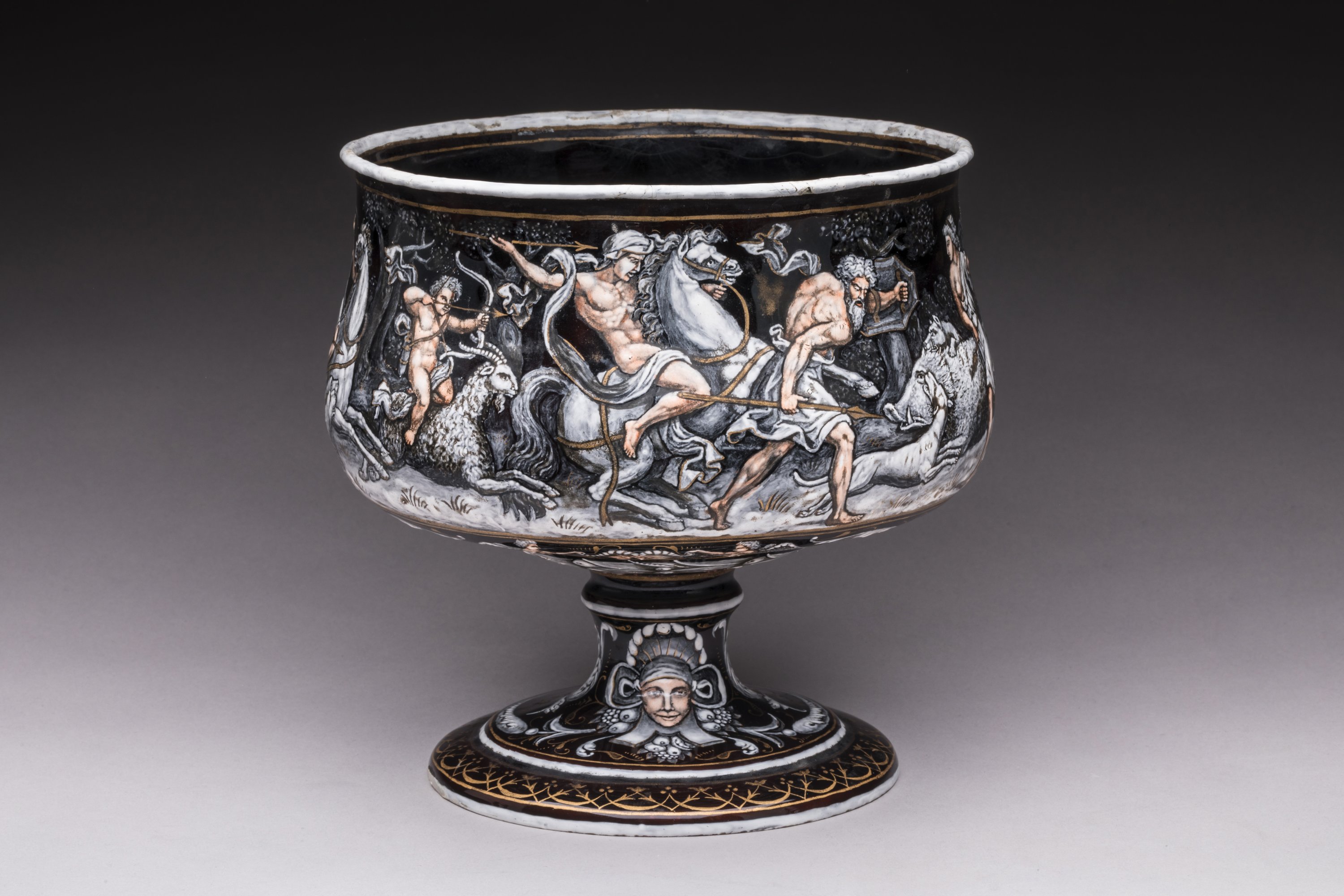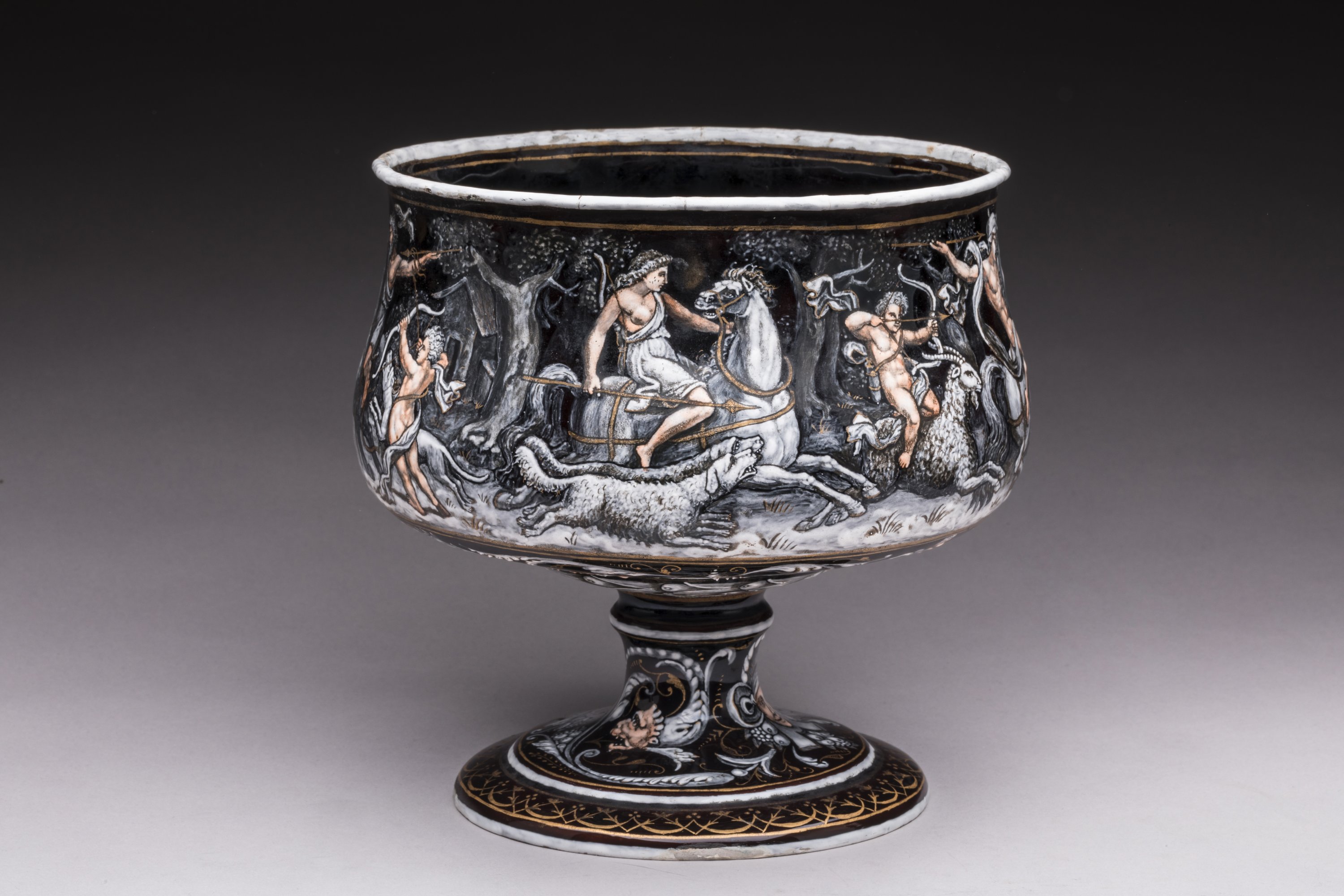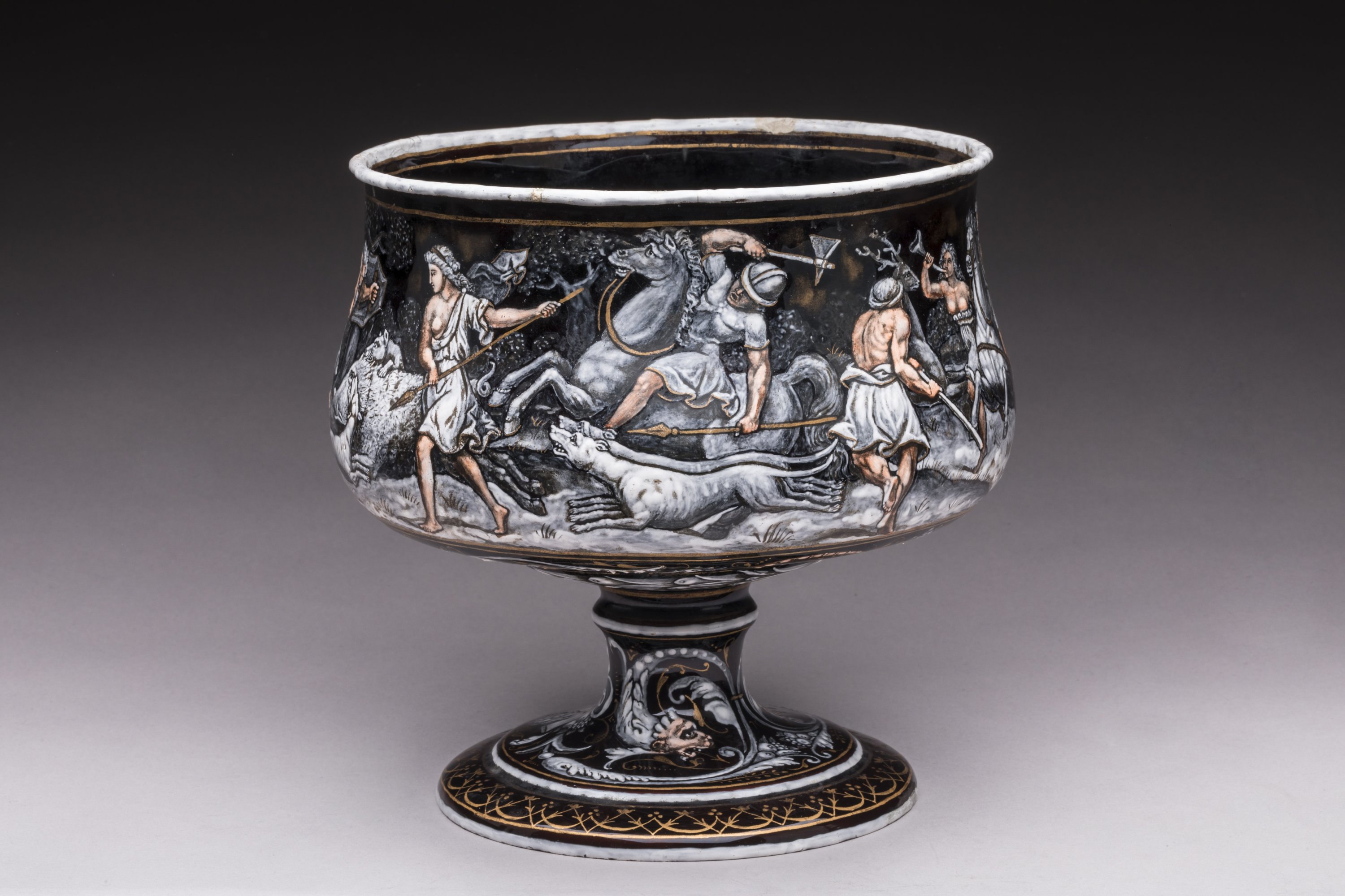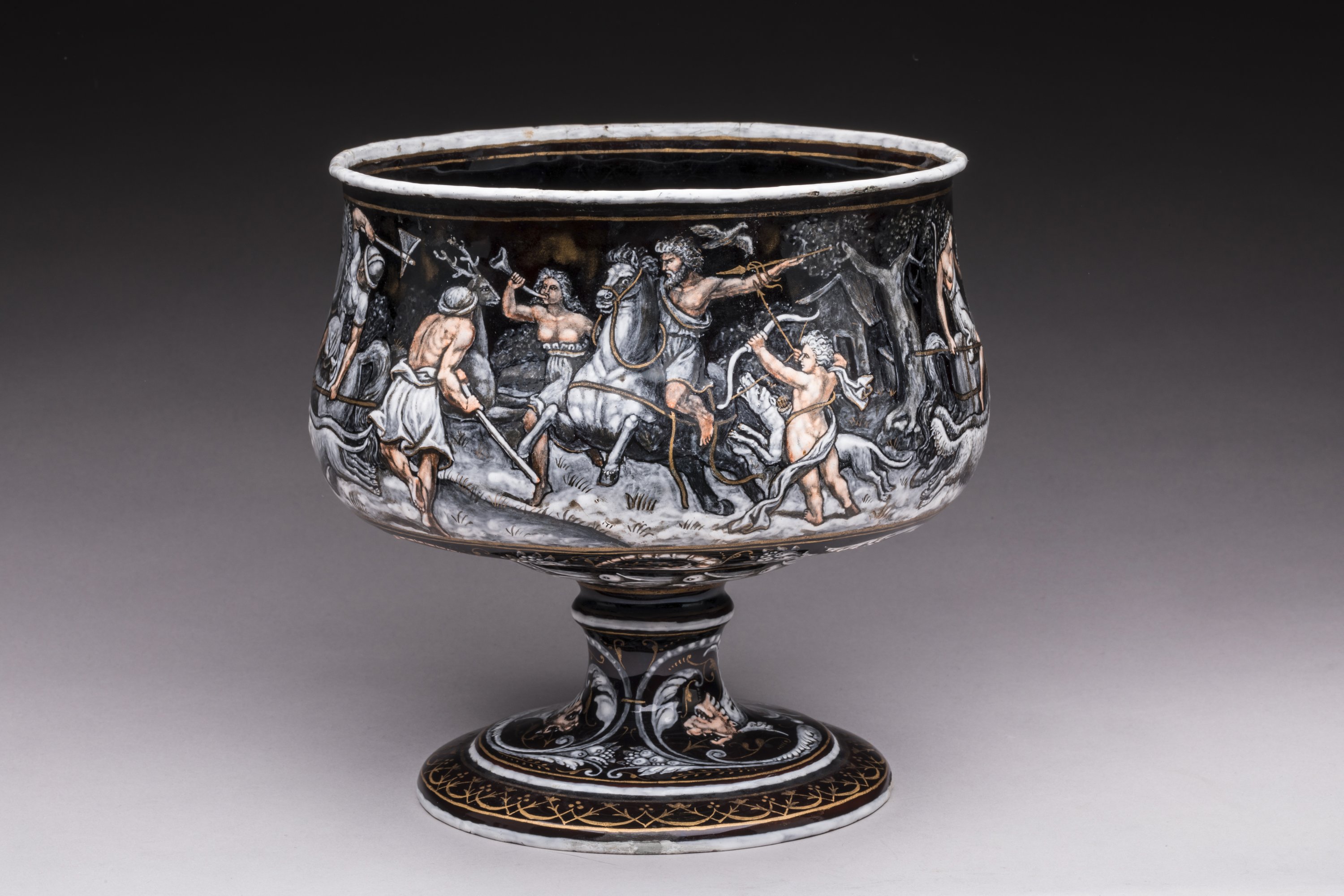 en émail peint en grisaille, les carnations roses et ornements dorés sur fond noir. La panse décorée de scènes de chasse à courre mythologiques au cerf, au sanglier et à l'oiseau composées de cavaliers et cavalières armés de lances et haches, d'un enfant arqué montant un bouc, de rabatteurs munis de piques et d'autres sonnant la trompe. À l'arrière-plan, des arbres et buissons simulant une forêt avec des maisons. Le pied orné de rinceaux, de têtes anthropomorphes sur motifs de cuir entourés de bouquets de fruits et de cornes d'abondances végétales se terminant par des têtes de lion. L'intérieur découvre un profil d'empereur romain lauré, vraisemblablement Domitien, inscrit dans un médaillon.