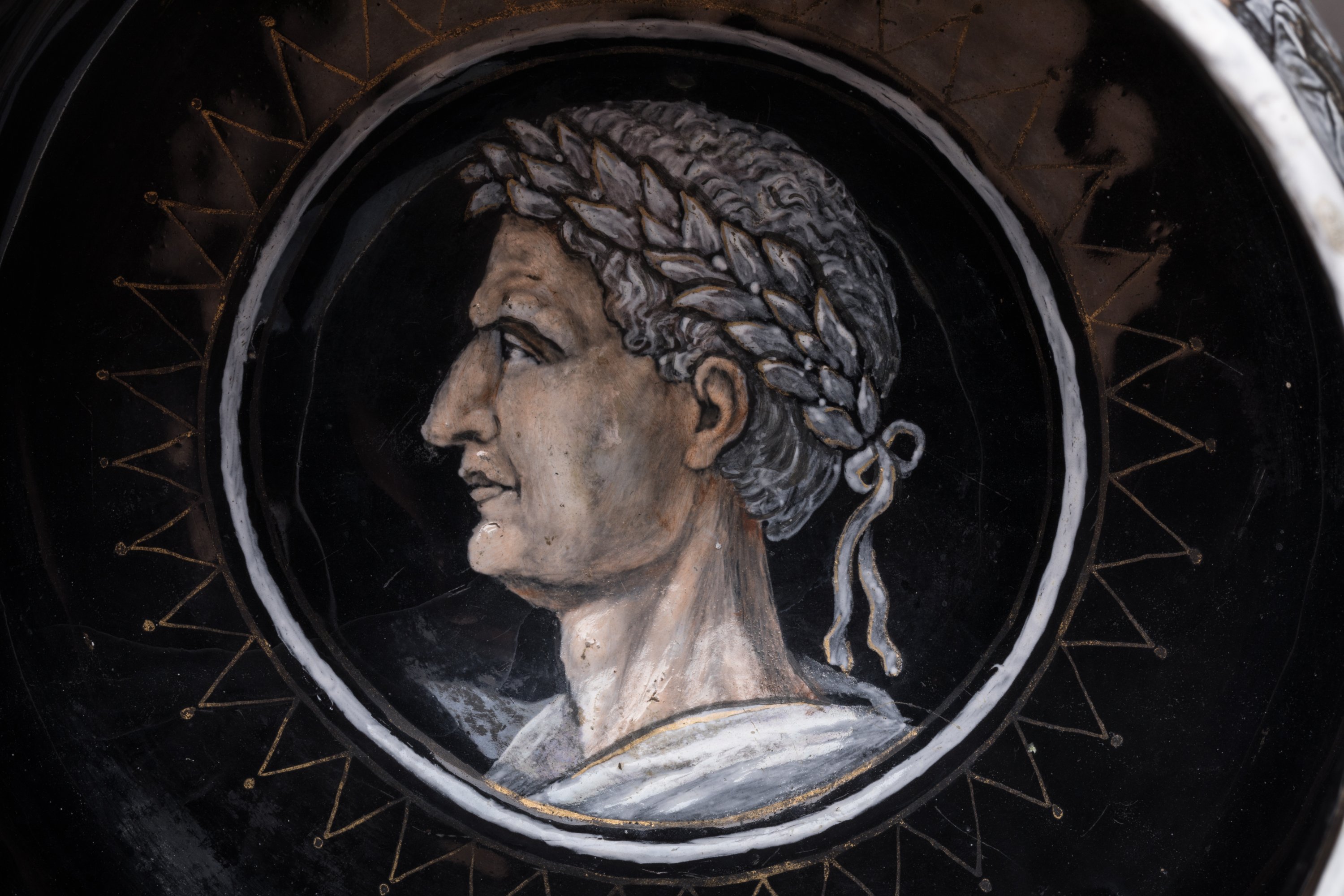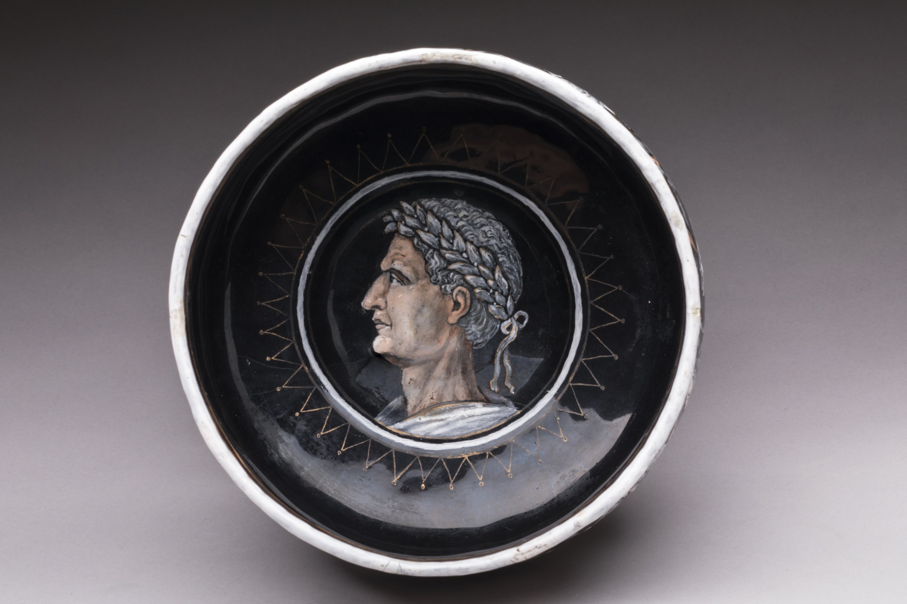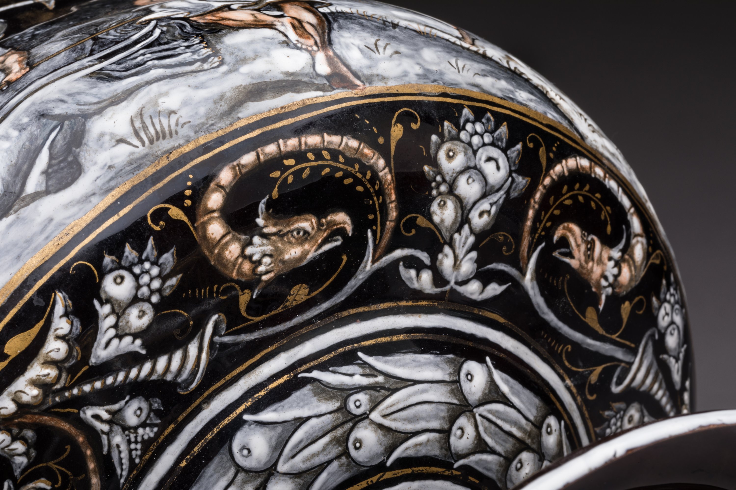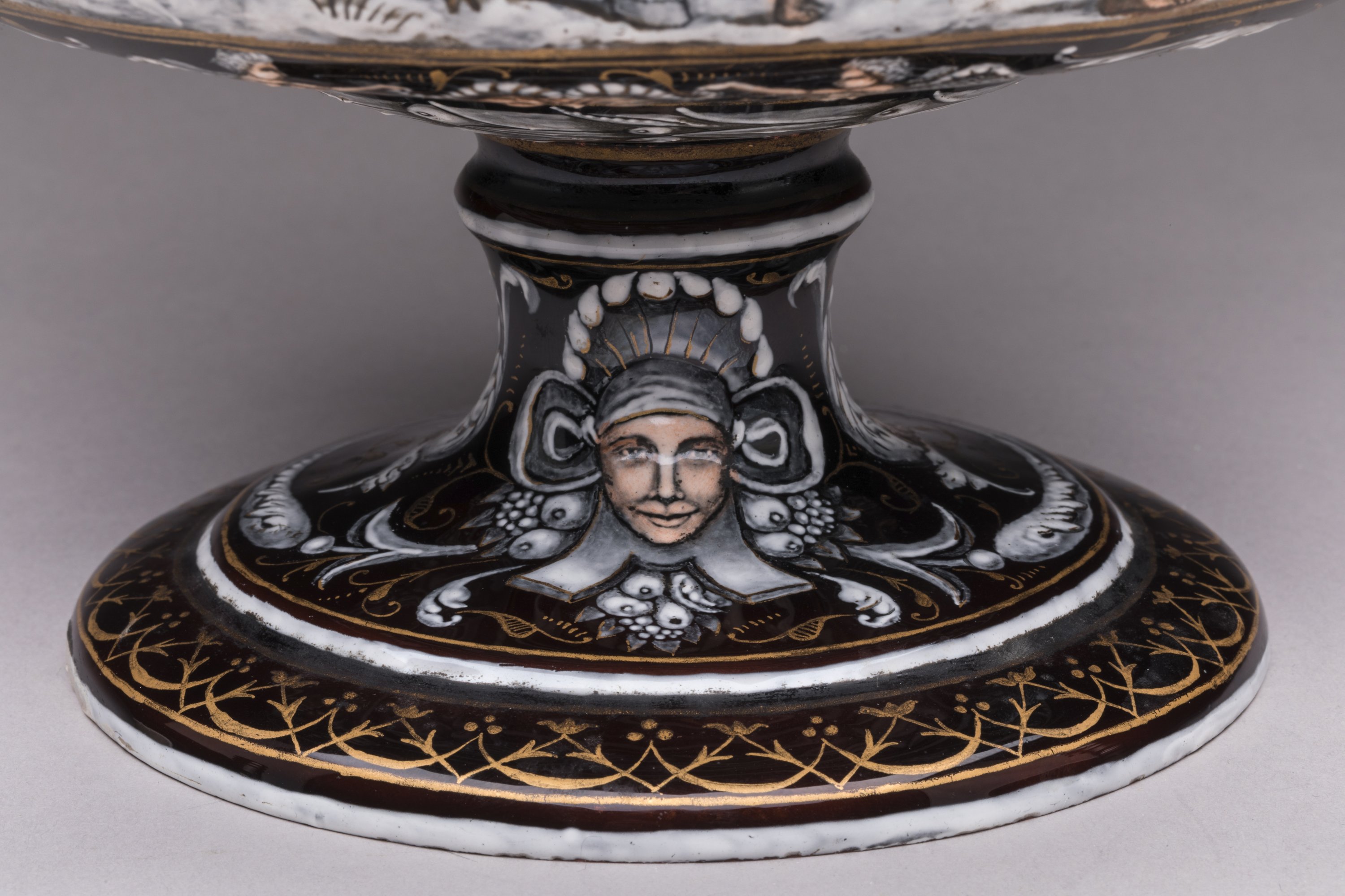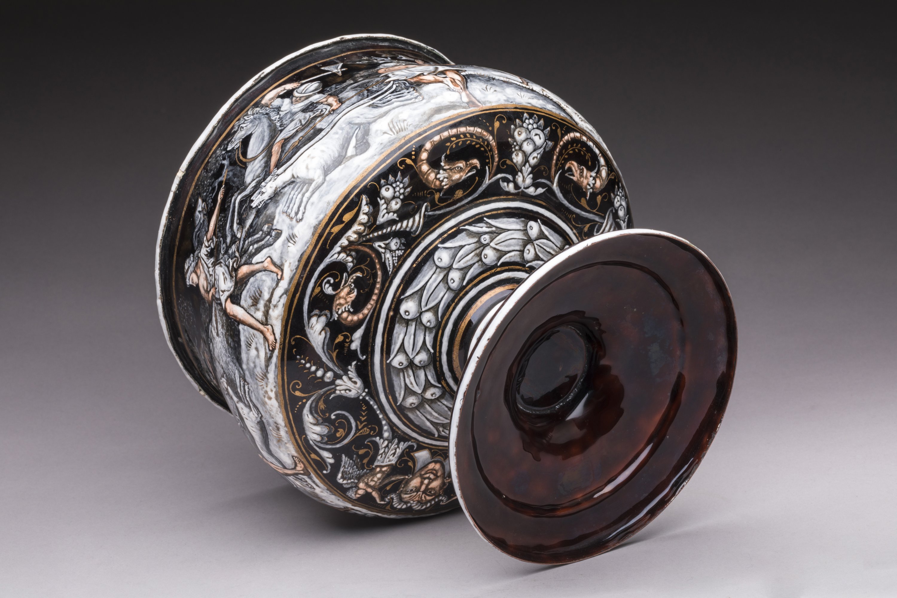 en émail peint en grisaille, les carnations roses et ornements dorés sur fond noir. La panse décorée de scènes de chasse à courre mythologiques au cerf, au sanglier et à l'oiseau composées de cavaliers et cavalières armés de lances et haches, d'un enfant arqué montant un bouc, de rabatteurs munis de piques et d'autres sonnant la trompe. À l'arrière-plan, des arbres et buissons simulant une forêt avec des maisons. Le pied orné de rinceaux, de têtes anthropomorphes sur motifs de cuir entourés de bouquets de fruits et de cornes d'abondances végétales se terminant par des têtes de lion. L'intérieur découvre un profil d'empereur romain lauré, vraisemblablement Domitien, inscrit dans un médaillon.
