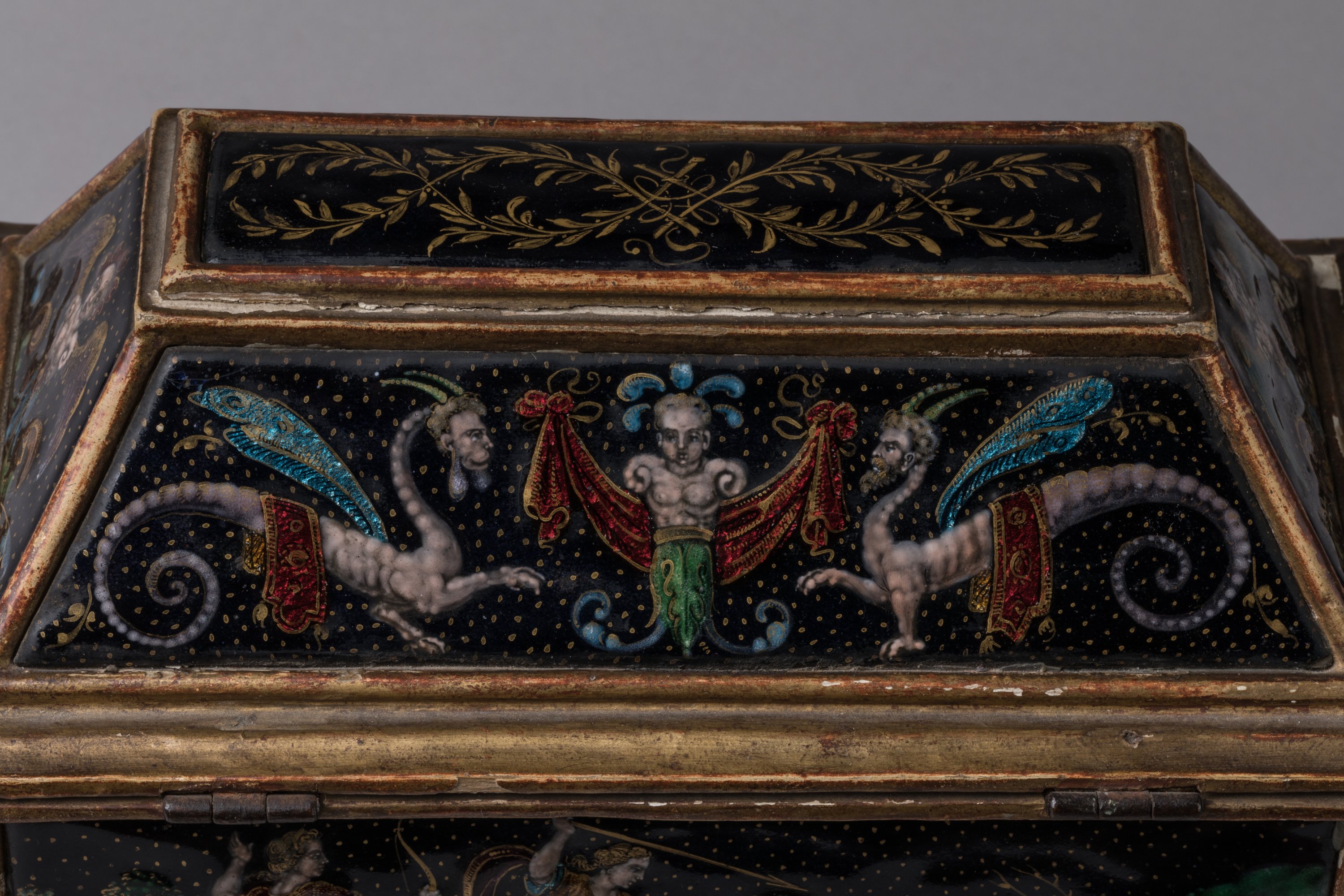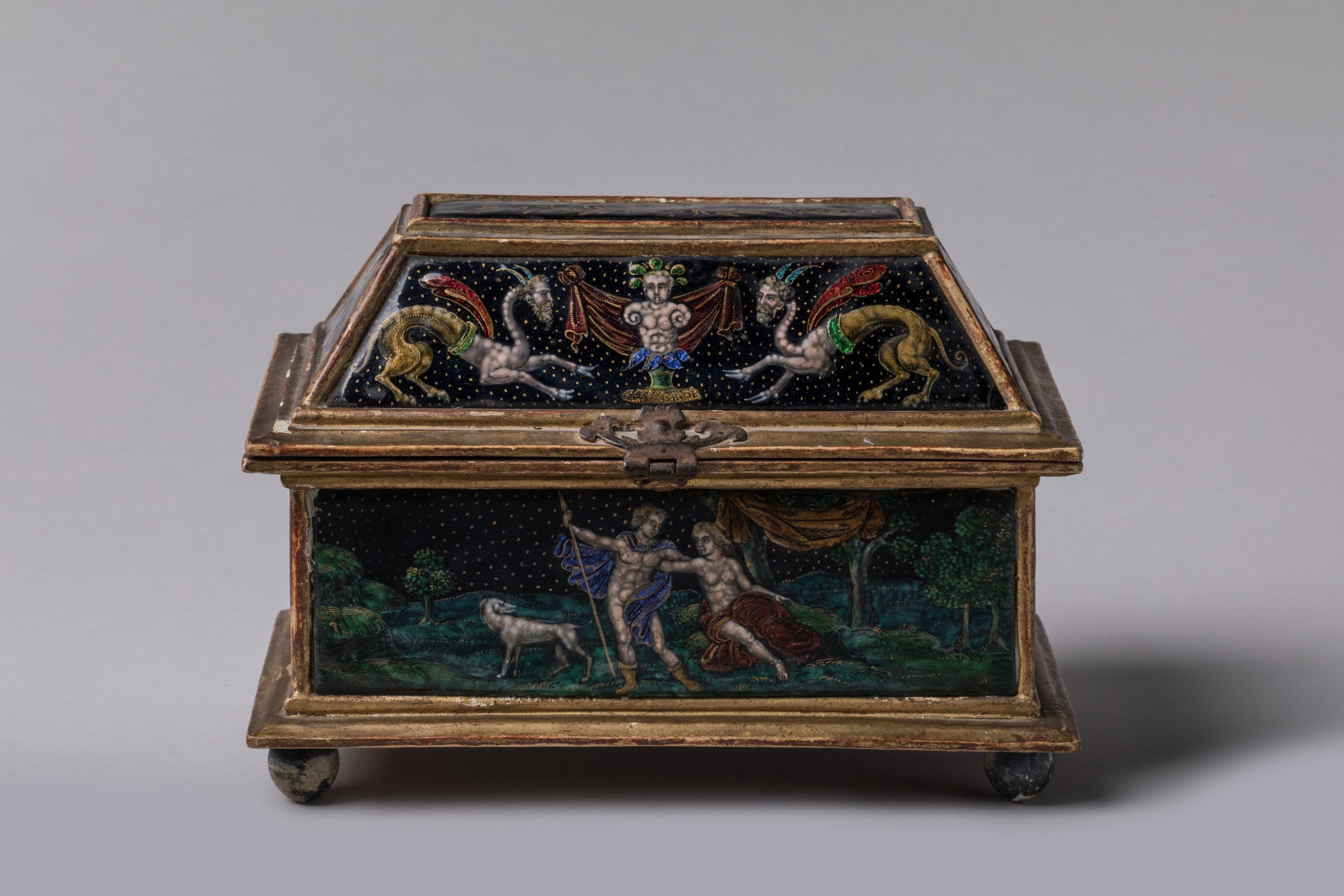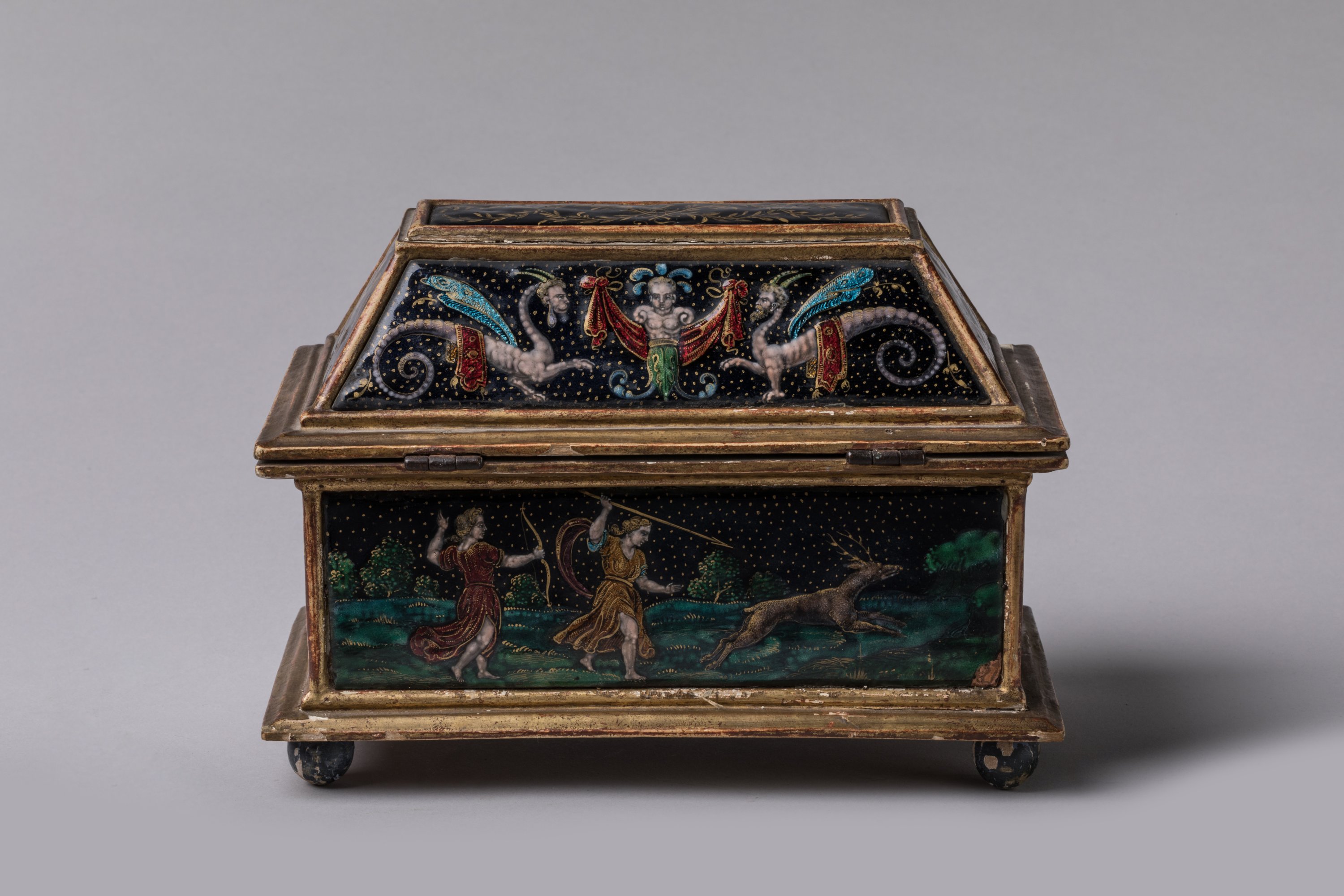 de forme rectangulaire à couvercle trapézoïdal en bois doré, reposant sur des boules peintes en noir. Orné de neuf plaques d'émaux peints polychromes sur fond bleu foncé, rehaussé d'or et de turquoise. Sur le couvercle, une plaque composée de branches de laurier affrontées surmonte quatre autres plaques. Elles présentent sur les faces antérieures et postérieures des chimères à têtes d'homme entourant un terme dont les épaules prennent la forme d'un chapiteau ionique. Sur les petits côtés, rinceaux et enroulements viennent soutenir un buste de femme ailée et couronnée à la jupe stylisée par des feuilles d'acanthe et ceint d'un motif de fleurette. La caisse présente en décors sur la face antérieure, Vénus et Adonis accompagnés d'un chien dans un paysage et sur la face postérieure, la chasse de Diane et une nymphe ; sur les petits côtés, Narcisse se mirant dans l'eau tombe amoureux de son image et Diane (?) assise chassant à l'arc des oiseaux en vol.