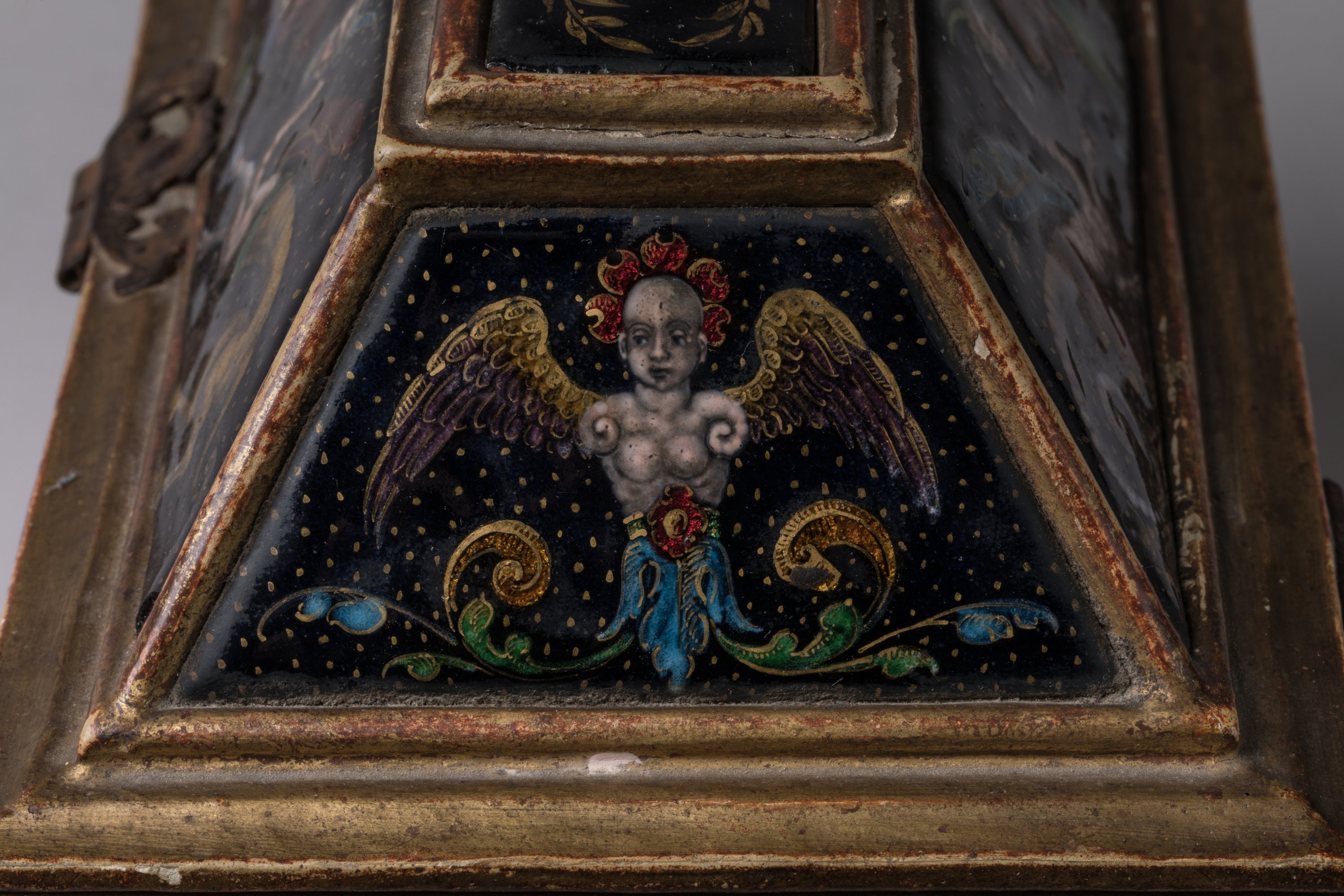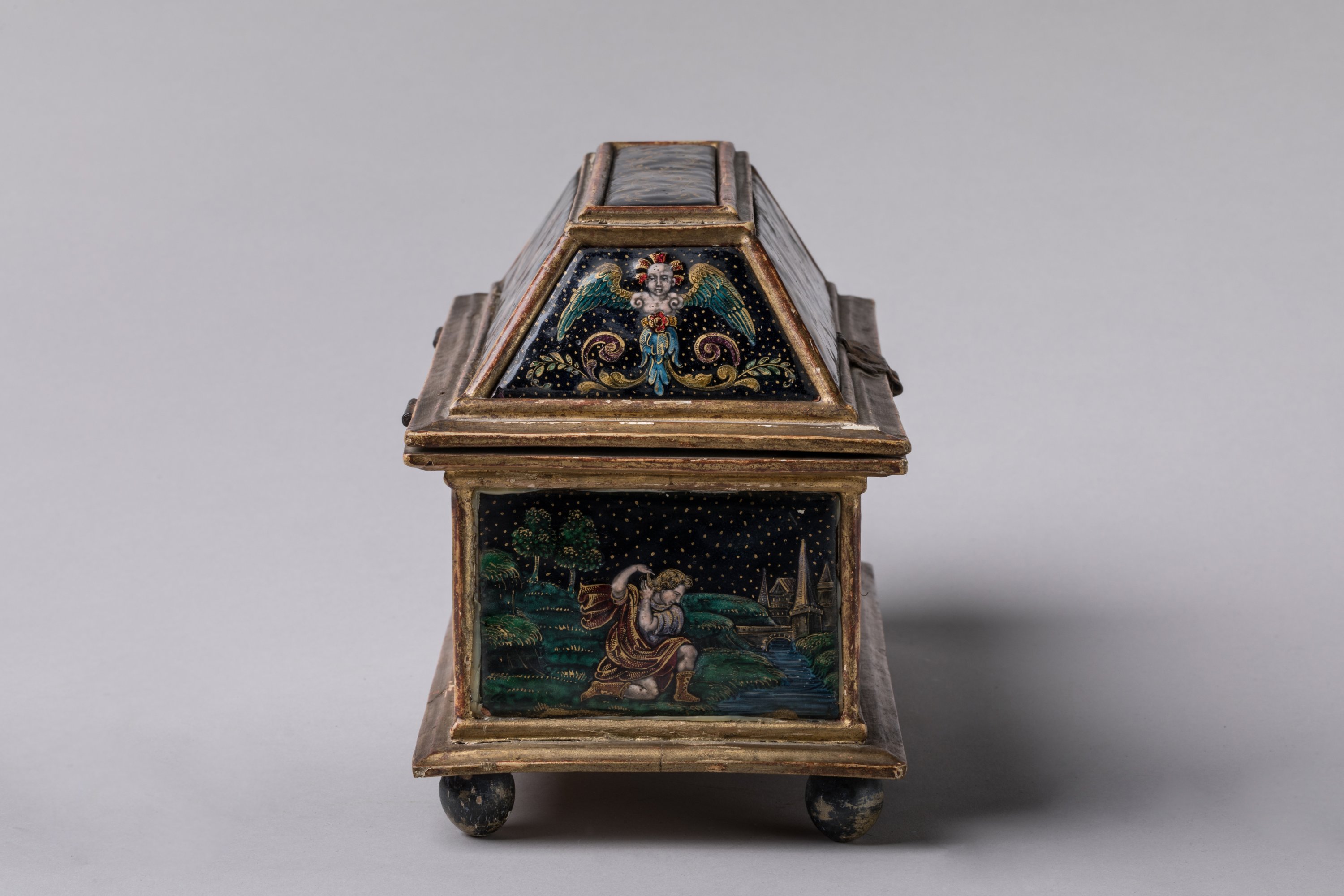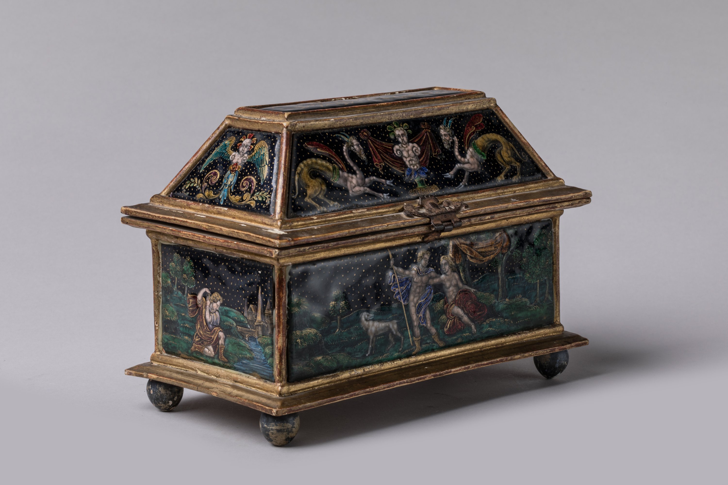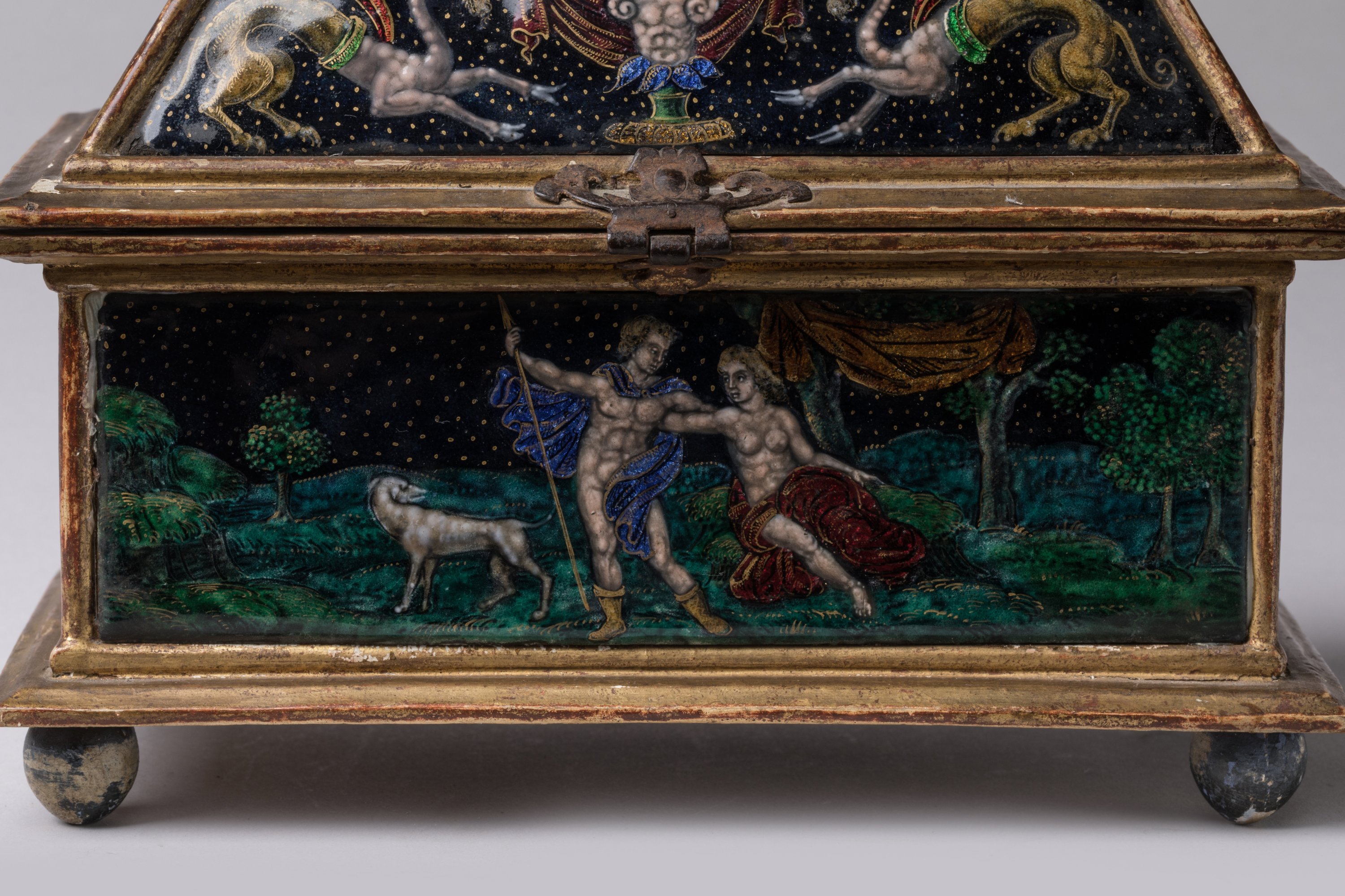 de forme rectangulaire à couvercle trapézoïdal en bois doré, reposant sur des boules peintes en noir. Orné de neuf plaques d'émaux peints polychromes sur fond bleu foncé, rehaussé d'or et de turquoise. Sur le couvercle, une plaque composée de branches de laurier affrontées surmonte quatre autres plaques. Elles présentent sur les faces antérieures et postérieures des chimères à têtes d'homme entourant un terme dont les épaules prennent la forme d'un chapiteau ionique. Sur les petits côtés, rinceaux et enroulements viennent soutenir un buste de femme ailée et couronnée à la jupe stylisée par des feuilles d'acanthe et ceint d'un motif de fleurette. La caisse présente en décors sur la face antérieure, Vénus et Adonis accompagnés d'un chien dans un paysage et sur la face postérieure, la chasse de Diane et une nymphe ; sur les petits côtés, Narcisse se mirant dans l'eau tombe amoureux de son image et Diane (?) assise chassant à l'arc des oiseaux en vol.