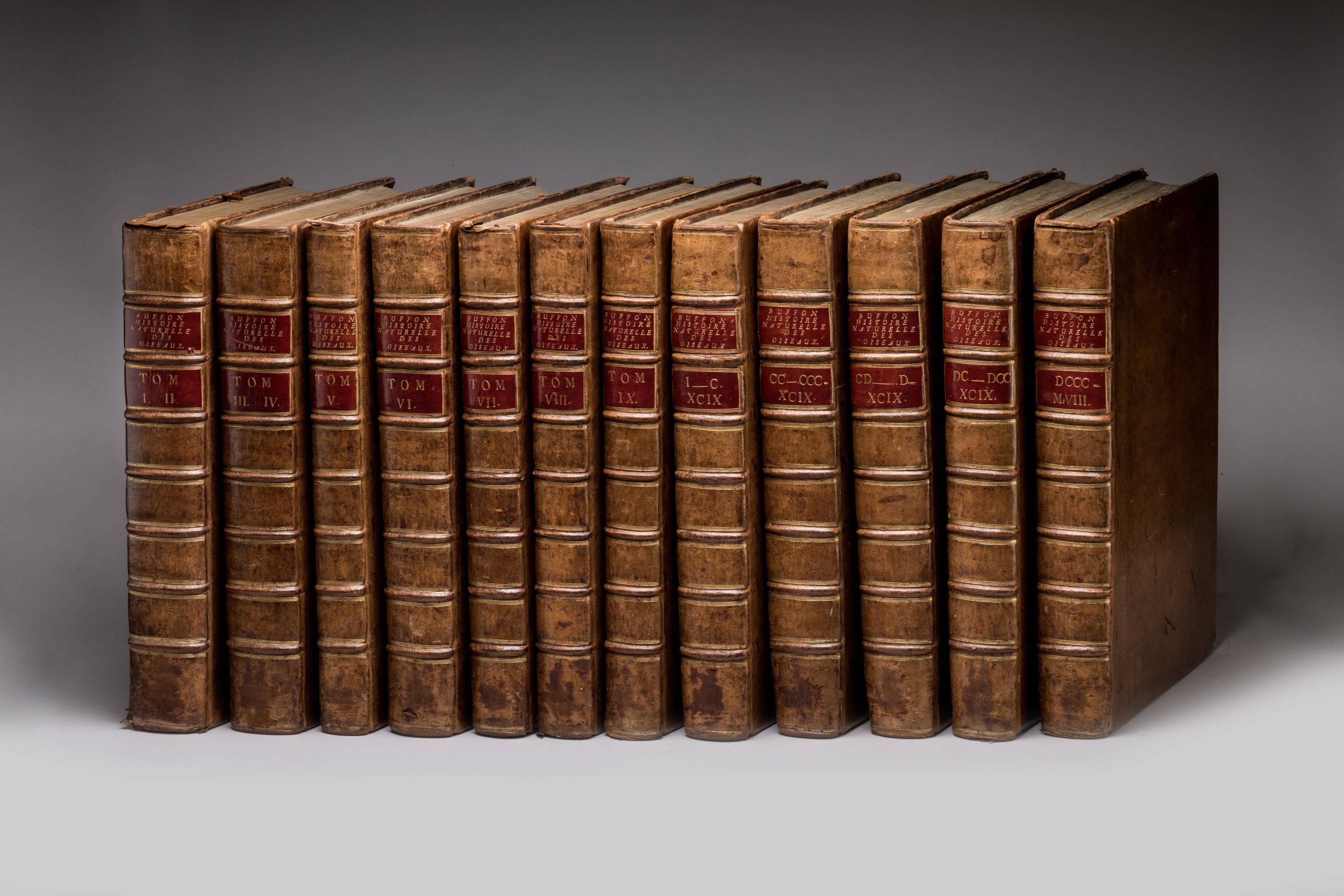 Neuf tomes (sur dix: le tome X manque) en sept volumes grand in-folio (450 x 332 mm). Plein veau fauve. Pièces de titre et de tomaison de veau cerise. Gardes de papier dominoté. Reliure du temps. Exempts de rousseurs.