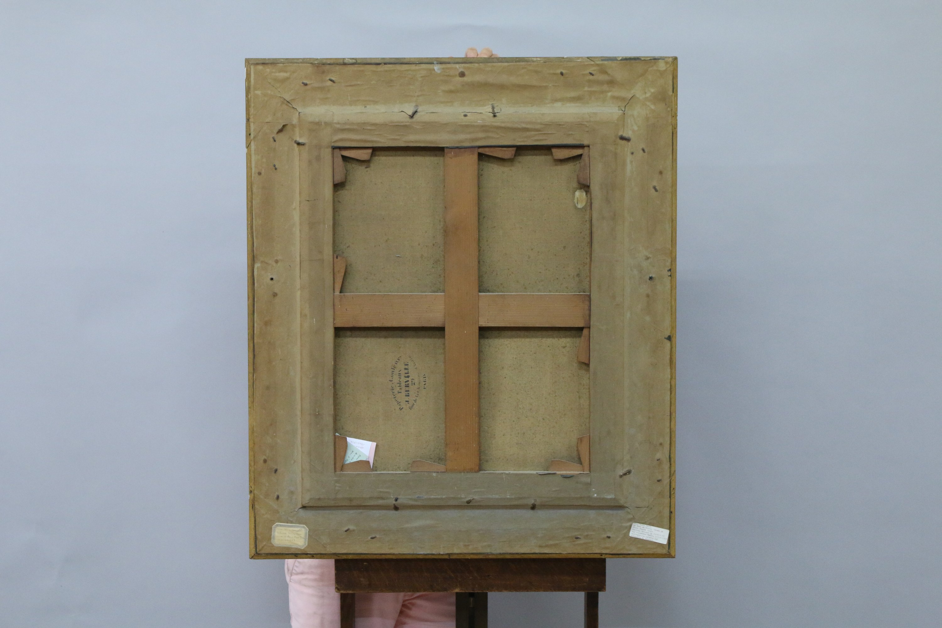 Marque de l'entoileur au dos: A.Berville, rue de La Chaussée d'Antin. Au dos plusieurs étiquettes anciennes identifiant le modèle comme: "Anne Marie Renée Leroux de Broons, épouse de Henry Pierre Gouïn".