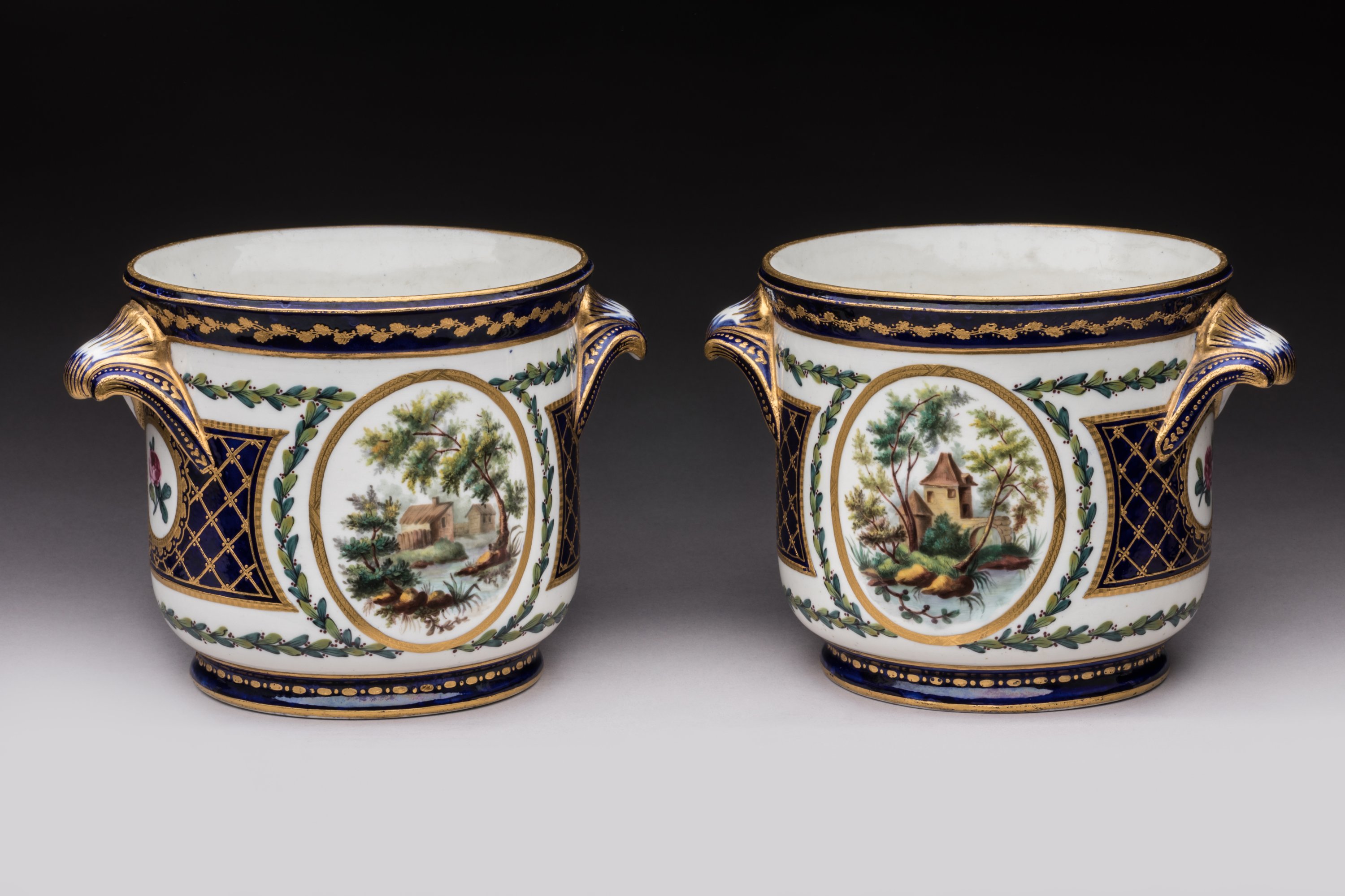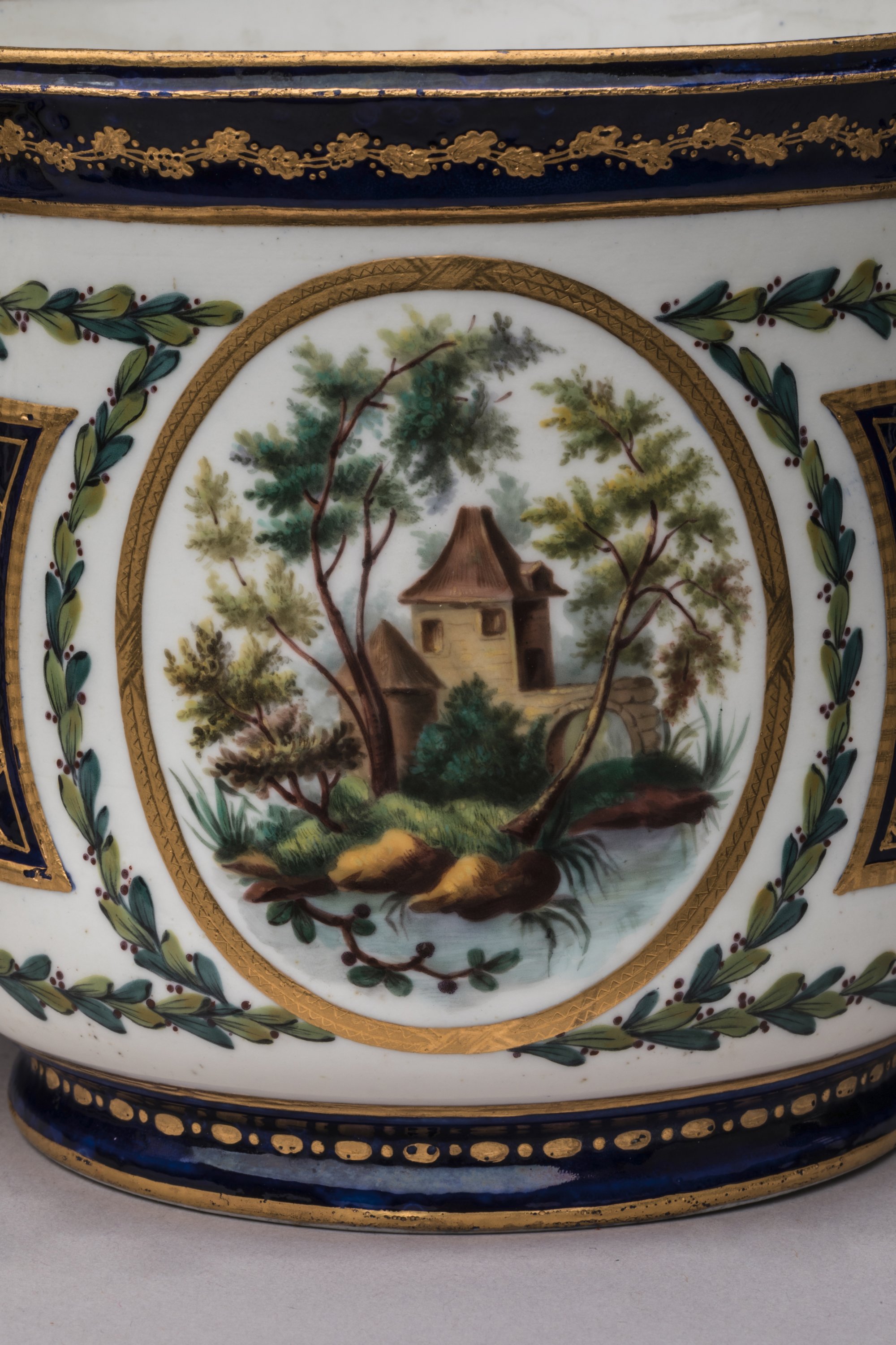 en porcelaine tendre à décor polychrome et or, sur chaque face de cartouches ornés de paysages champêtres cernés d'un épais filet or, d'une large guirlande de feuilles de laurier et jetés de rose, croisillons or sur fond bleu, filets et peignés or sur les prises et les bords.
