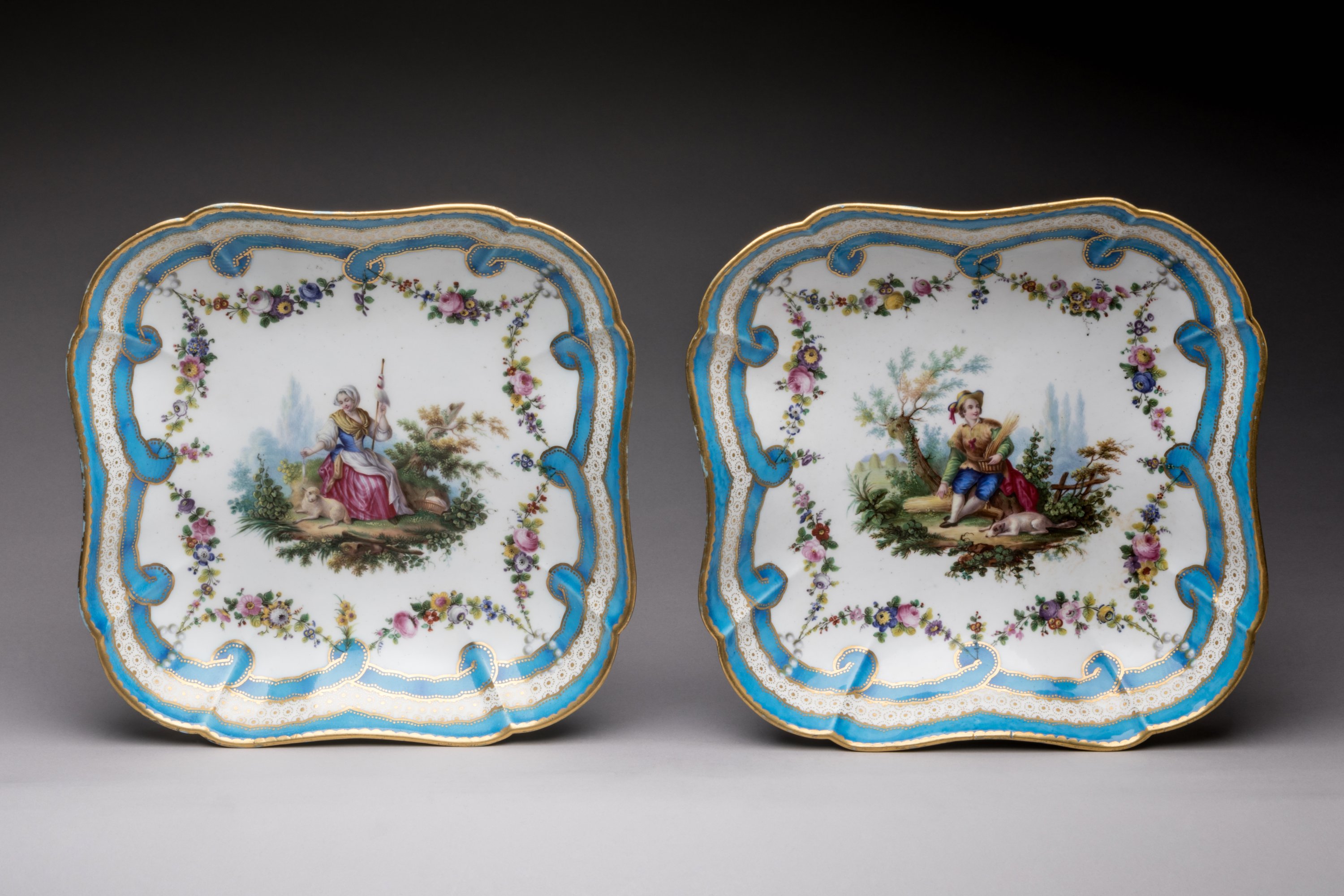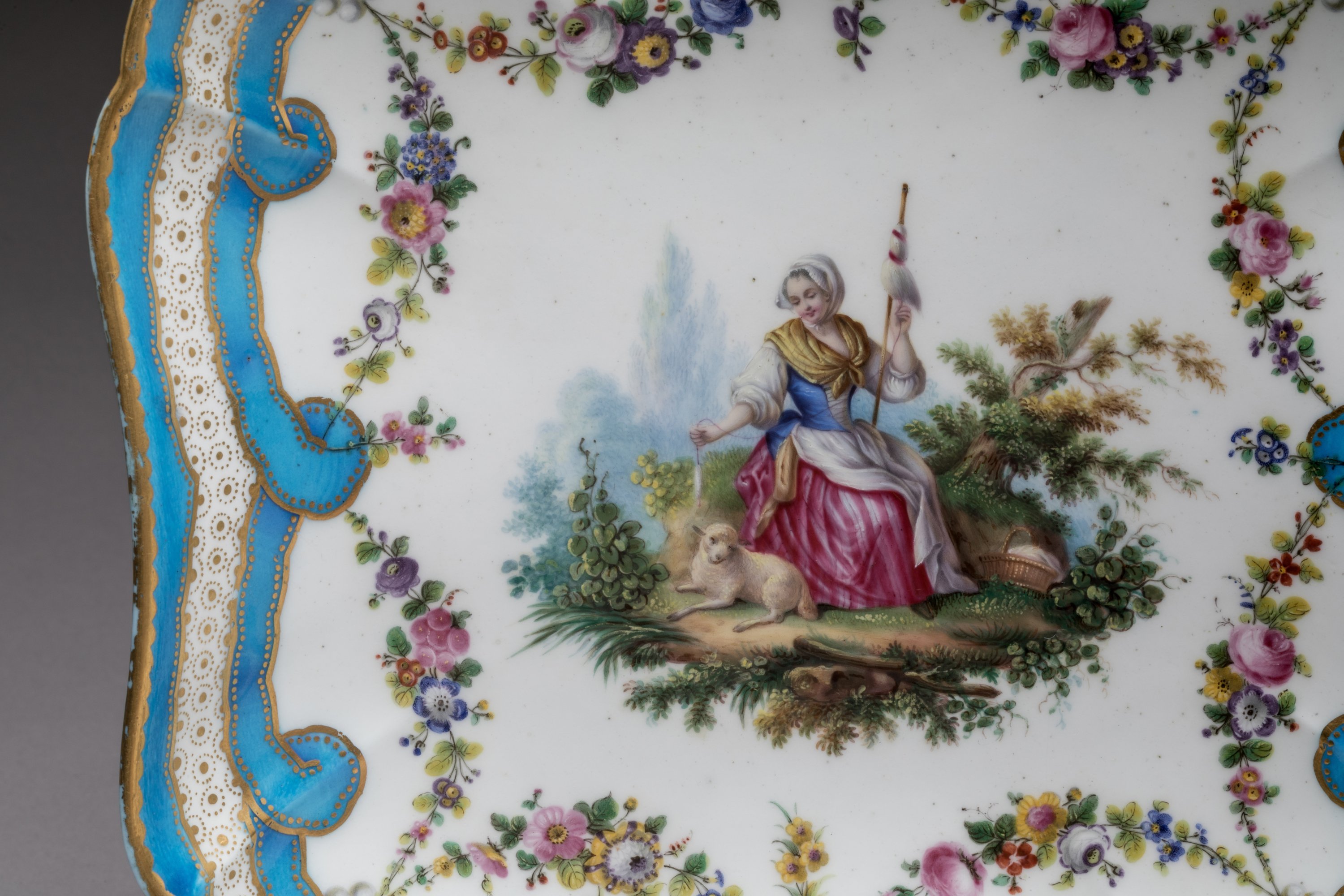 en porcelaine tendre à décor polychrome et or au centre de scènes champêtres figurant un jeune moissonneur assis à côté d'un chien et une jeune fileuse assise à côté de son agneau, sur les bords de guirlandes fleuries accrochées à des rubans bleu céleste cernés de filets or alternant avec une bande décorée d'œil de perdrix or. Montures en bronze doré du XIXe siècle.