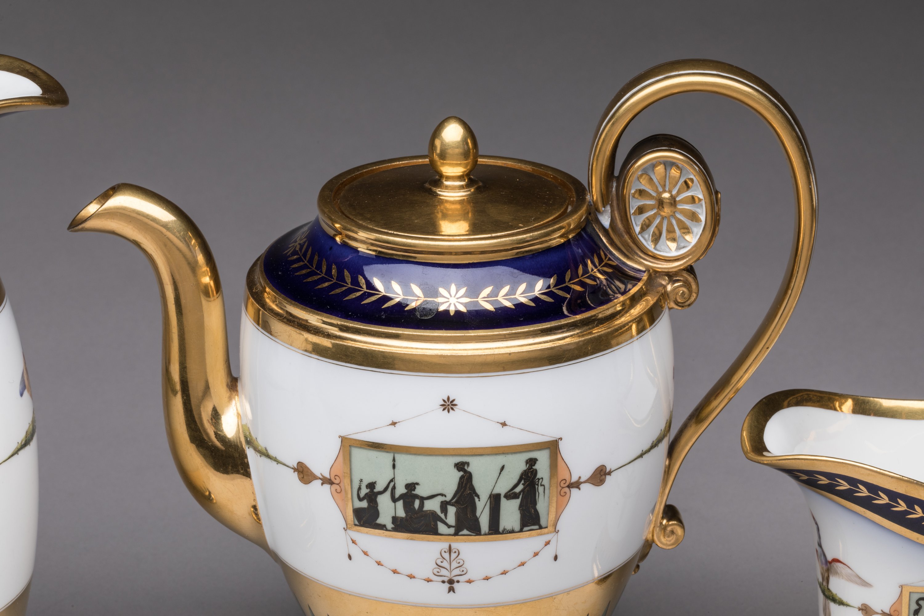 en porcelaine dure composé de dix-sept pièces comprenant: un pot à sucre " à pied anse volute ", une théière " Asselin ", une jatte à fruits " hémisphérique ", un pot à lait dit " pot à crème à cornet ", une cafetière, douze tasses " litrons " et leurs soucoupes, décor polychrome et or de cartouches rectangulaires cernés de guirlandes or et ornés de scènes figurées à l'antique de style pompéien, reliés par des guirlandes fleuries sur lesquelles des oiseaux sont perchés.