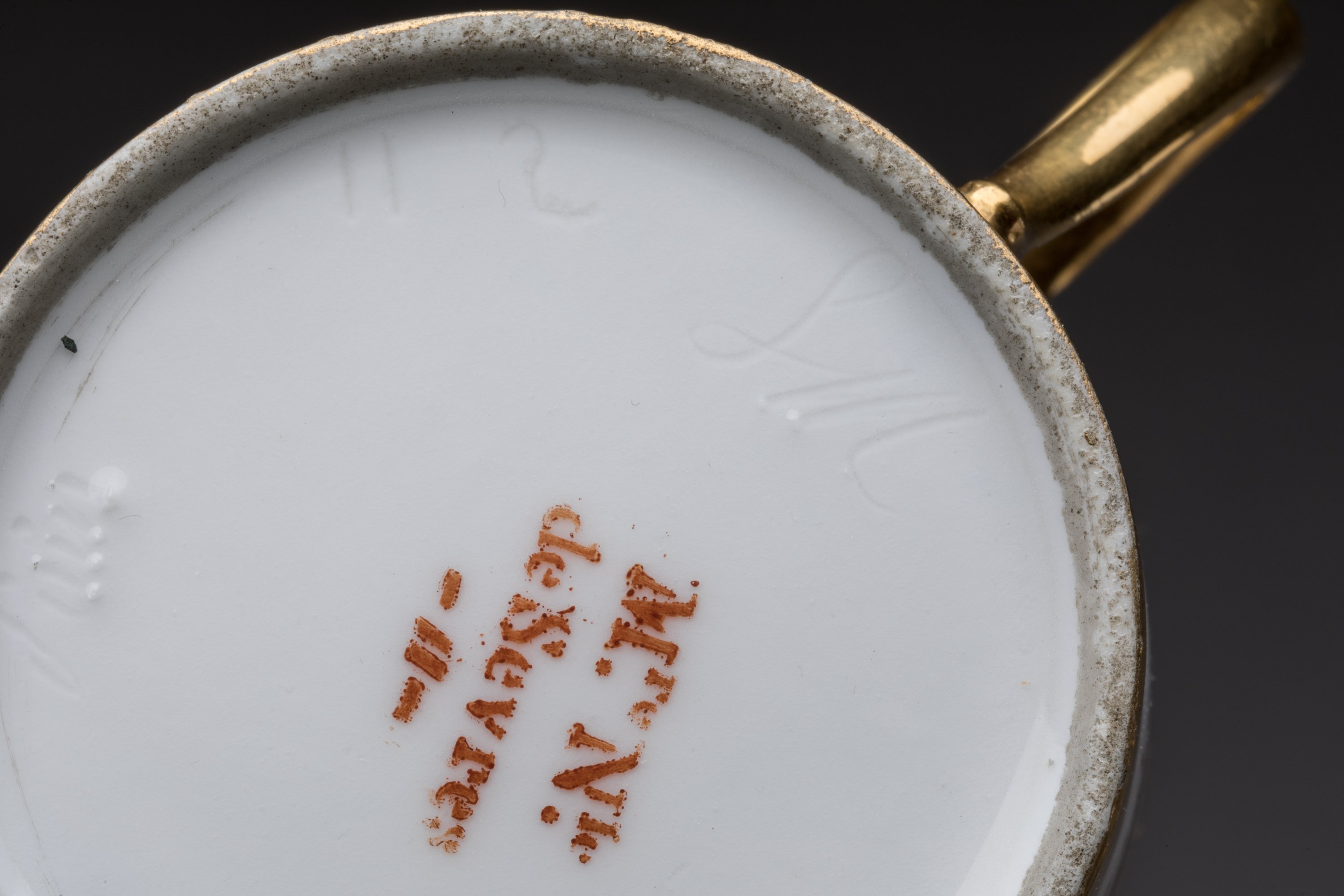 Les pièces de forme sont ornées de quatre cartouches, les tasses sont ornées de deux cartouches, tous étant différents.