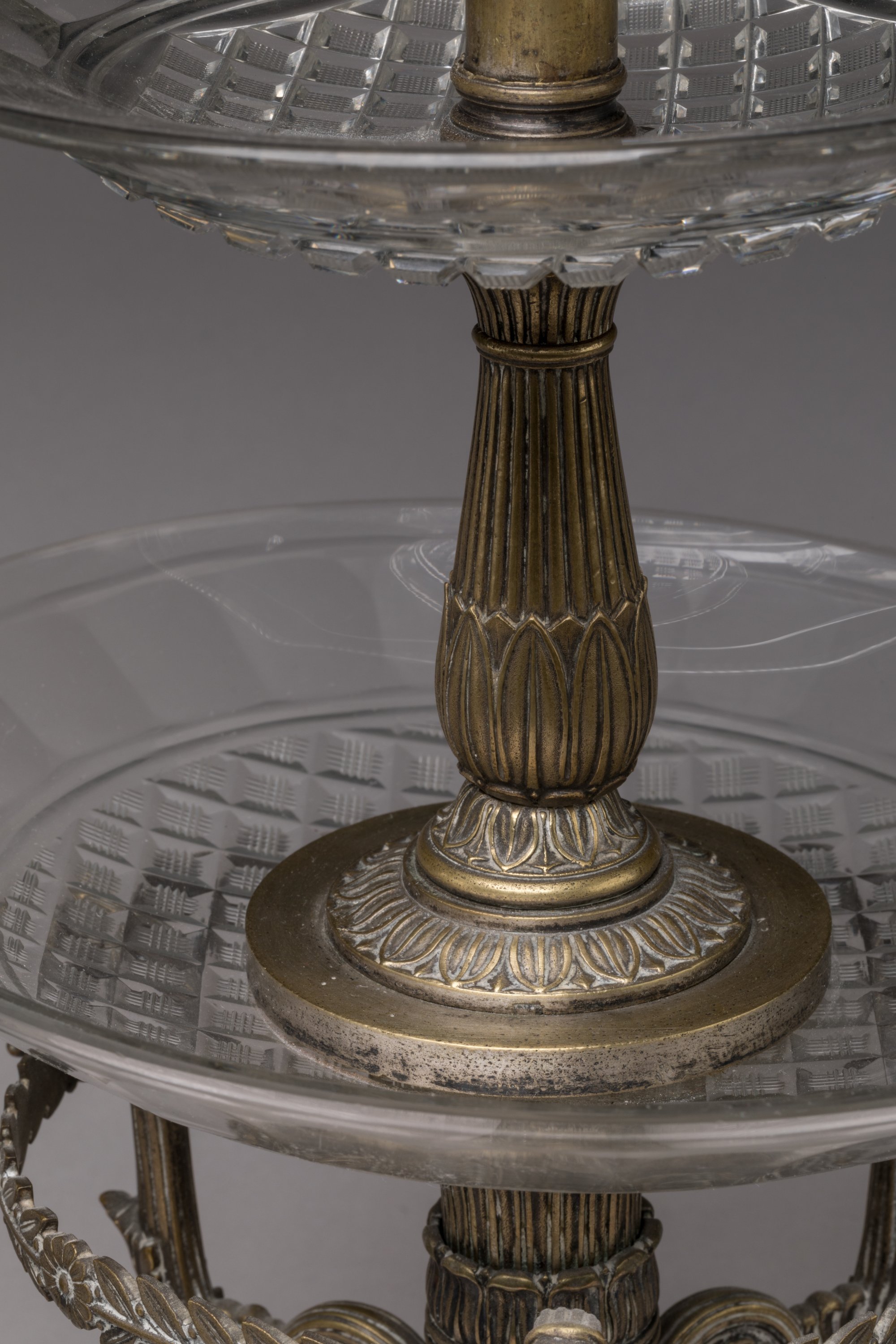 en bronze anciennement doré, à trois plateaux de cristal. La prise annulaire moulurée repose sur des feuilles d'acanthe se terminant en volute. Le fût balustre orné de bagues, cannelures et motifs de feuilles d'eau. La base tripode est parée de trois consoles en arabesque ornées de feuilles d'acanthe, réunies chacune par une guirlande de feuilles de laurier. Les plateaux en cristal sont gravés de motifs losangés.