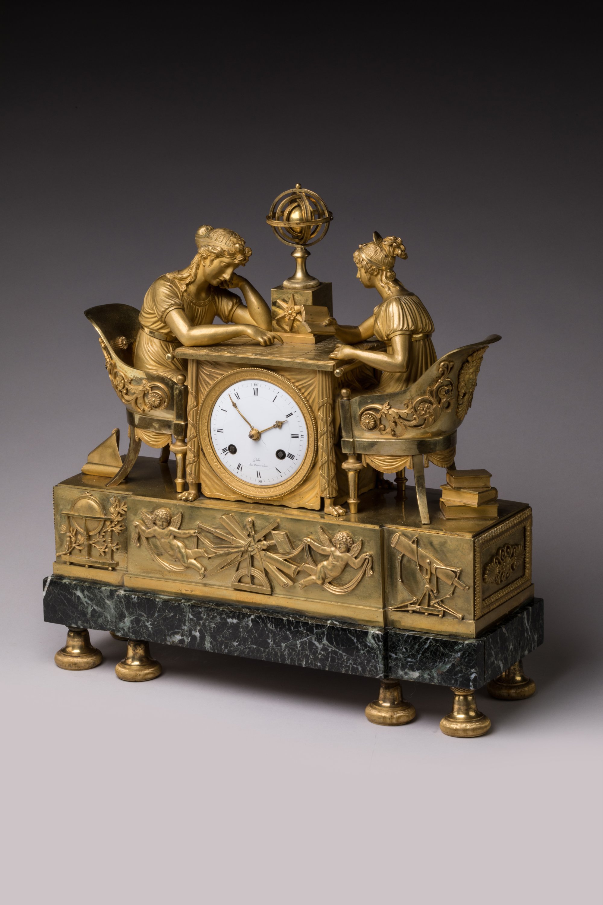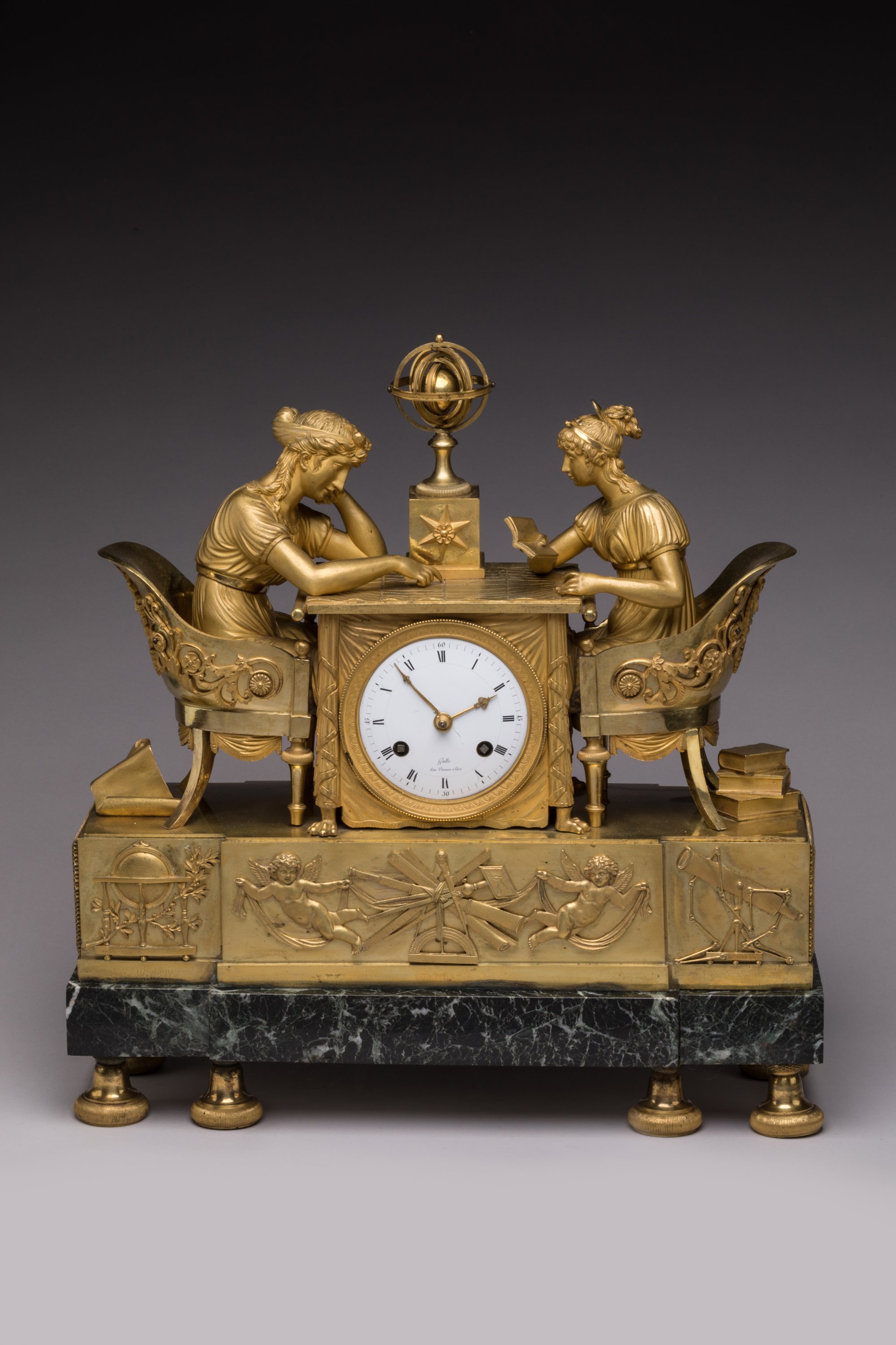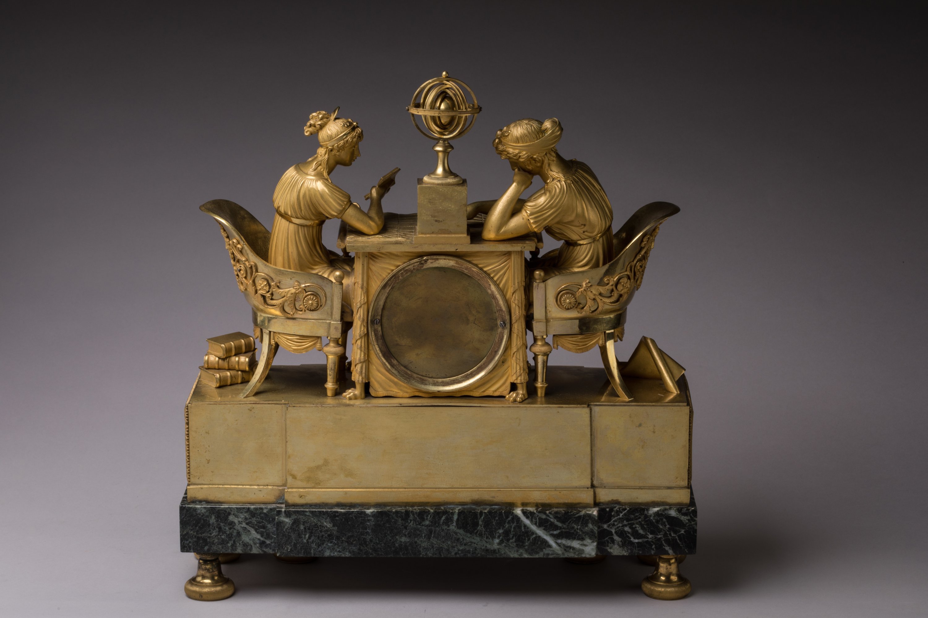en bronze doré, figurant deux femmes assises dans le goût de l'Antique, étudiant à l'ombre d'une sphère armillaire au socle étoilé posé sur une table dans laquelle est enchâssée un cadran émaillé, avec les heures en chiffres romains et graduée pour les minutes. Entre les pieds sabres des fauteuils gondoles, reposent des livres et parchemins. La base en bronze doré est ornée de bas-reliefs figurant des putti tenant des trophées astronomiques encadrés par une longue-vue et un globe terrestre. La base en marbre vert repose sur six pieds toupies.