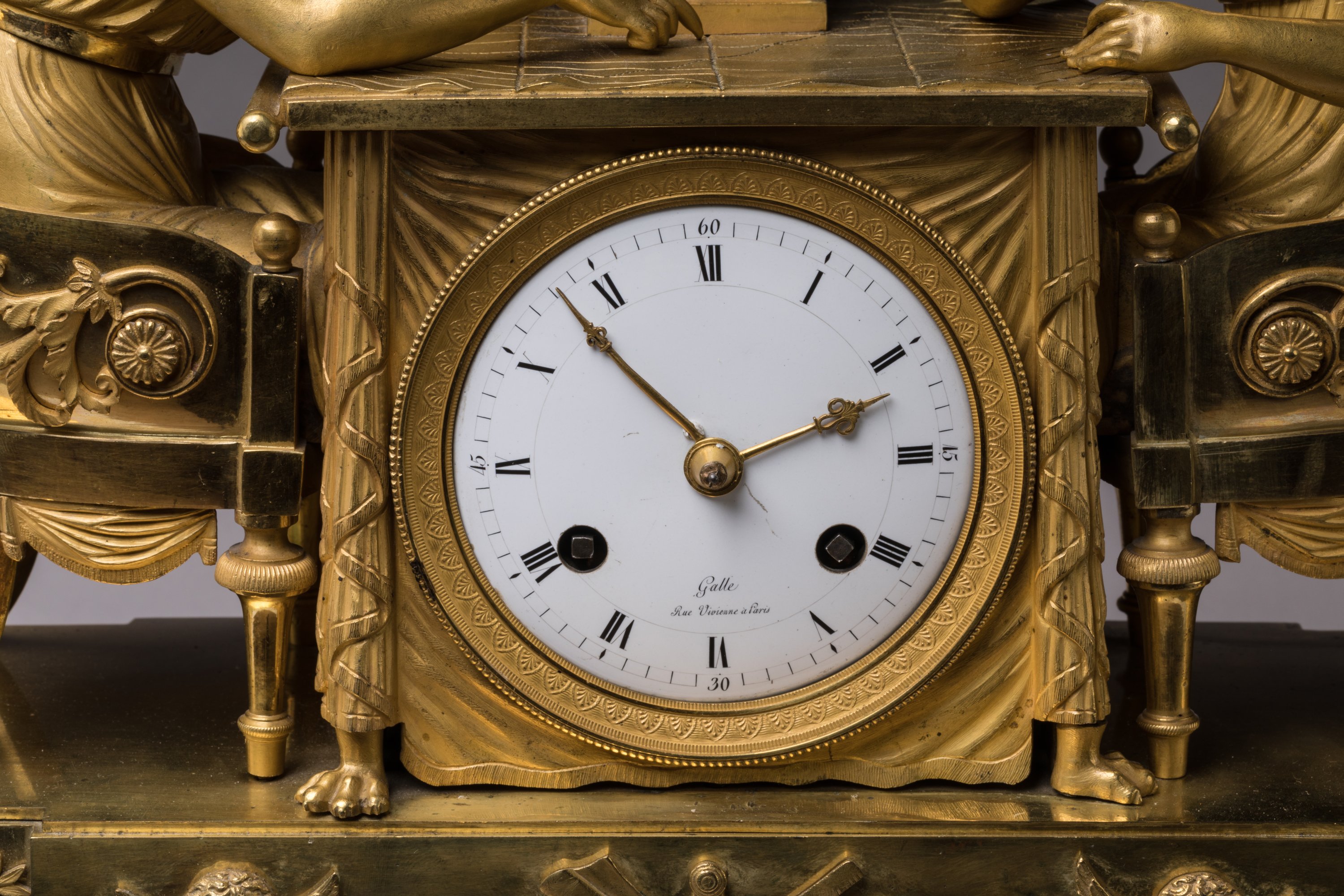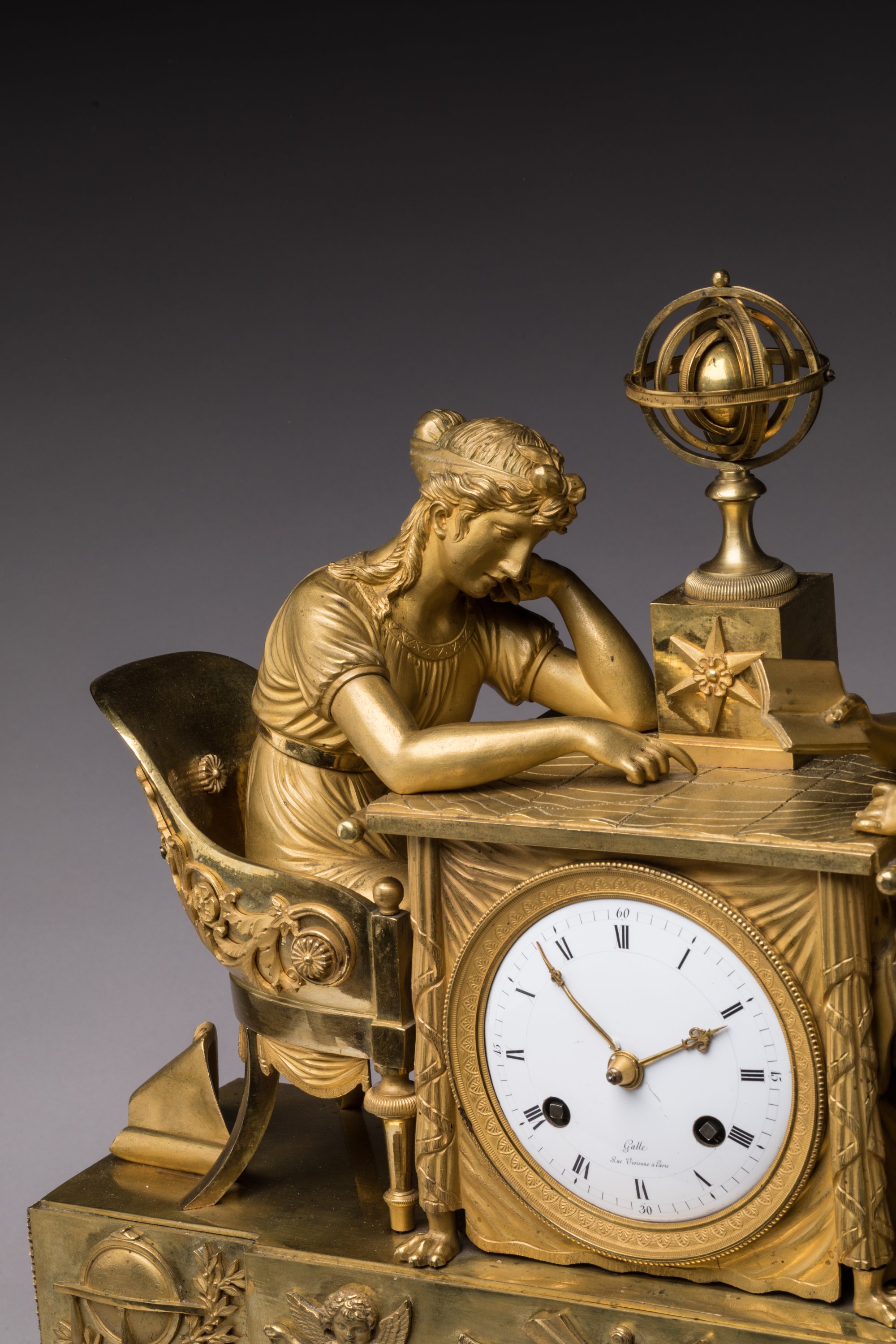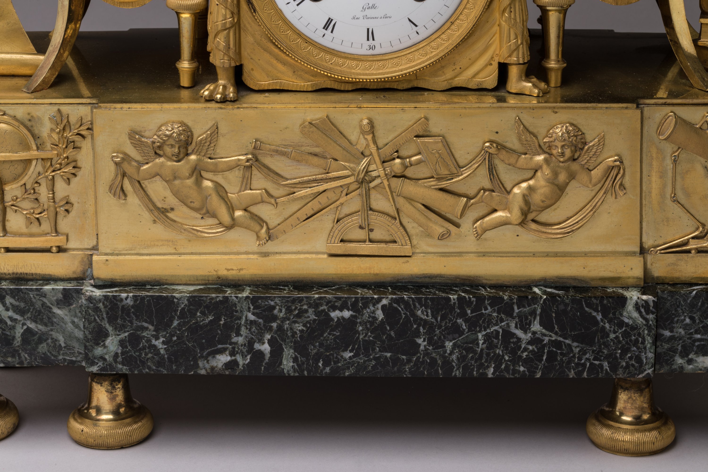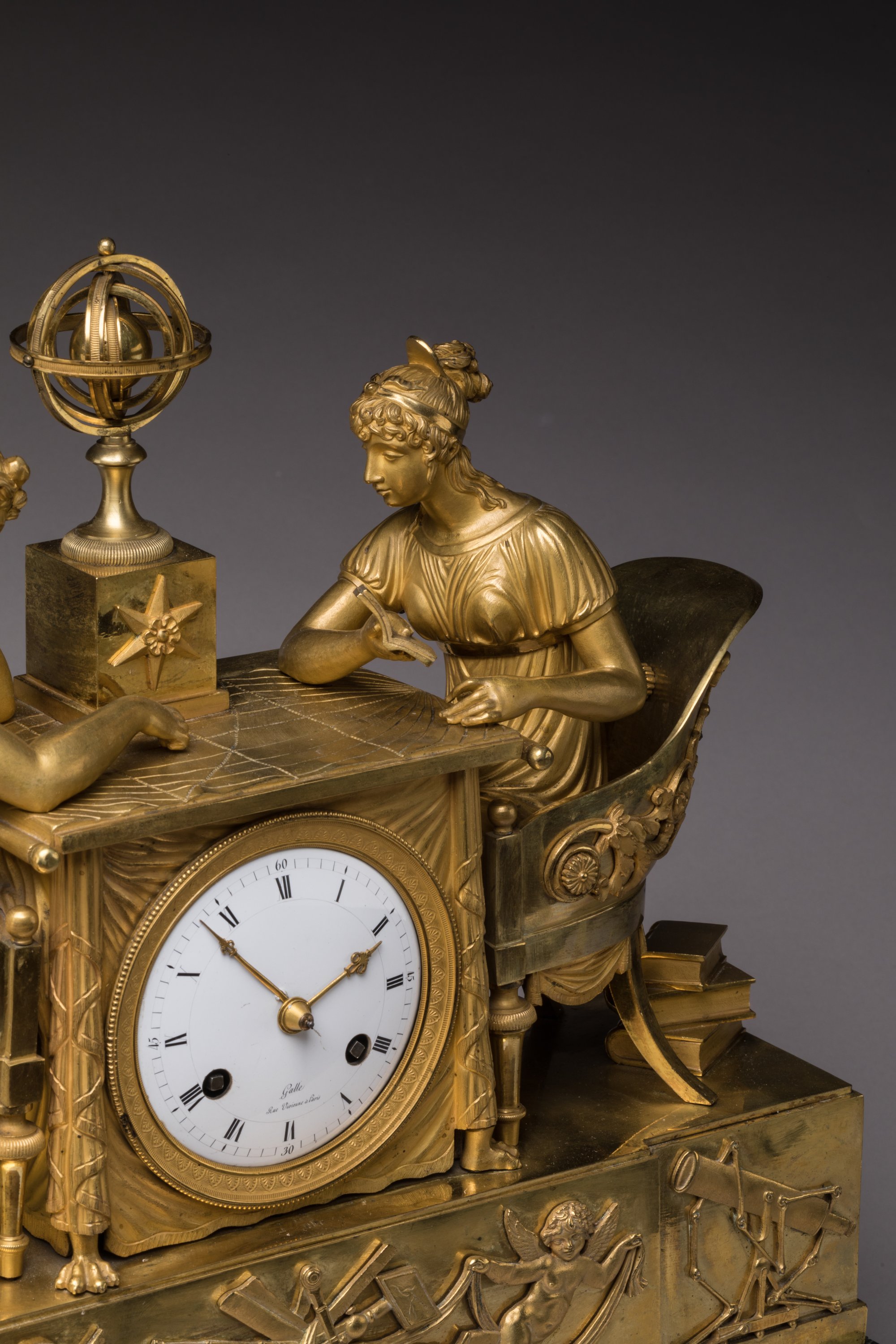 en bronze doré, figurant deux femmes assises dans le goût de l'Antique, étudiant à l'ombre d'une sphère armillaire au socle étoilé posé sur une table dans laquelle est enchâssée un cadran émaillé, avec les heures en chiffres romains et graduée pour les minutes. Entre les pieds sabres des fauteuils gondoles, reposent des livres et parchemins. La base en bronze doré est ornée de bas-reliefs figurant des putti tenant des trophées astronomiques encadrés par une longue-vue et un globe terrestre. La base en marbre vert repose sur six pieds toupies.