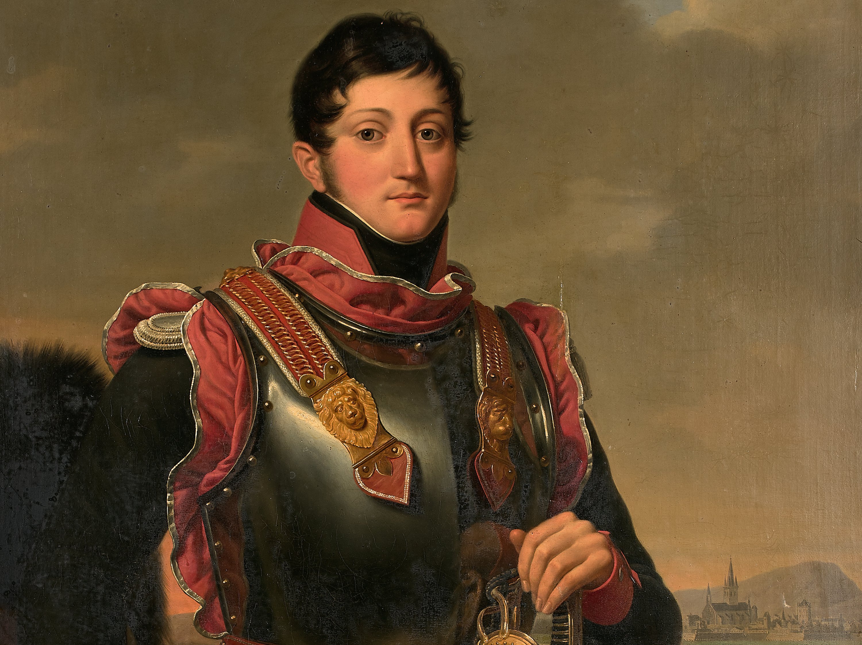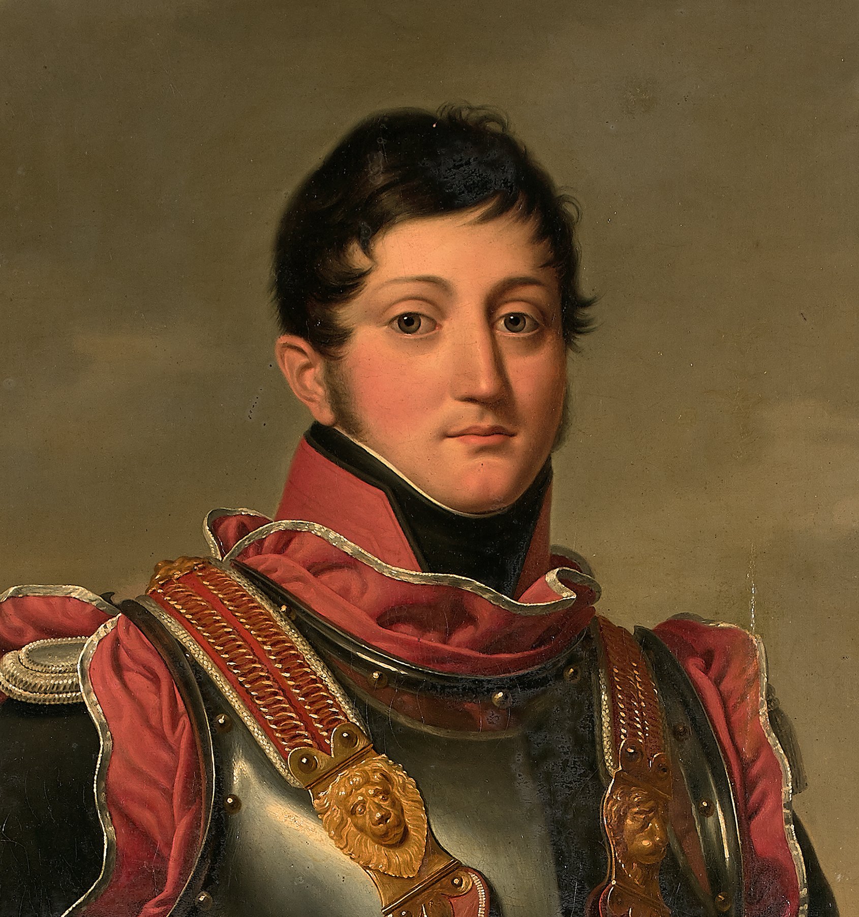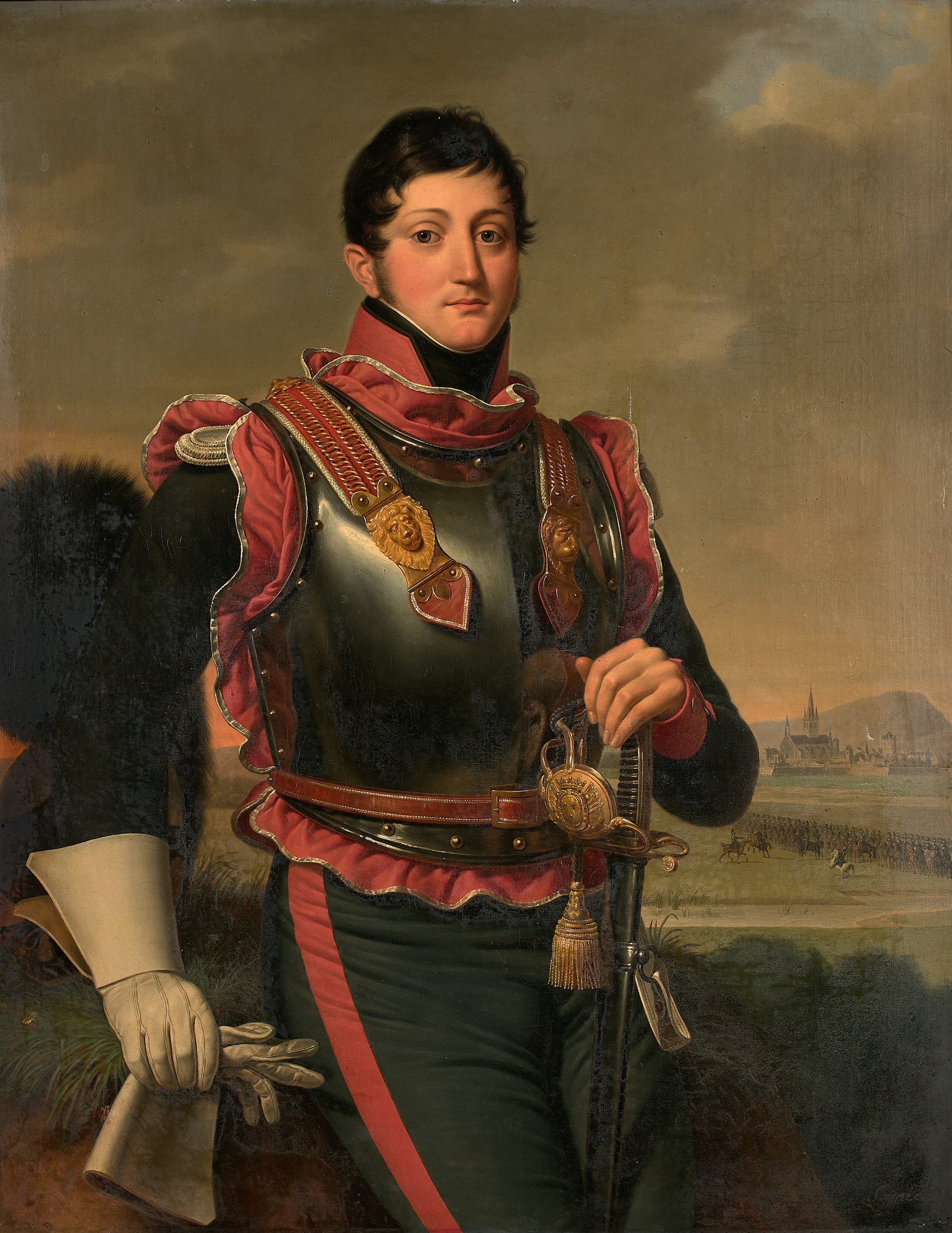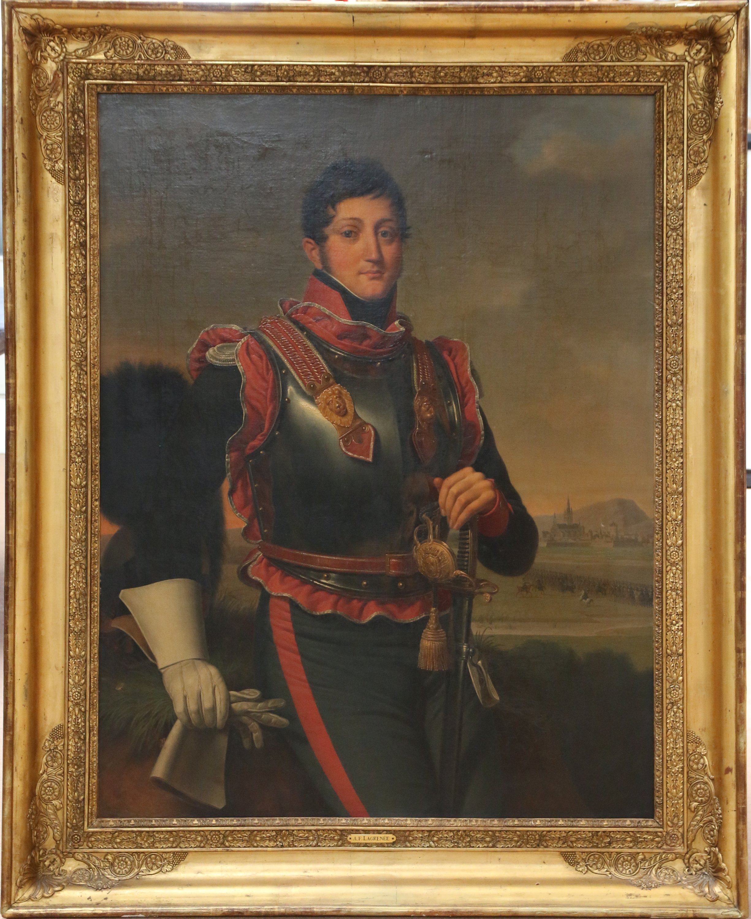 Lagrenée peint ici un jeune cuirassier de la Restauration devant un paysage au fond duquel une troupe s'exerce. C'est un officier, lieutenant en premier, à épaulette et contre épaulette en passementerie d'argent. Son casque à chenille et jugulaires dorées confirme son grade, tout comme les agrafes d'épaulières en mufle de lion doré ainsi que les doublures d'épaulière et la ceinture en maroquin brodé.