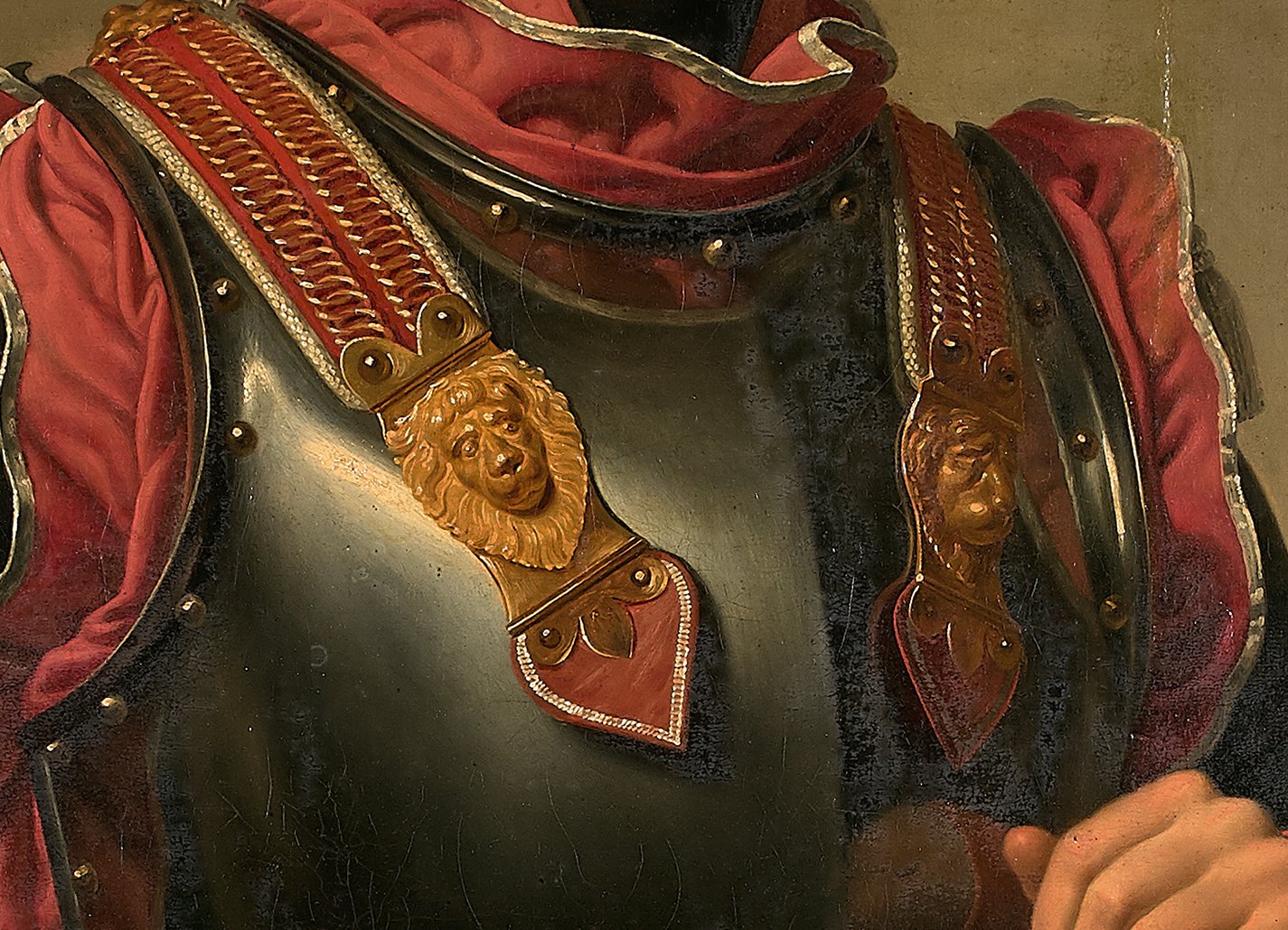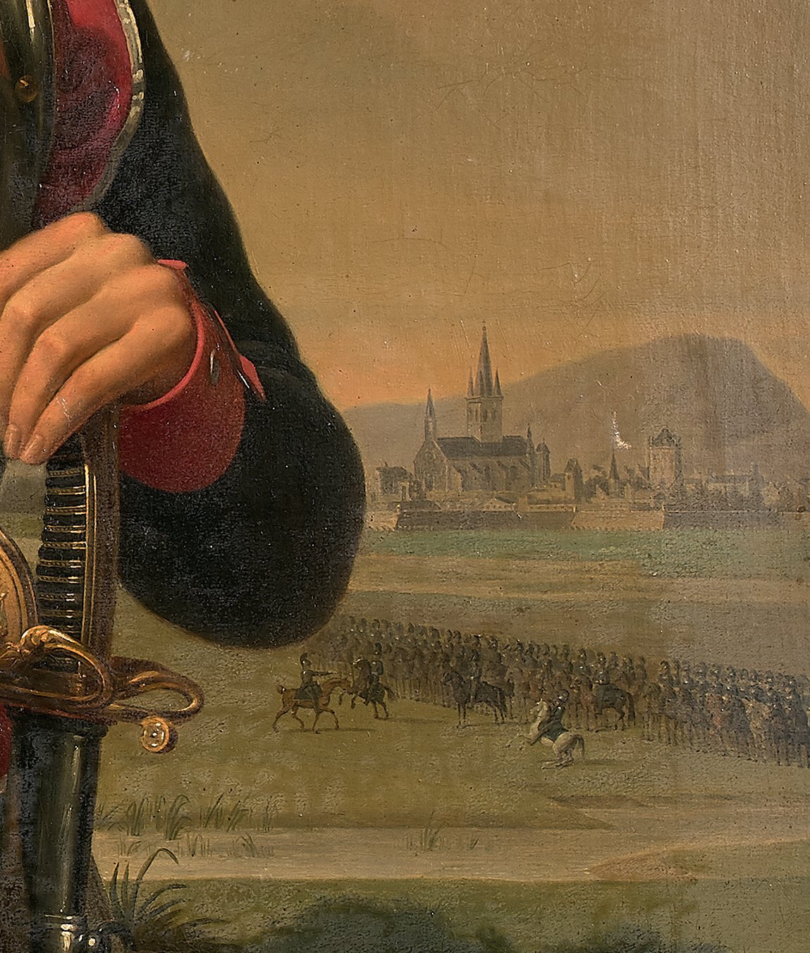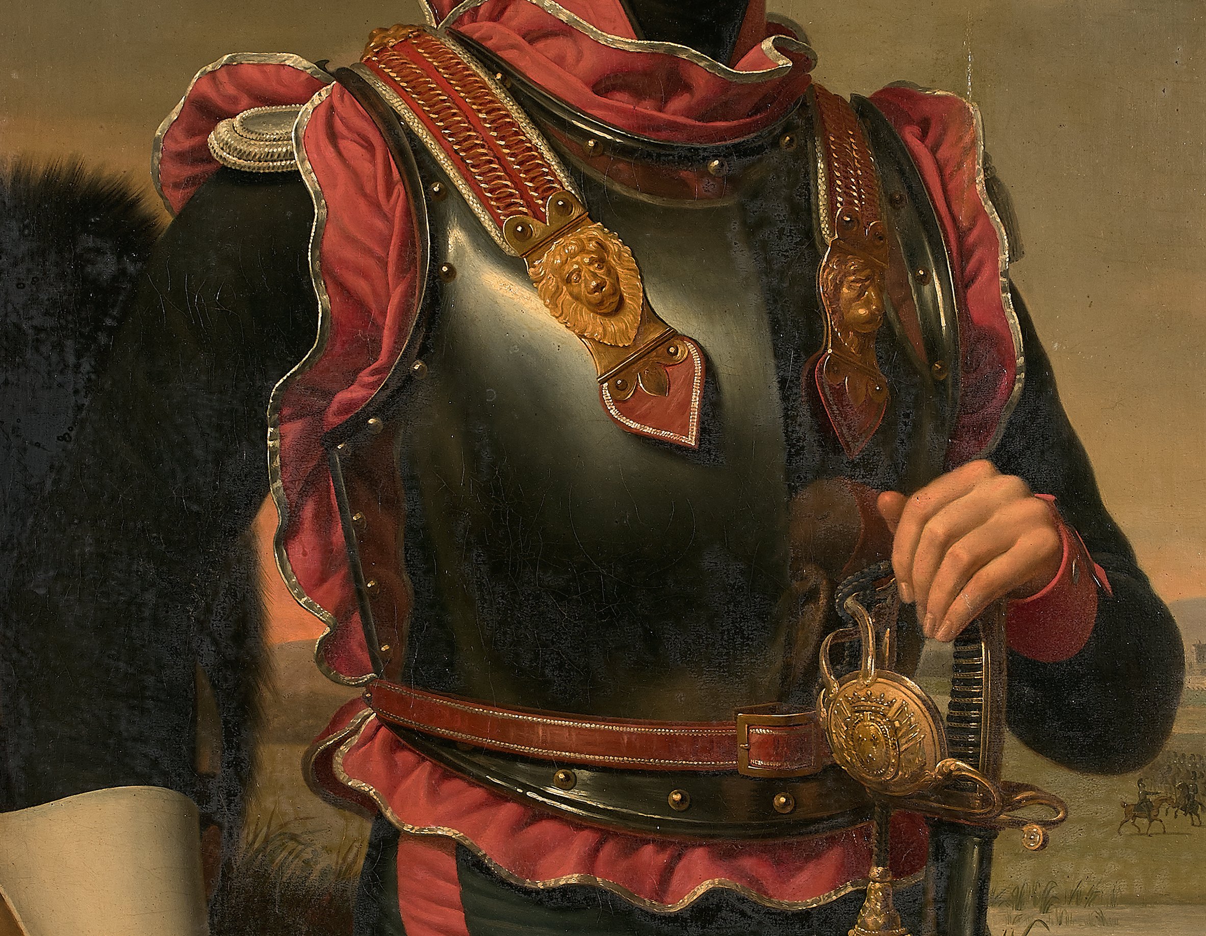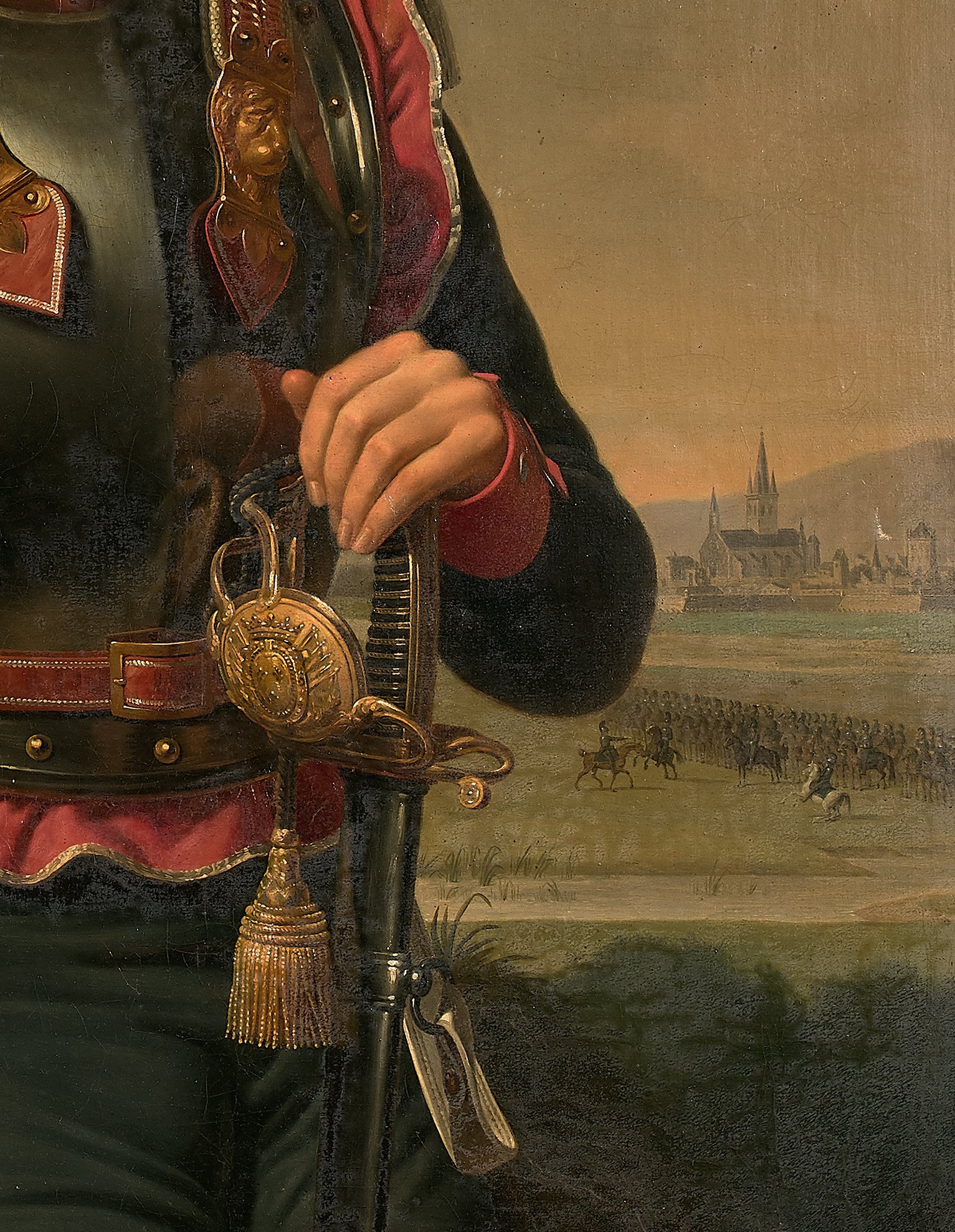 Son sabre muni d'une dragonne fine d'officier de cavalerie, porte sur la coquille les armes fleurdelisées de son régiment. Il ne s'agit ni des régiments de Condé et d'Orléans, ni de ceux du Dauphin et de la Reine. Reste comme possibilités les régiments d'Angoulême et de Berry, peut-être le sixième régiment de cuirassiers Condé, créé vers 1815. On retrouve la couleur rouge écarlate caractéristique de ce corps d'armée sur la fraise dépassant de la cuirasse, sur les épaulières ainsi que sur la ceinture (on retrouve cette couleur distinctive sur la bande de pantalon). Dans le cas, la ville au second plan pourrait être Fontenay-au-Comte.
