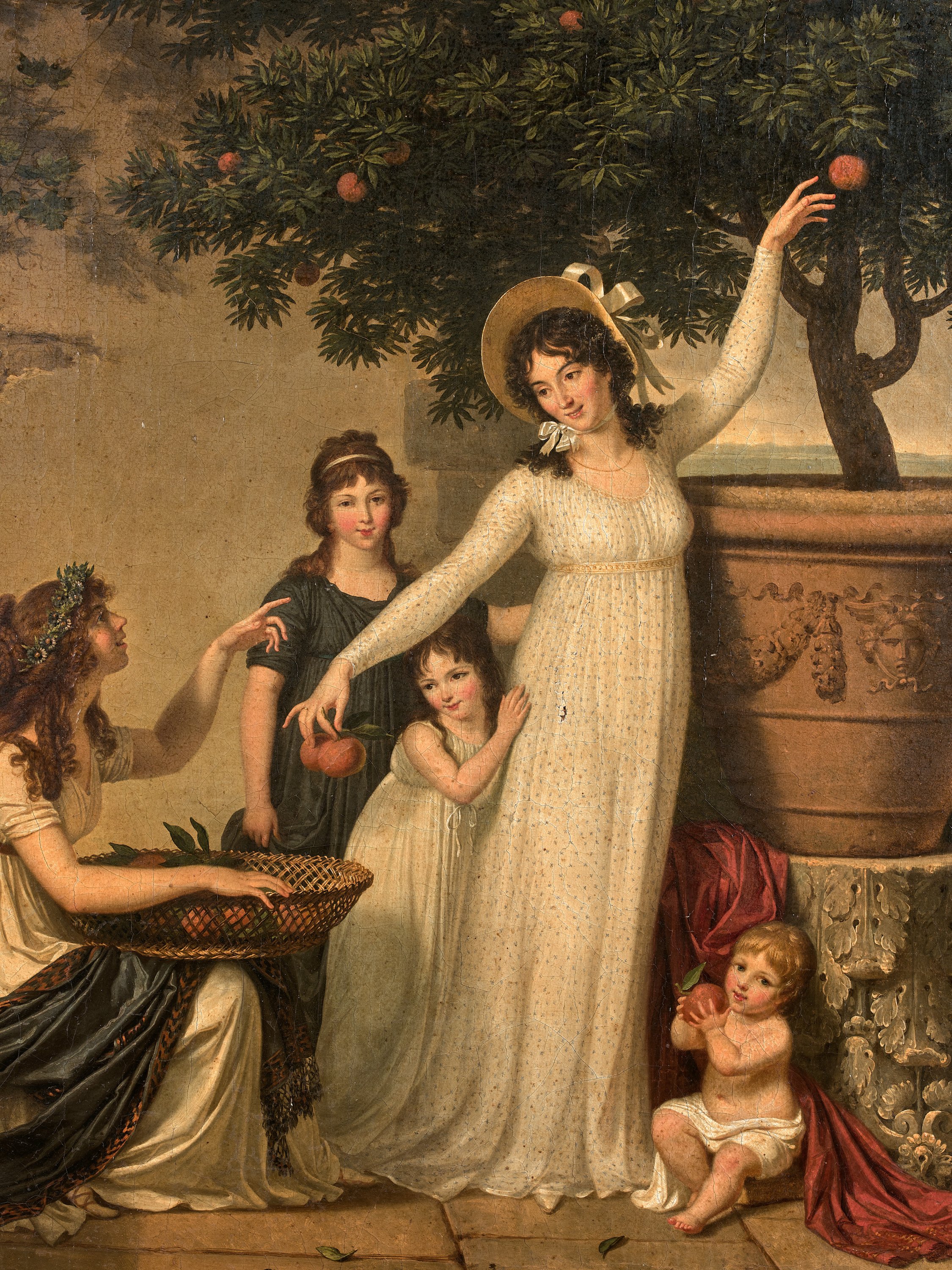 La jeune femme recueillant les oranges à gauche, aux allures de vestale, est une amie intime de la mère de famille, dont parle aussi la duchesse d’Abrantès comme d’une jeune femme qui entrera ensuite sous les ordres comme religieuse bénédictine et qui, pour témoigner sa reconnaissance à Madame de Sainct-Même qui avait été sa Providence, vint « s’établir pendant des mois entiers chez elle où elle enseignait la parole de Dieu à ses enfants. »