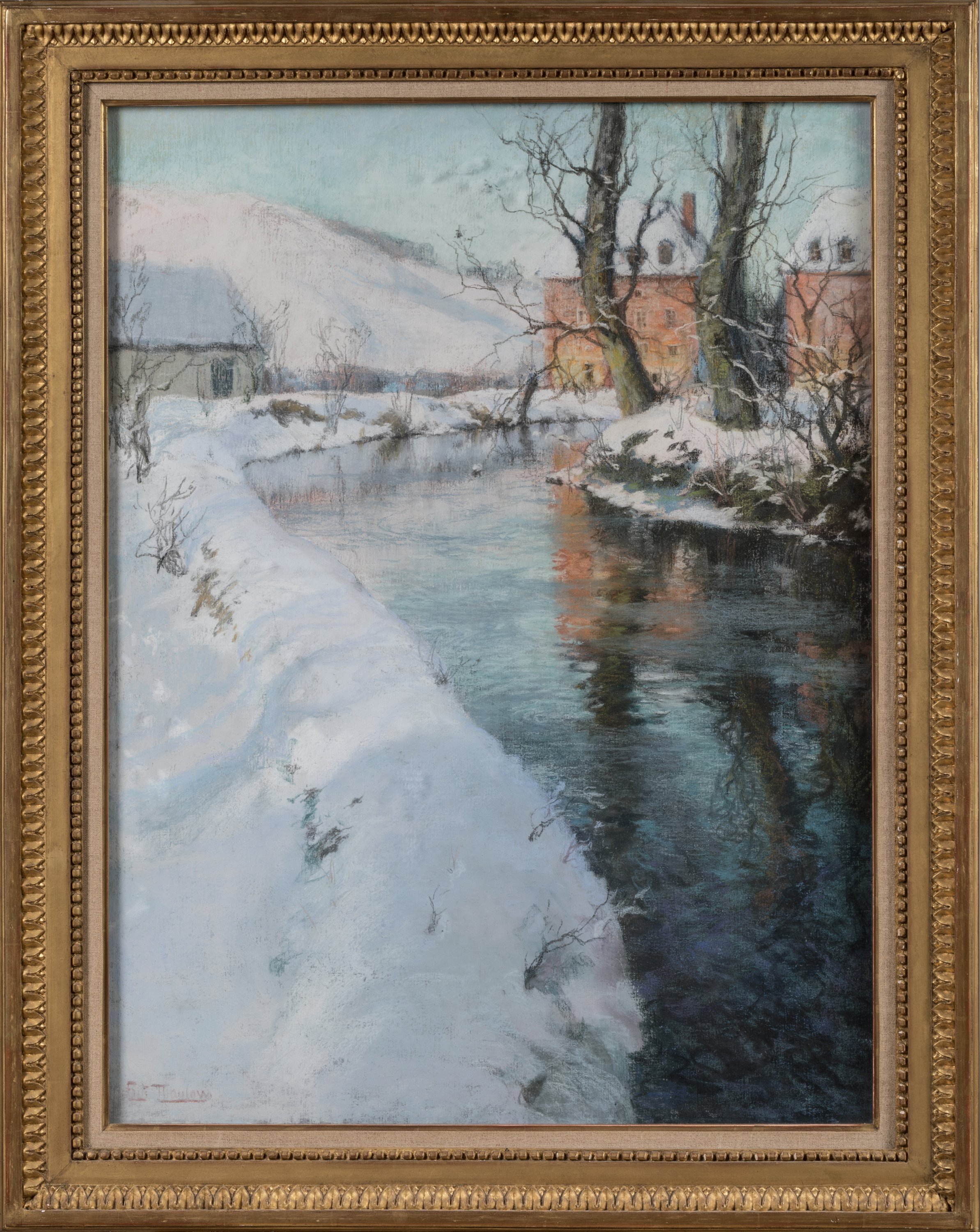 Élève de Jules Bastien-Lepage et maître d'Edward Munch, Frits Thaulow navigue entre naturalisme sous l'influence de l'école de Barbizon, réalisme et impressionnisme. Formé à l'académie des Beaux-Arts de Copenhague et confronté au Paris de la Belle Époque, on retient de lui ses sublimes vues de Venise et ses paysages enneigés. Ami de Rodin ou de Le Sidaner, familier de Gauguin par alliance, Frits Thaulow s'impose comme un pionnier de l'impressionnisme norvégien. Membre du jury de l'Exposition universelle de 1889 il est à fortiori une figure du Paris de la fin du XIXe siècle. Les reflets de la neige jouant avec ceux de l'eau liquide dans une composition chromatique maitrisée sont caractéristiques de son travail en 1895, année d'une fructueuse escapade en Normandie.