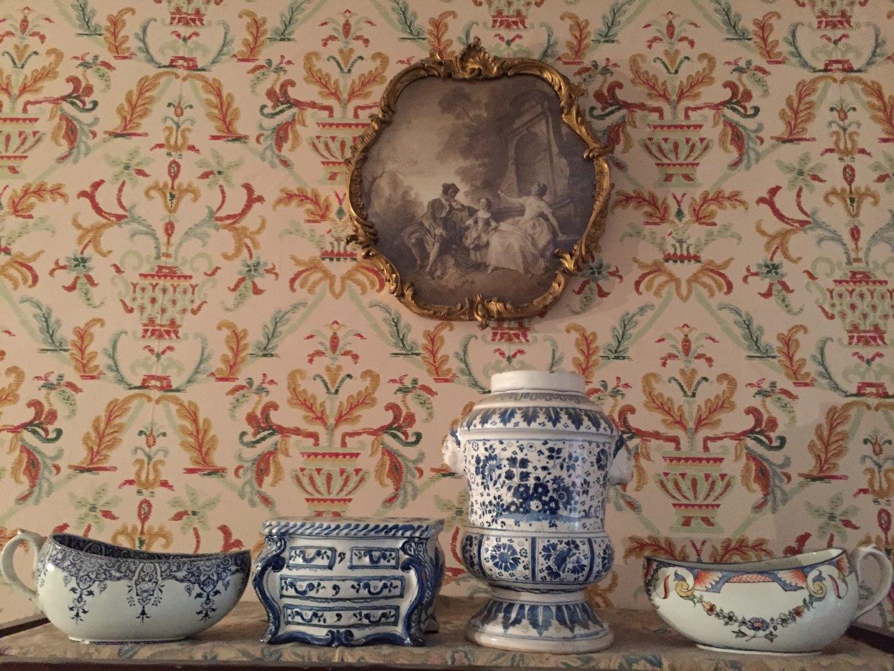 RÉUNION de quatre pièces en faïence comprenant une BOUQUETIÈRE, un VASES à deux figures, deux BOURDALOU l'un portant une marque de la Manufacture de Gien.