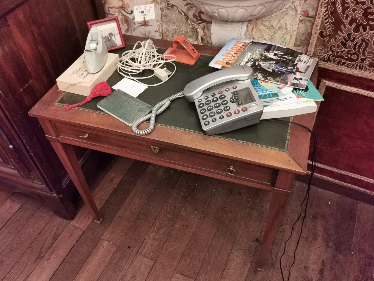 Petit BUREAU en placage d'acajou ouvrant par un tiroir. Quatre pieds gaines. Le dessus foncé d'un cuir vert. Ornementation de laiton.
