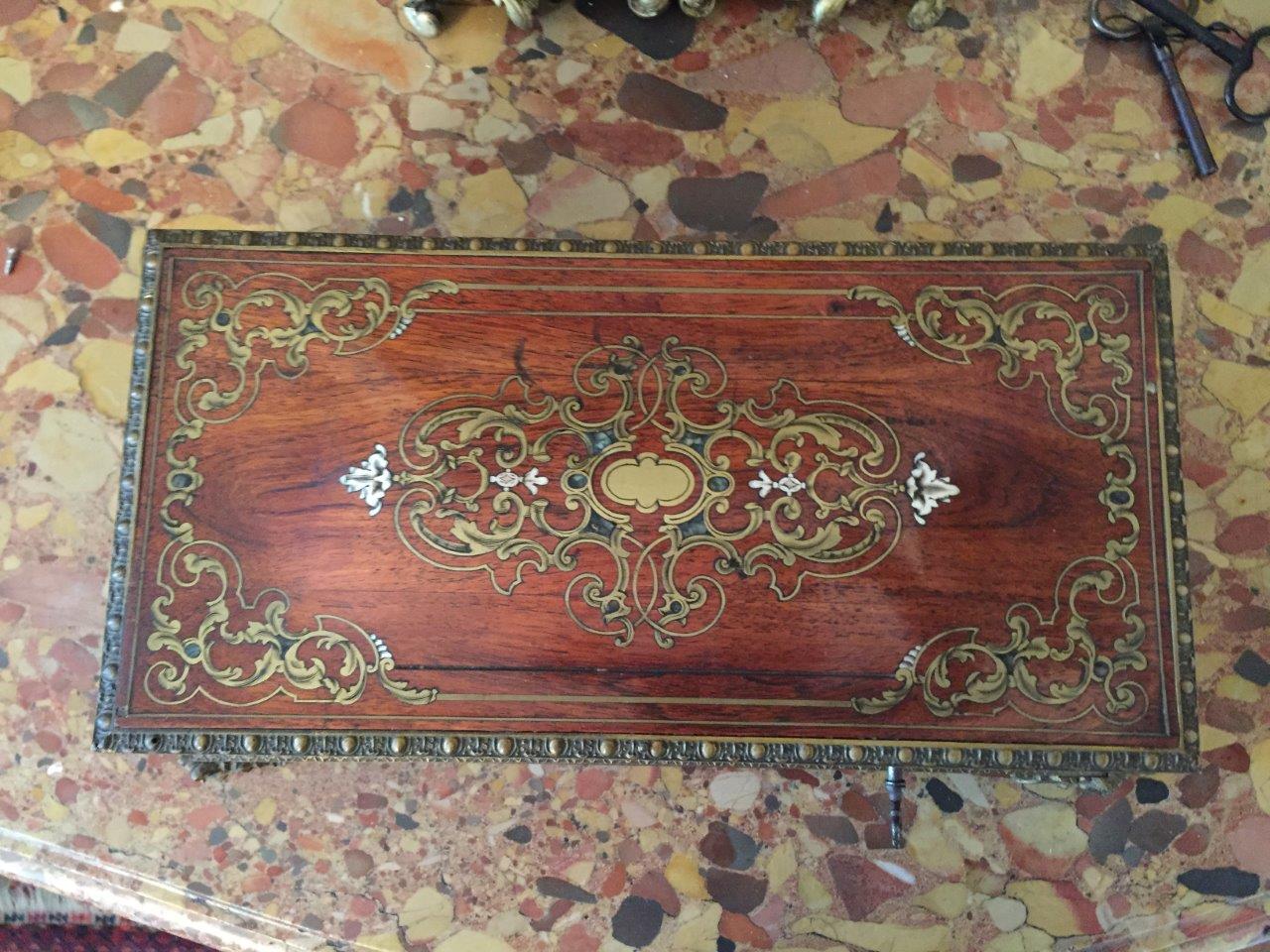 BOITE à COUTURE en bois de placage et marqueterie de laiton en première partie présentant un couvercle au cartouche entouré de rinceaux. Elle ouvre par deux portes et un couvercle. Ornementation de bronze doré comme lingotière et piétement.
