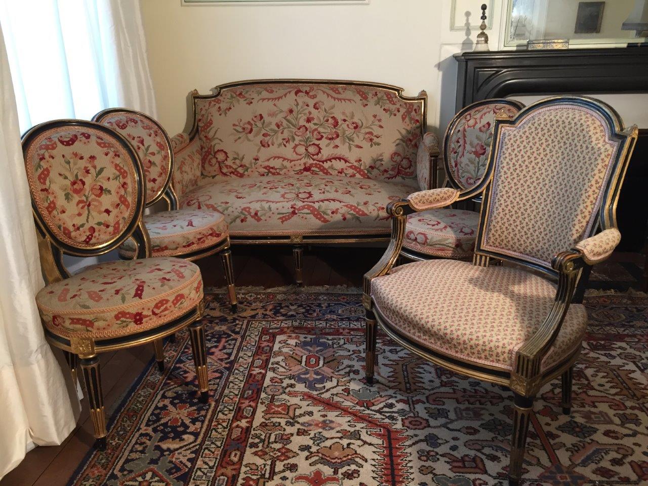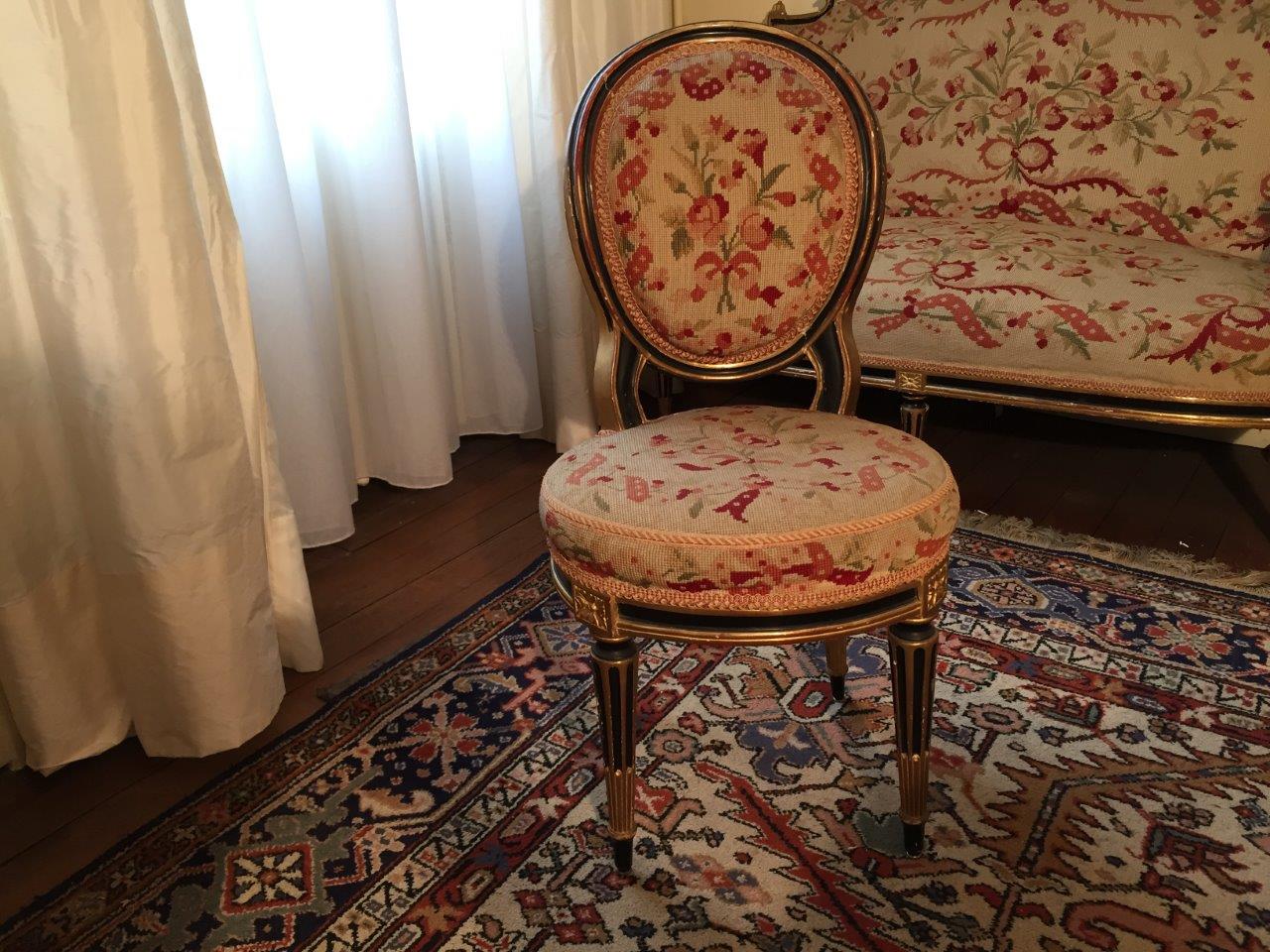 Réunion de CINQ SIÈGES formant SALON: un CANAPÉ, un FAUTEUIL CABRIOLET et trois CHAISES à dossier MÉDAILLON. En bois sculpté et mouluré laqué noir et or. Les dès de raccordement ornés de décor de marguerite dans des cartouches. Ils reposent sur des pieds fuselés, cannelés et rudentés.