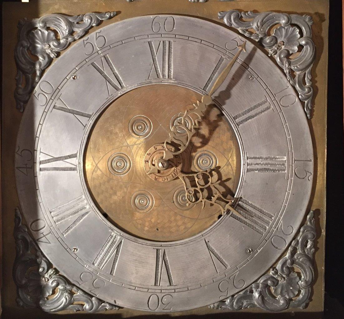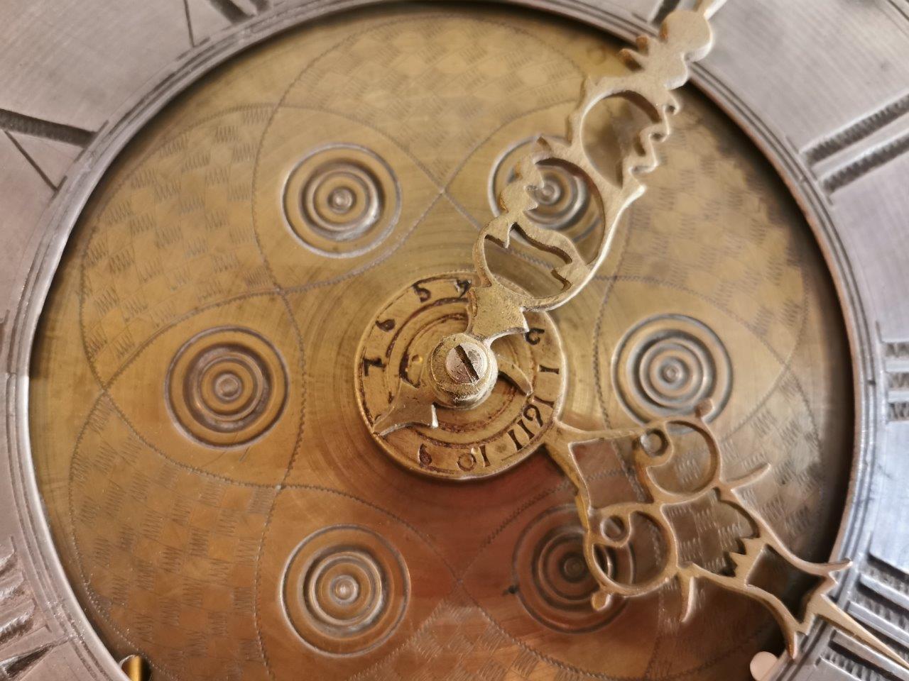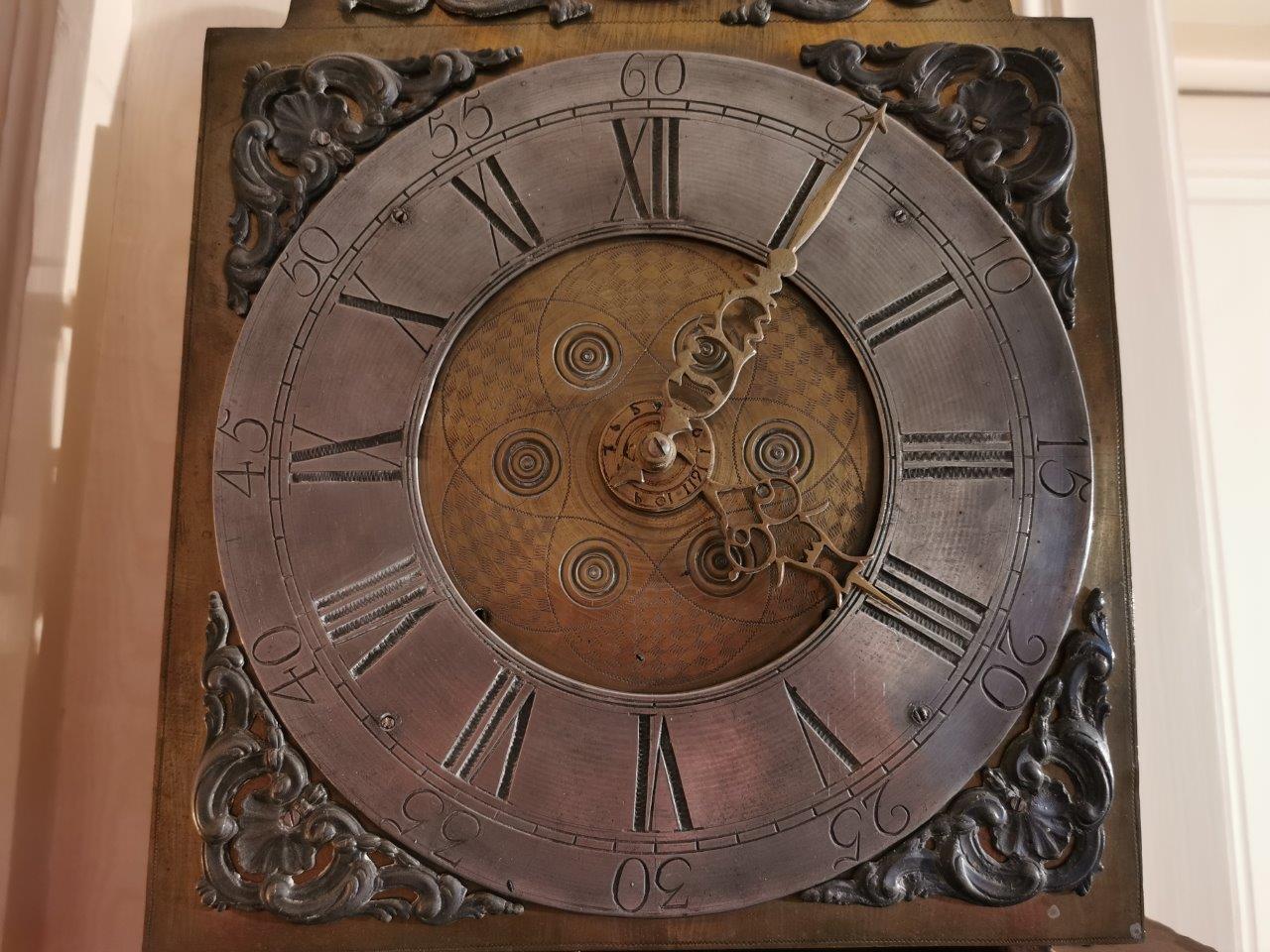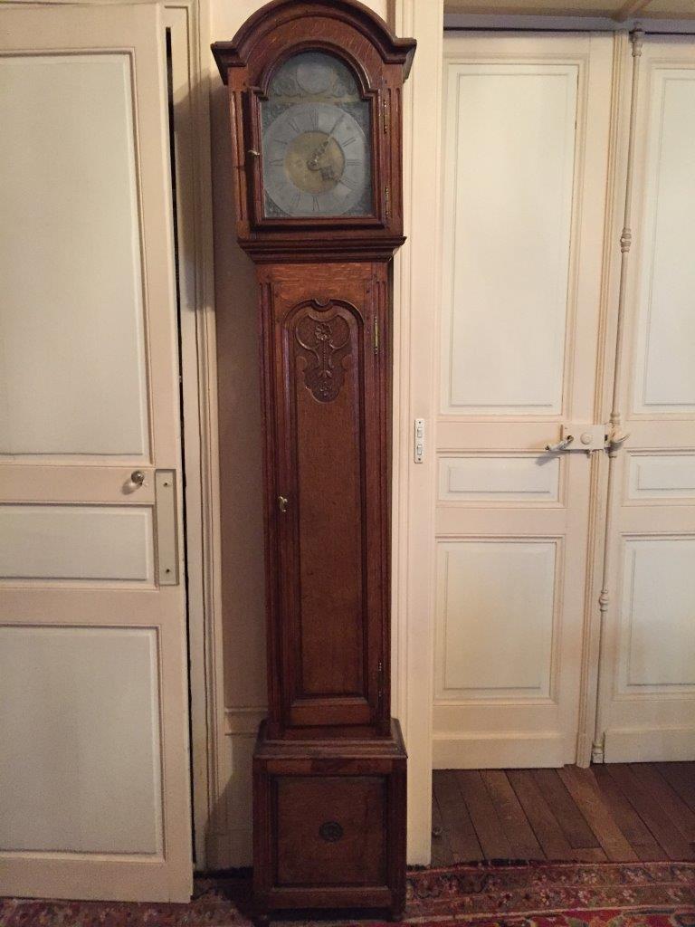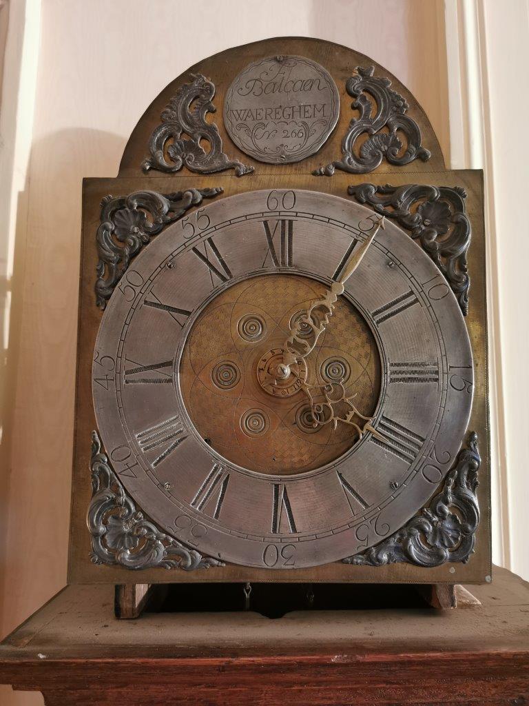 HORLOGE. La caisse en bois naturel ouvrant par une porte. Le cadran indiquant les heures par des chiffres romains, les minutes par des chiffres arabes autour d'un chemin de fer et signé "F. Balccien / Waereghem" et numéroté 266.