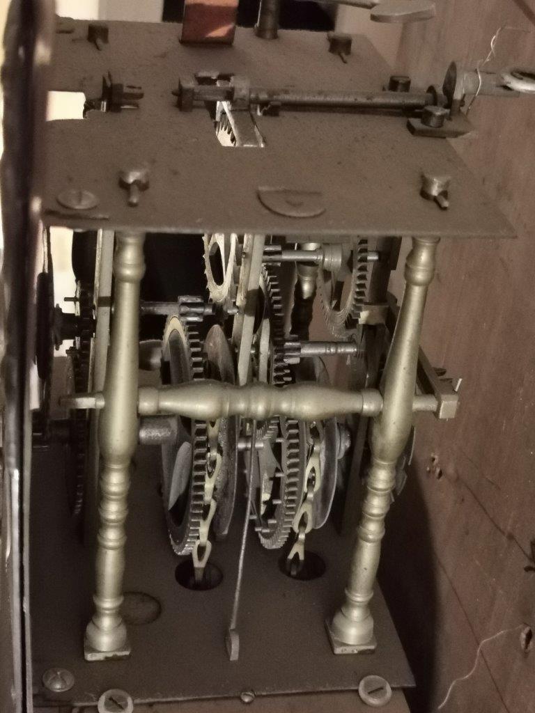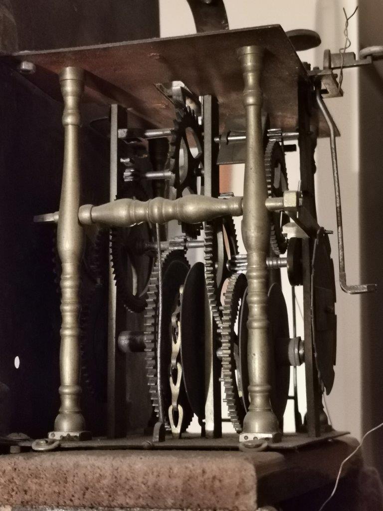 HORLOGE. La caisse en bois naturel ouvrant par une porte....