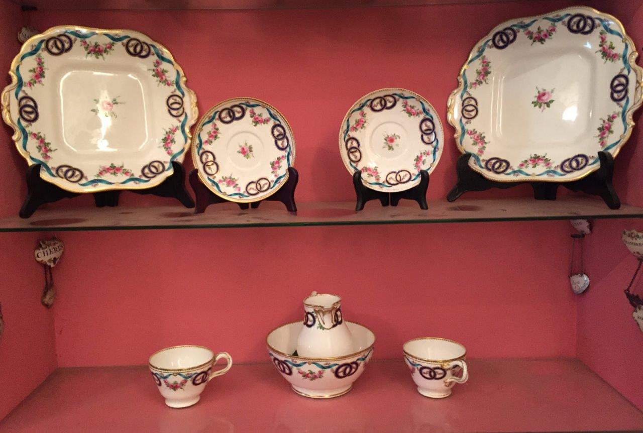 PARIS. SERVICE en porcelaine à décor floral, composé deux TASSES et leurs SOUCOUPES, deux PLATS, un POT à LAIT et son BOL, deux PLATS.