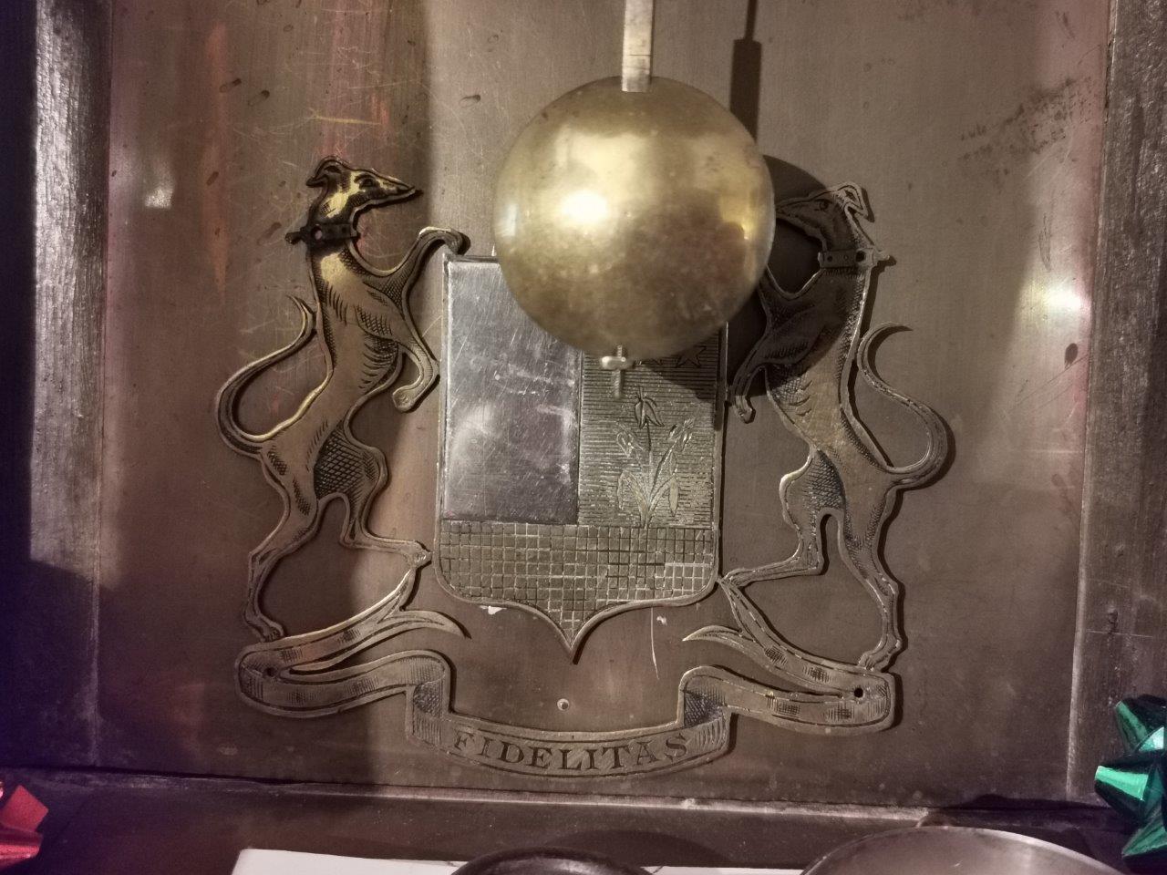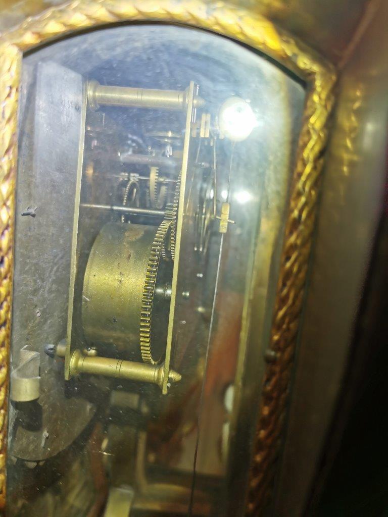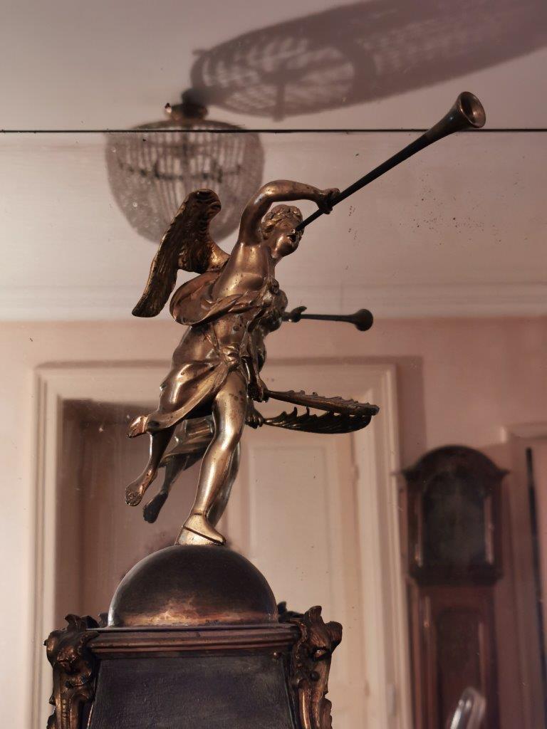 CARTEL en bois noirci et bronze doré, l'amortissement à décor d'une figure de la Renommée Le cadran à treize vingt-cinq plaques émaillées sur fond de laiton doré, indique les heures par des chiffres romains, les minutes par des chiffres arabes.