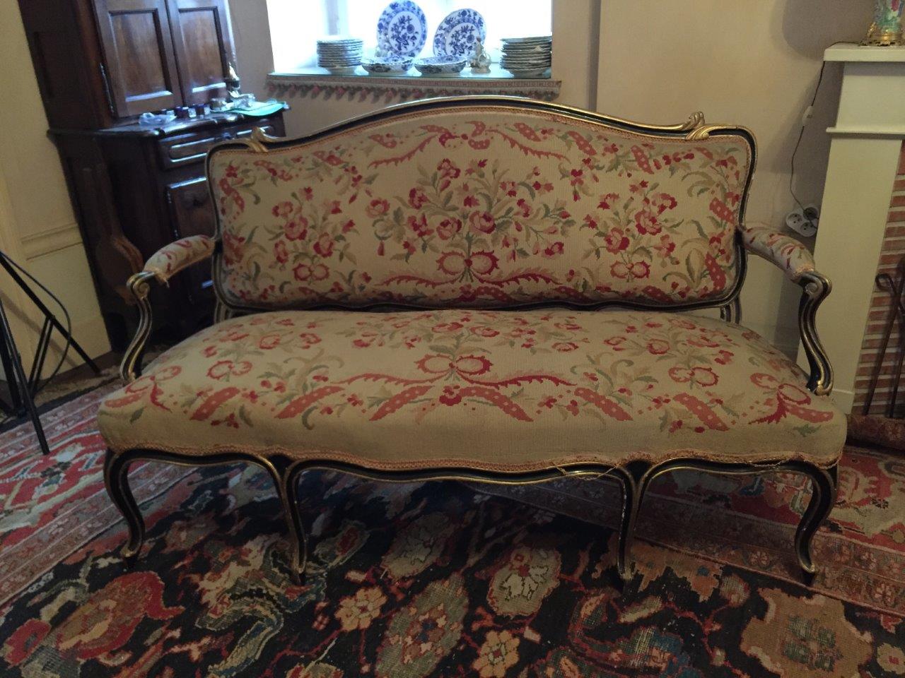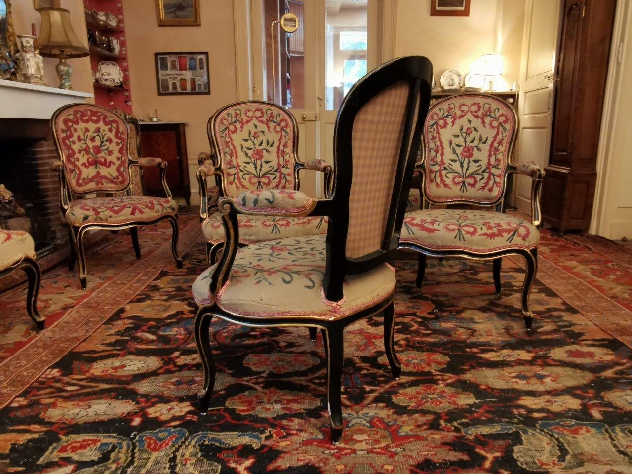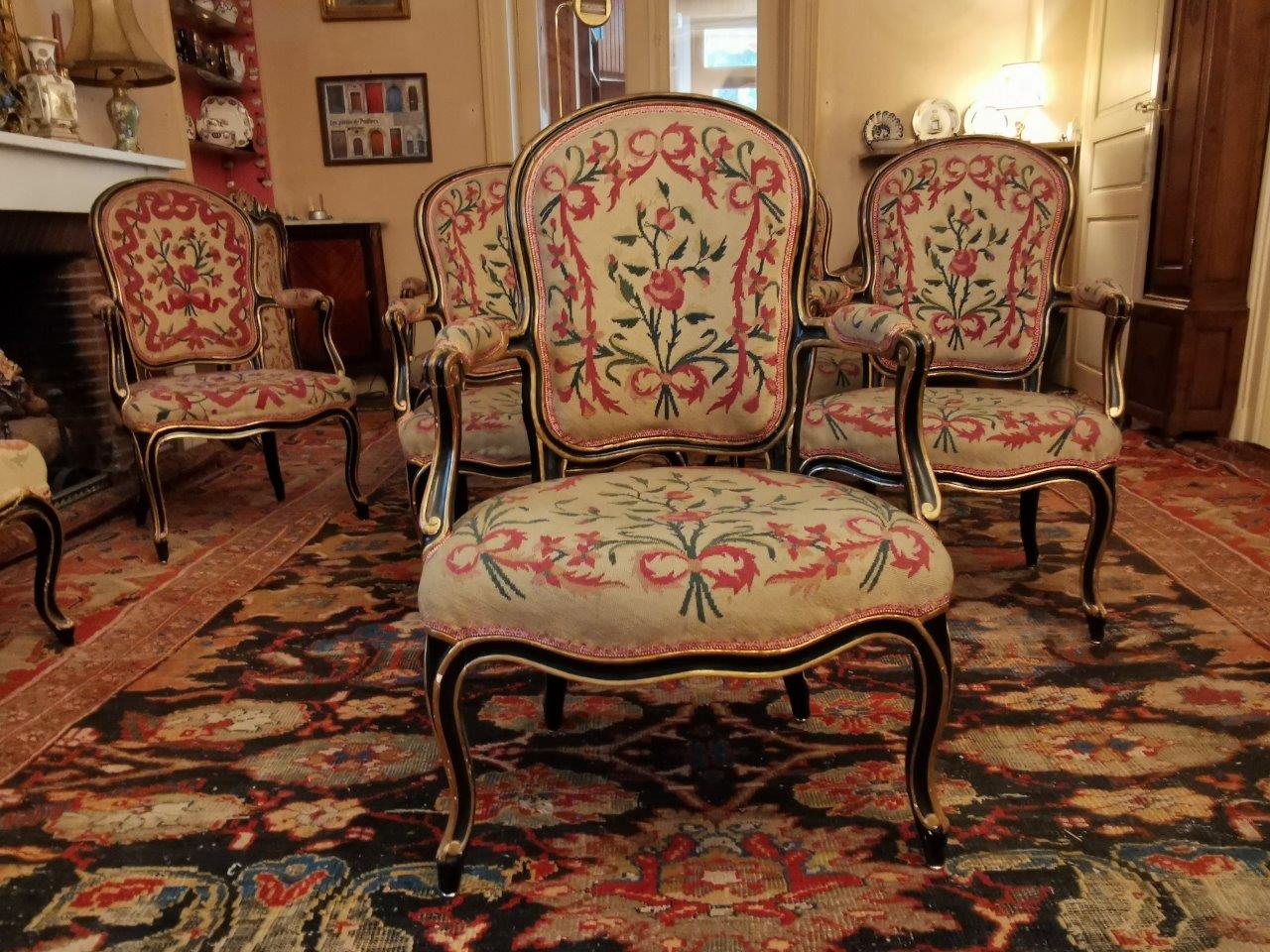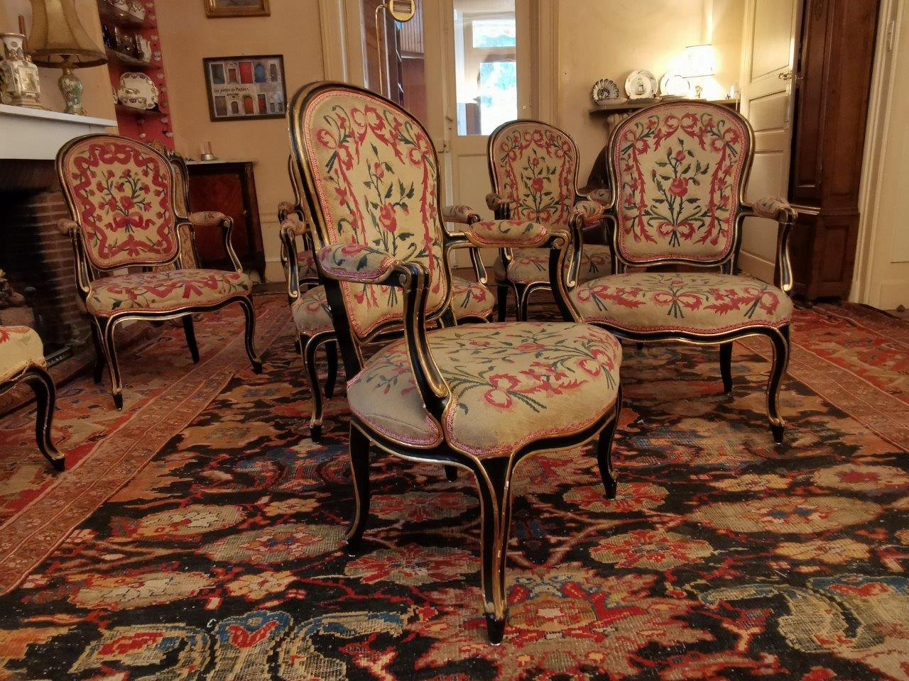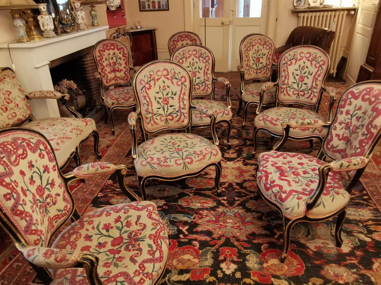 SALON comprenant UN CANAPÉ, HUIT FAUTEUILS en bois mouluré laqué noir et doré. Les sièges de forme mouvementée, le dossier violoné, les accotoirs à manchettes, les pieds galbés.