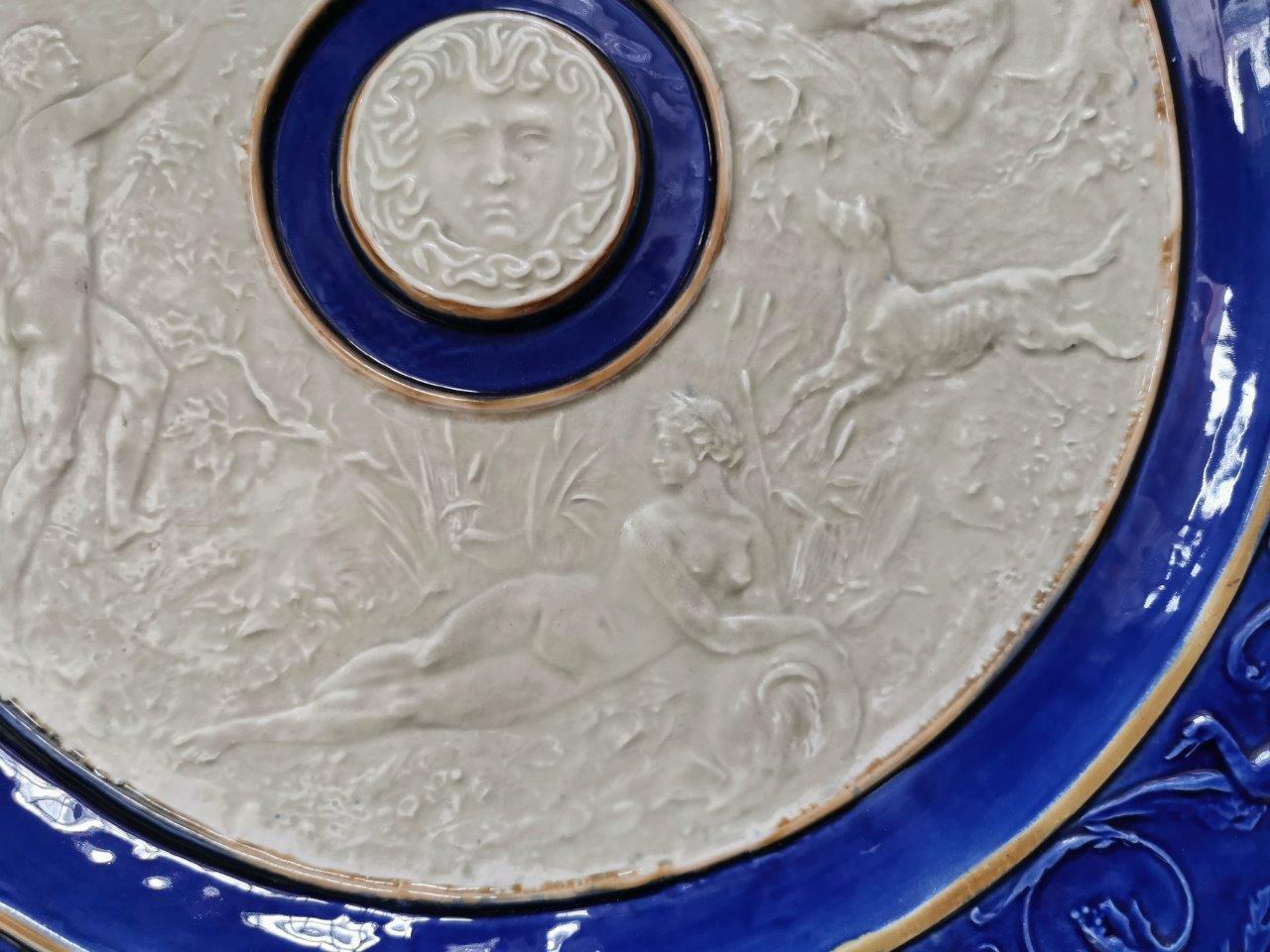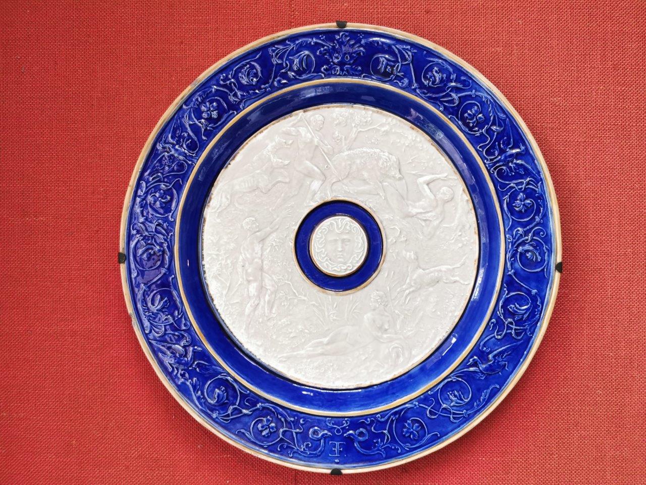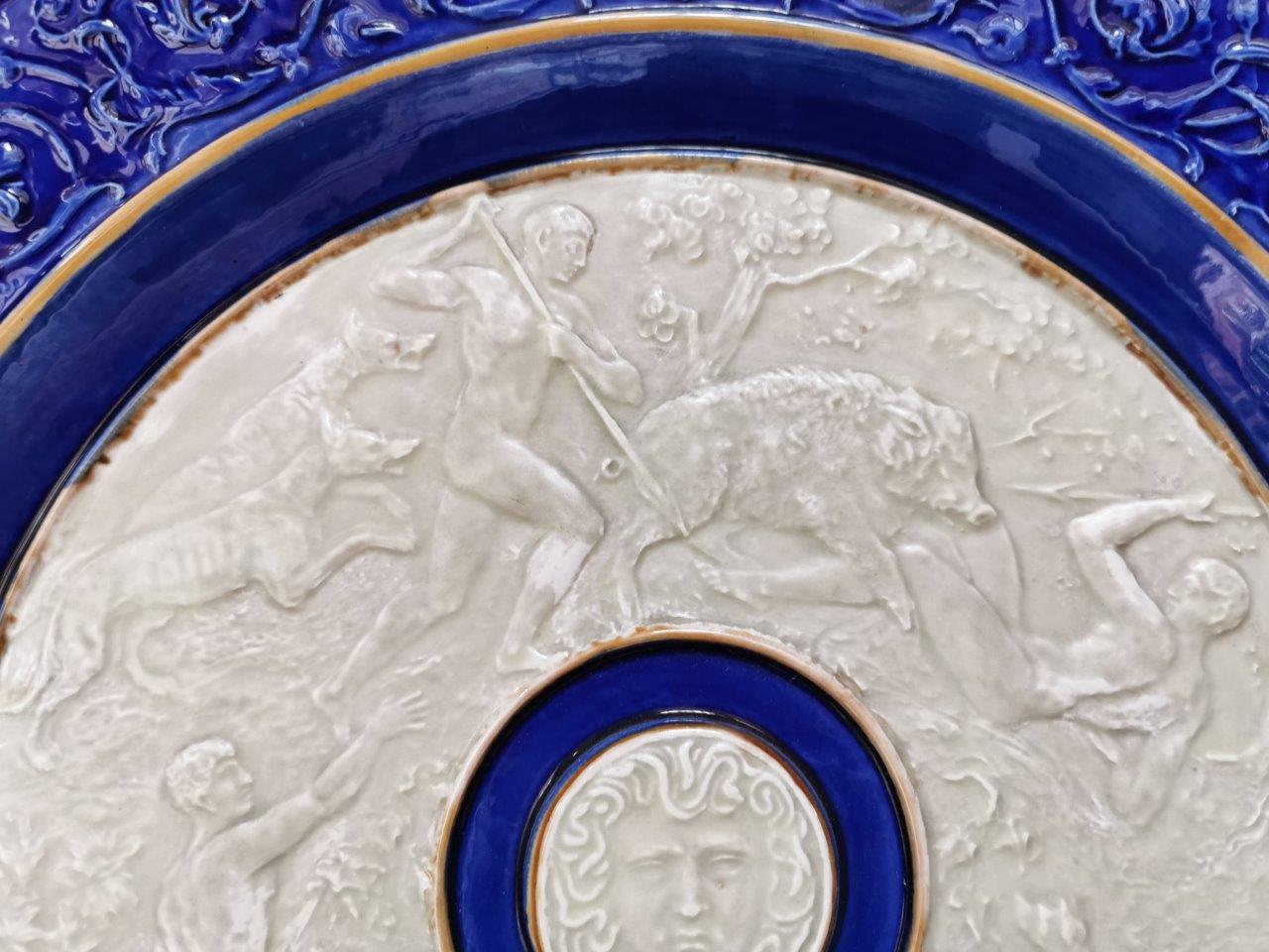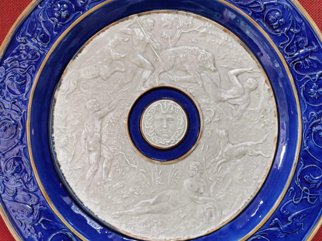 GIEN. Très RARE PAIRE de PLATS en biscuit de Gien émaillé à la Manufacture impériale de Sèvres. Le décor du plat alternant émail bleu et biscuit blanc figurant une scène de chasse au sanglier, le centre du plat orné d'un médaillon à tête de Gorgone.