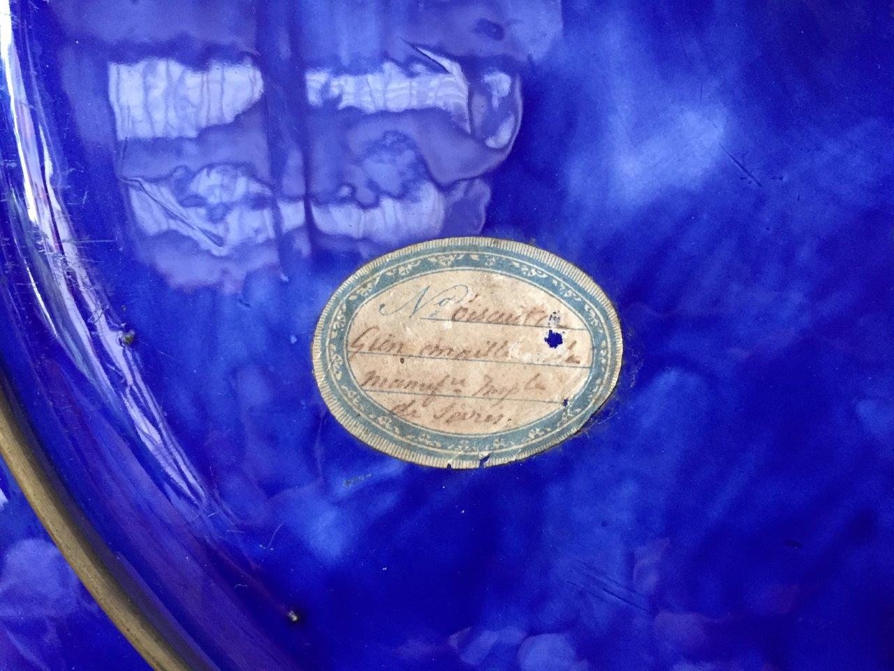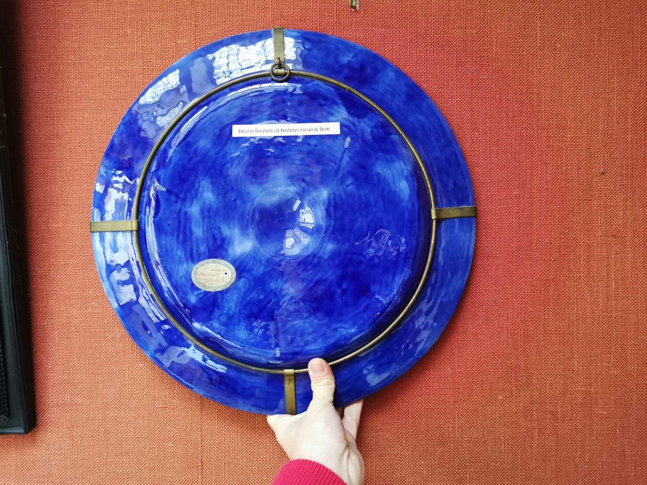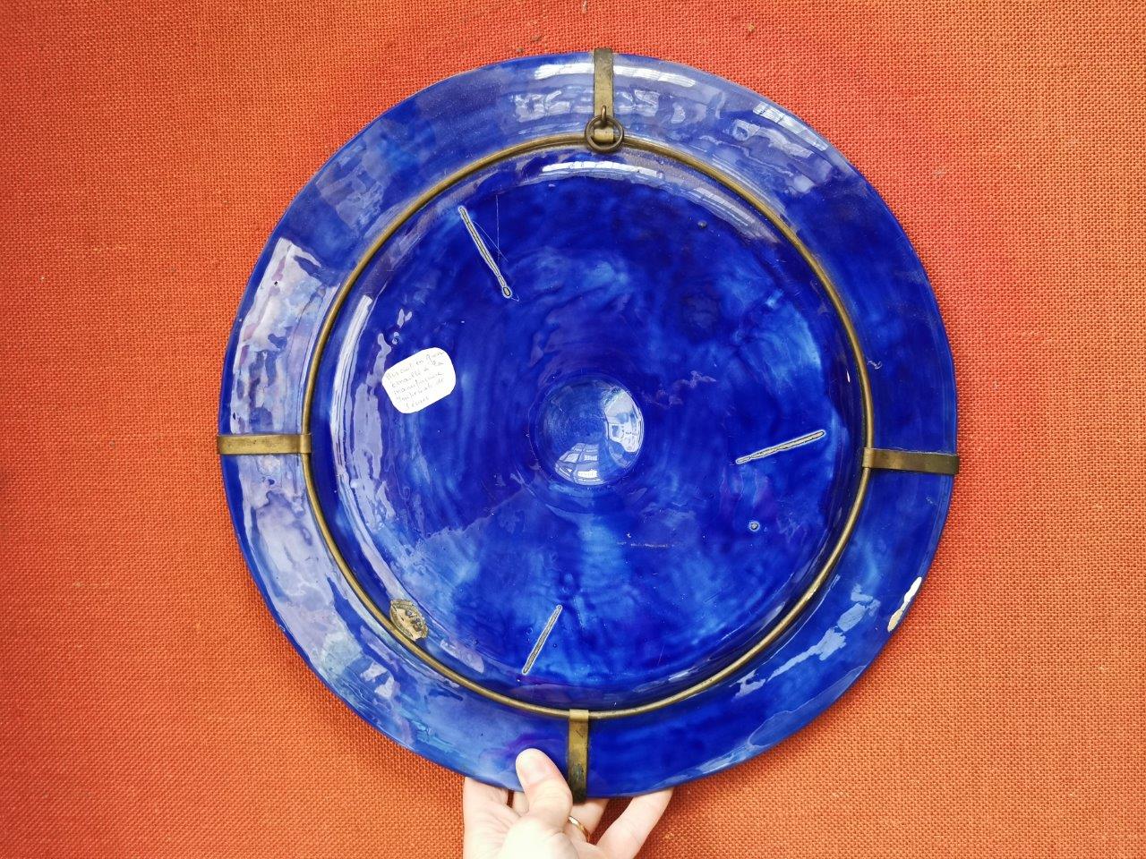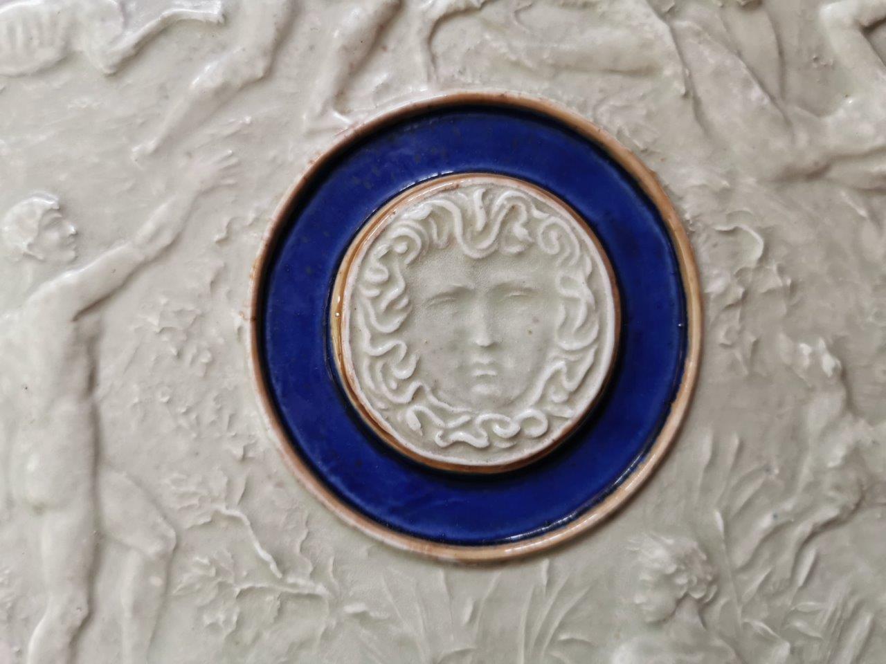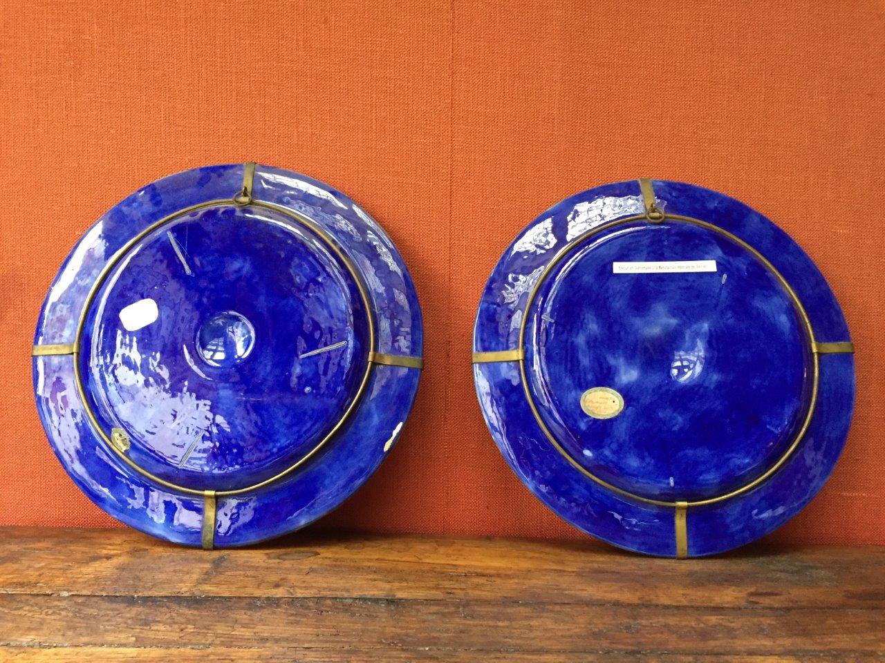GIEN. Très RARE PAIRE de PLATS en biscuit de Gien émaillé à la Manufacture impériale de Sèvres. Le décor du plat alternant émail bleu et biscuit blanc figurant une scène de chasse au sanglier, le centre du plat orné d'un médaillon à tête de Gorgone.
