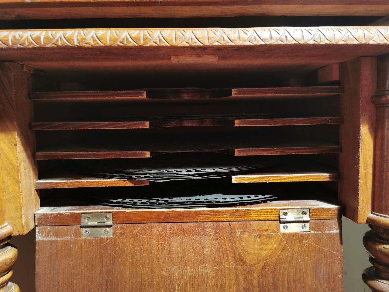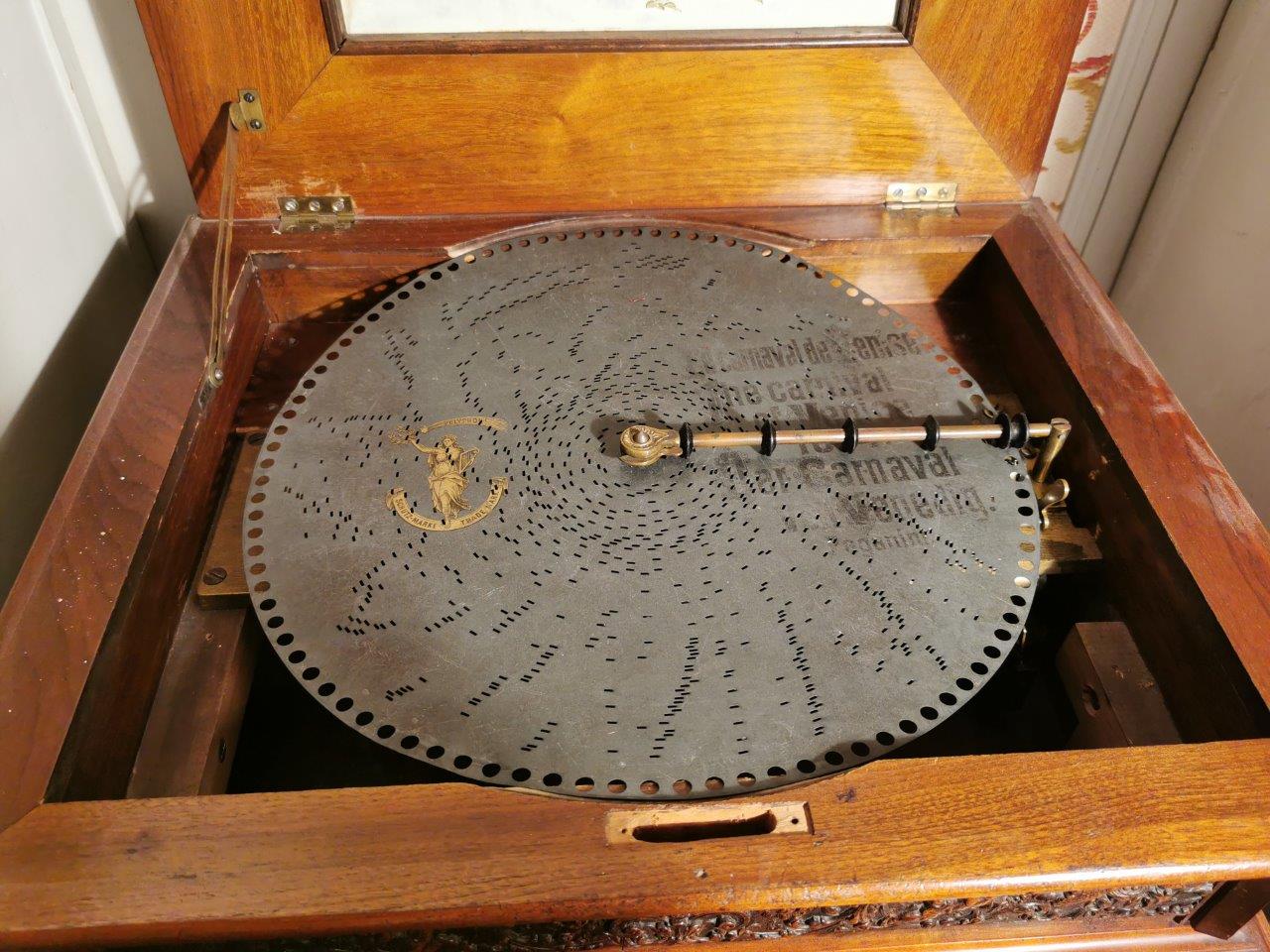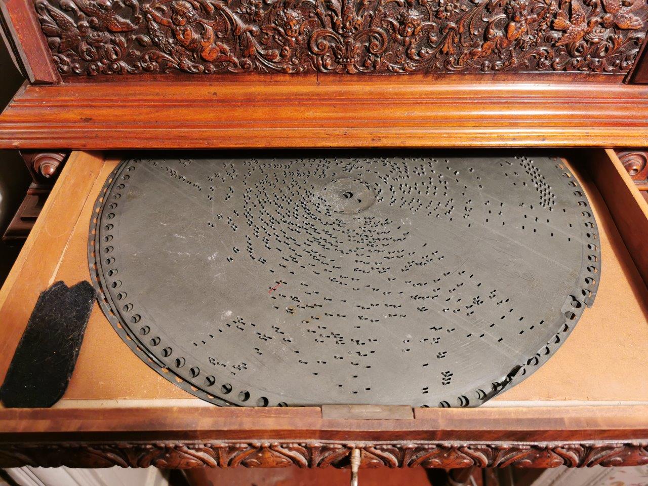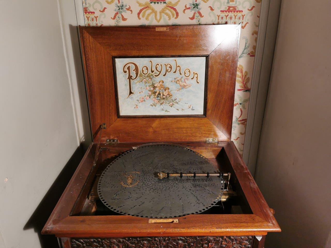 Beau POLYPHON, avec son casier plein d’environ vingt-cinq disques métalliques, en bois naturel dont l’abattant supérieur est orné d’un cartouche avec deux lions héraldiques.