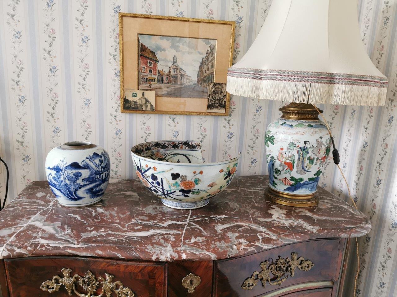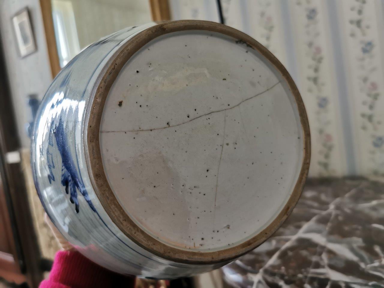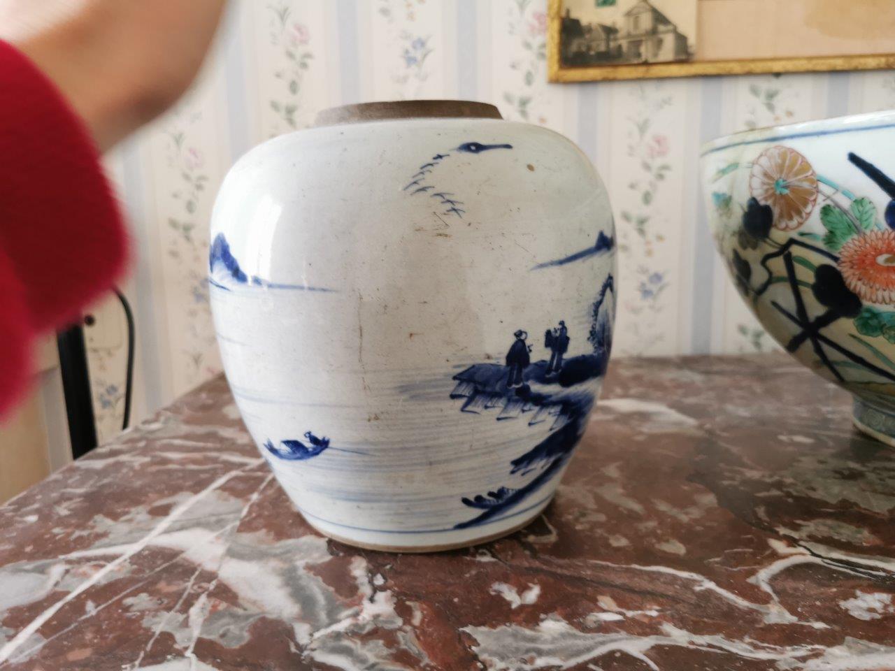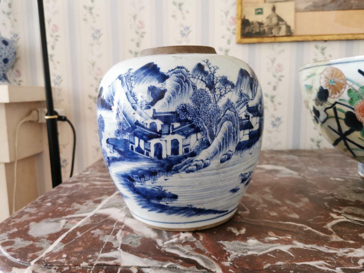 JOINT: CHINE - XIXe POT à GINGEMBRE en porcelaine bleu-blanc à décor d'un paysage de montagne et village sur fond de scène lacustre. Haut. 22, Diam. 21, cm (fêle).