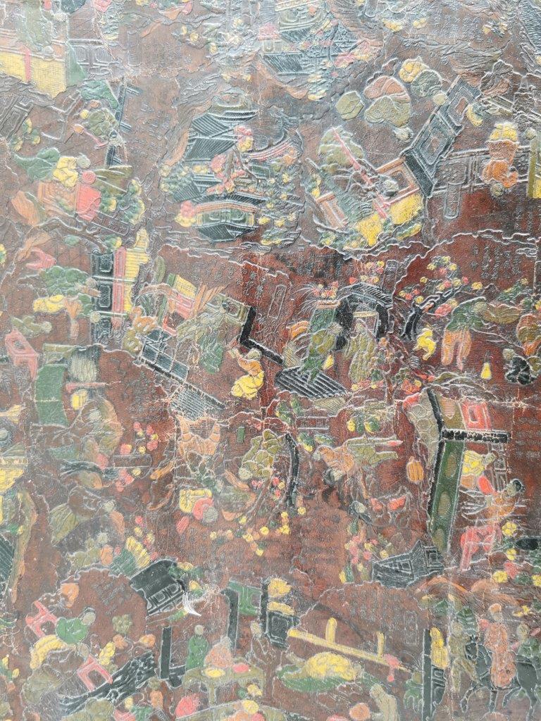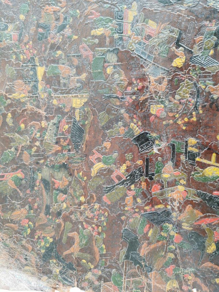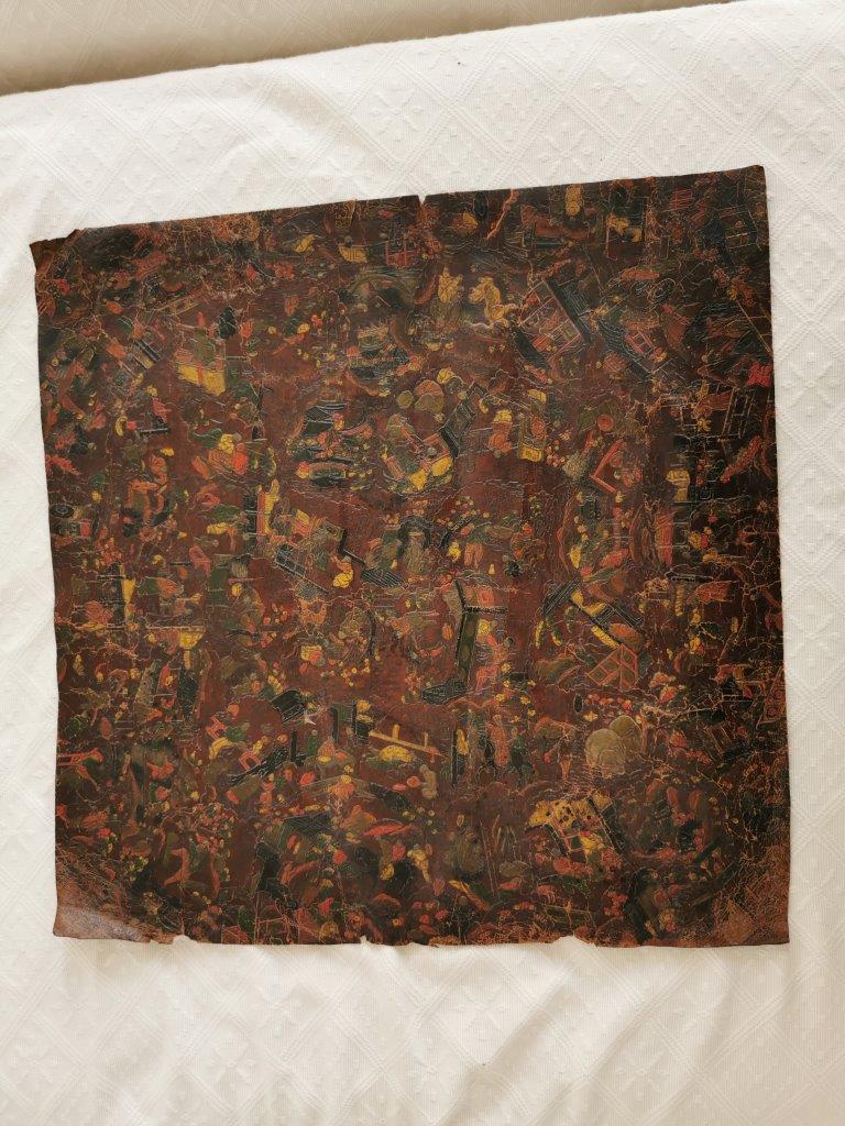CHINE? Plaque en cuir repoussé polychrome à décor de scènes animées.