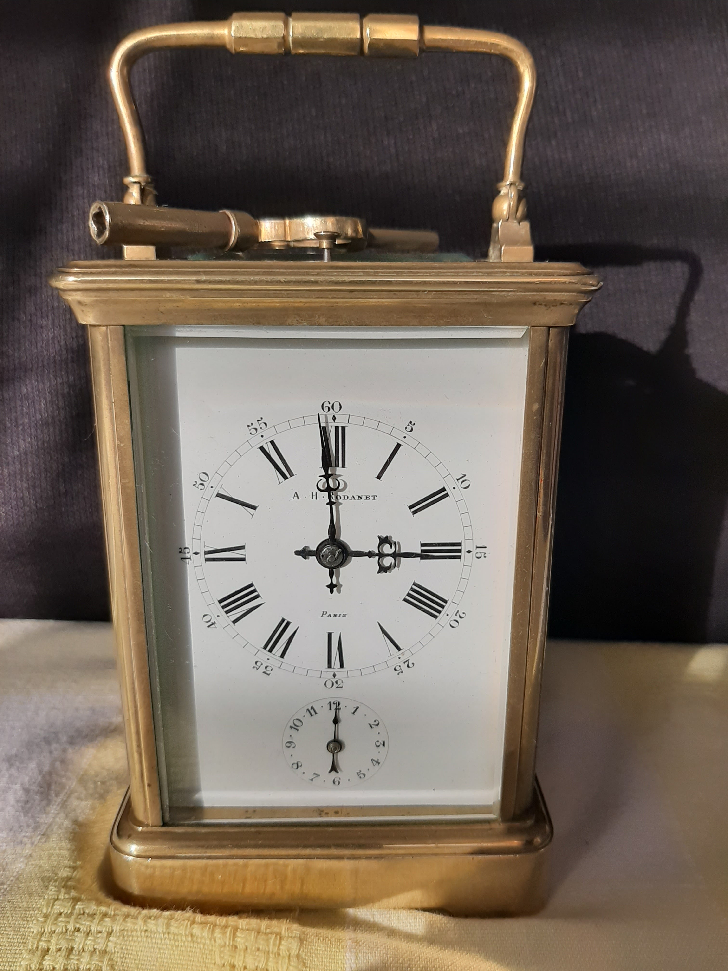 PENDULE d'OFFICIER en laiton et verre biseauté. Signée A. H. Rodanet. Le mouvement à encre à sonnerie.