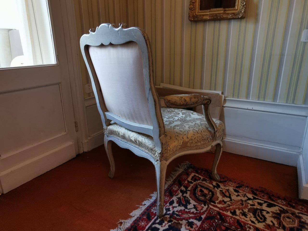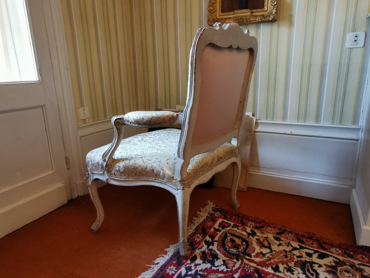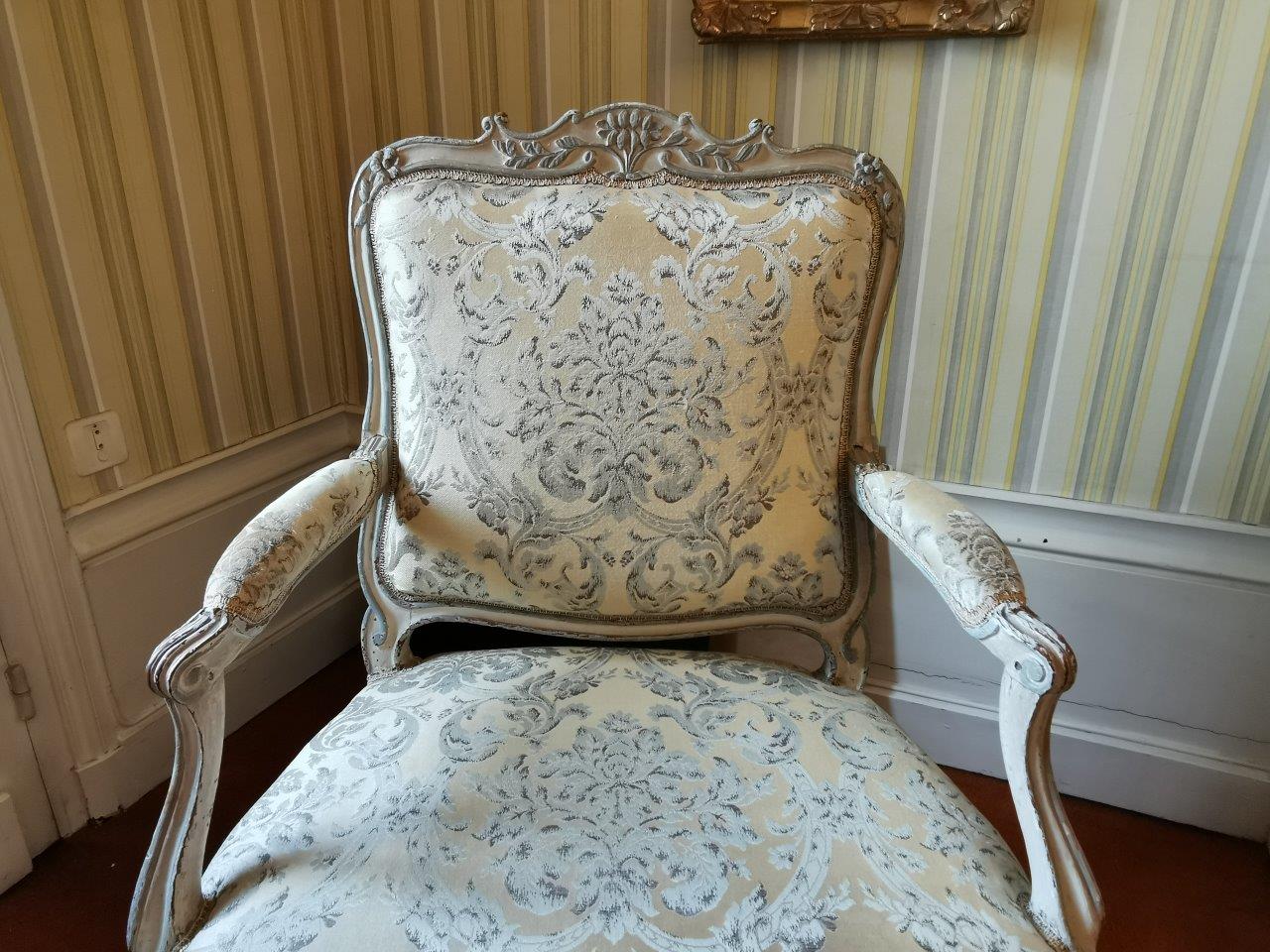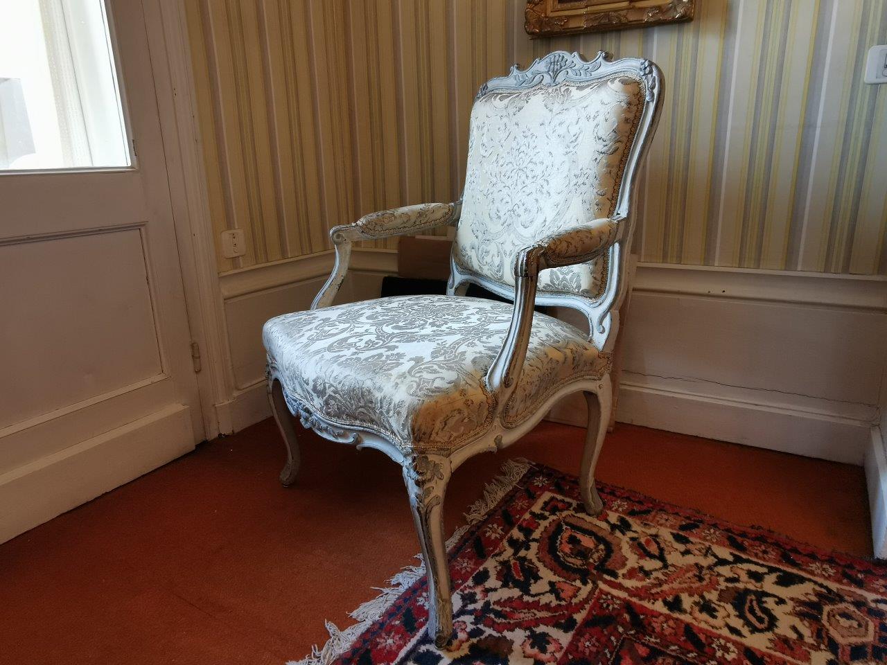 FAUTEUIL à la REINE en bois mouluré, sculpté et laqué gris au dossier orné d’une fleurs aux branches épanouies, accotoirs en coup de fouet tombant en retrait des pieds galbés, nervurés et sculpté de fleurs. La ceinture chantournée et ornée de fleurs.