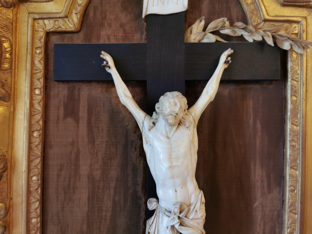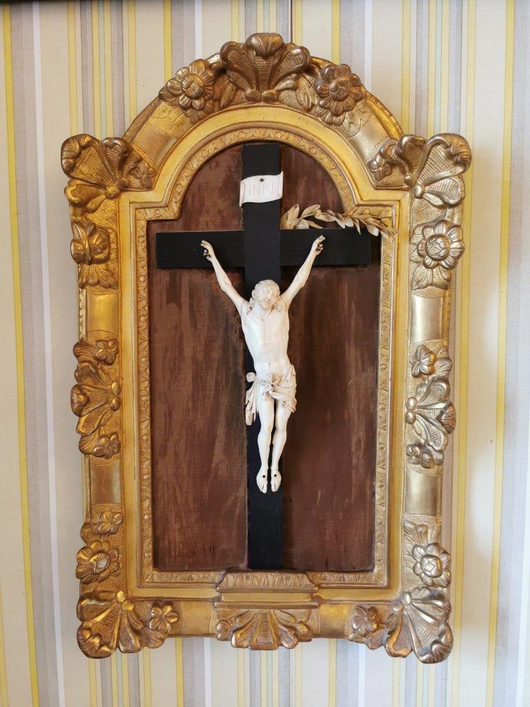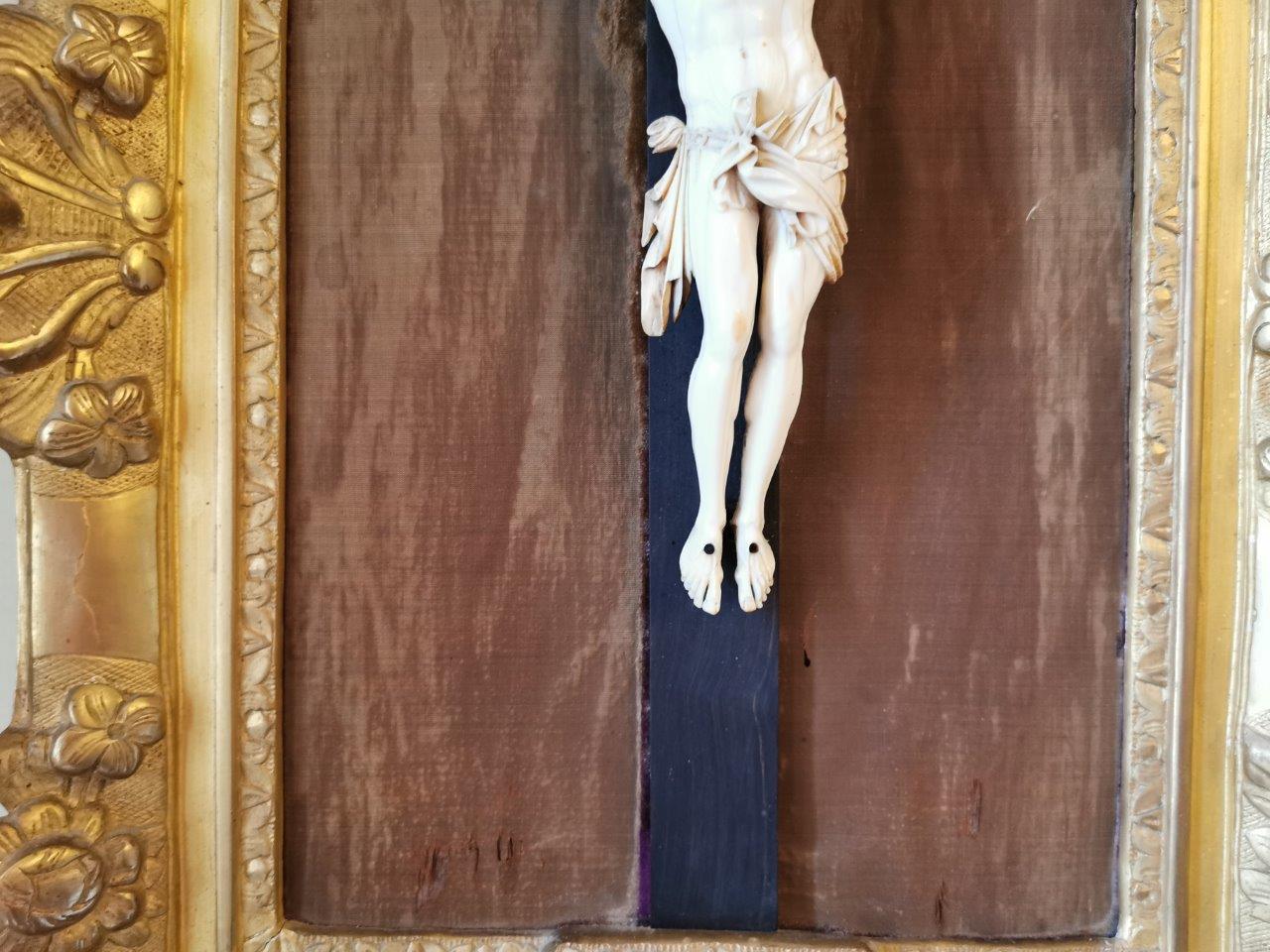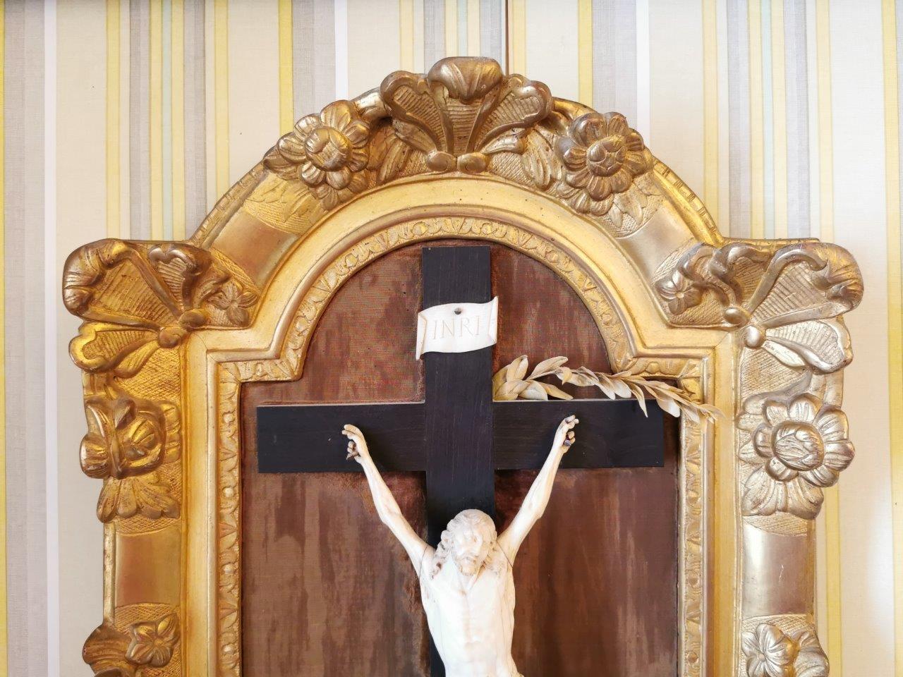 CRUCIFIX en ivoire sculpté sur une crois d’ébène dans un encadrement en bois sculpté et doré à motifs rocaille.