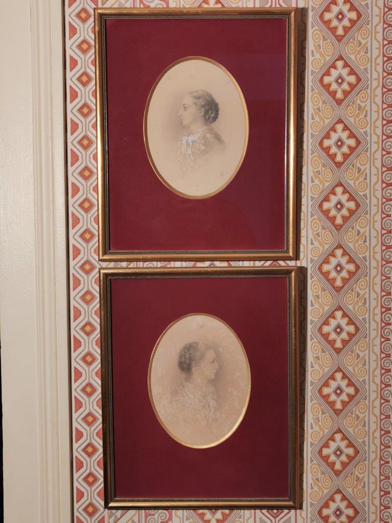 - École FRANÇAISE du XIXe. Deux portraits de femme. Papier. L'un daté 1887, signature illisible. Haut. 19, Larg. 13,5 cm.