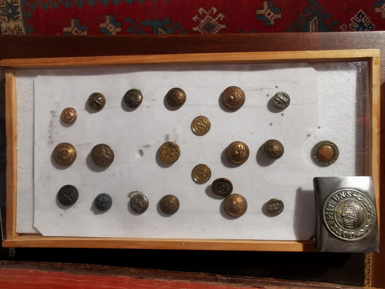JOINT: COLLECTION de BOUTONS MILITAIRES, une BOUCLE de CEINTURE en métal et un petit COFFRET.