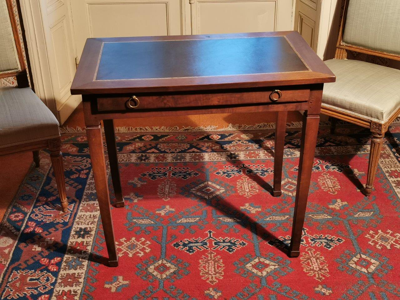 Petit BUREAU en bois teinté façon acajou reposant sur quatre pieds gaines. Dessus cuir vert.