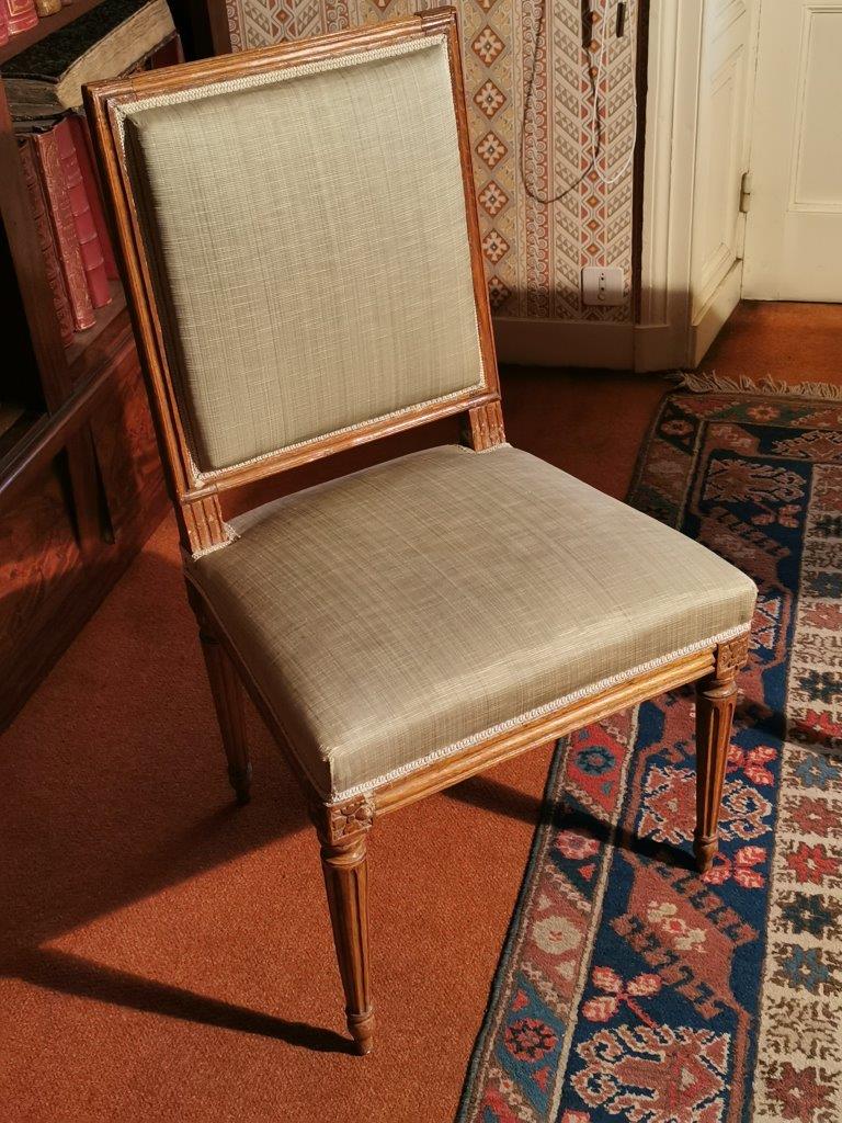 JOINT: Deux CHAISES en bois mouluré à pieds fuselés, cannelés. Style Louis XVI. (Haut. 88,5 Larg. 49, Prog. 50 cm) et un TAPIS en lain à fond rouge (Long. 350, Larg. 192 cm).