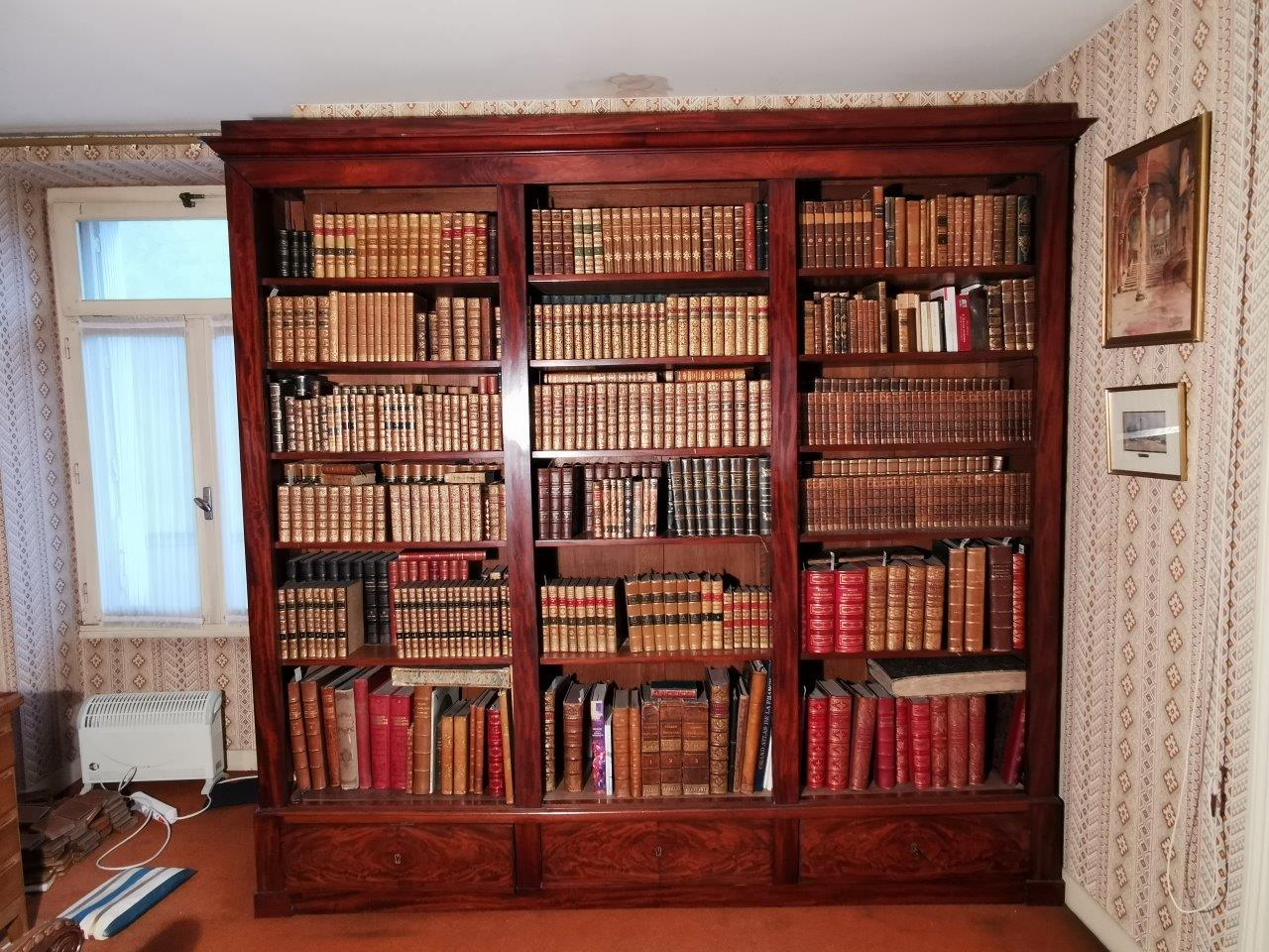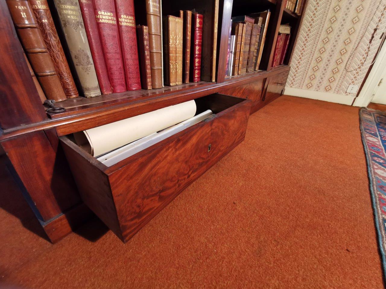 BIBLIOTHÉQUE en placage d'acajou à trois compartiments et ouvrant par trois tiroirs en partie inférieure. Chaque compartiment abritant six étagères.