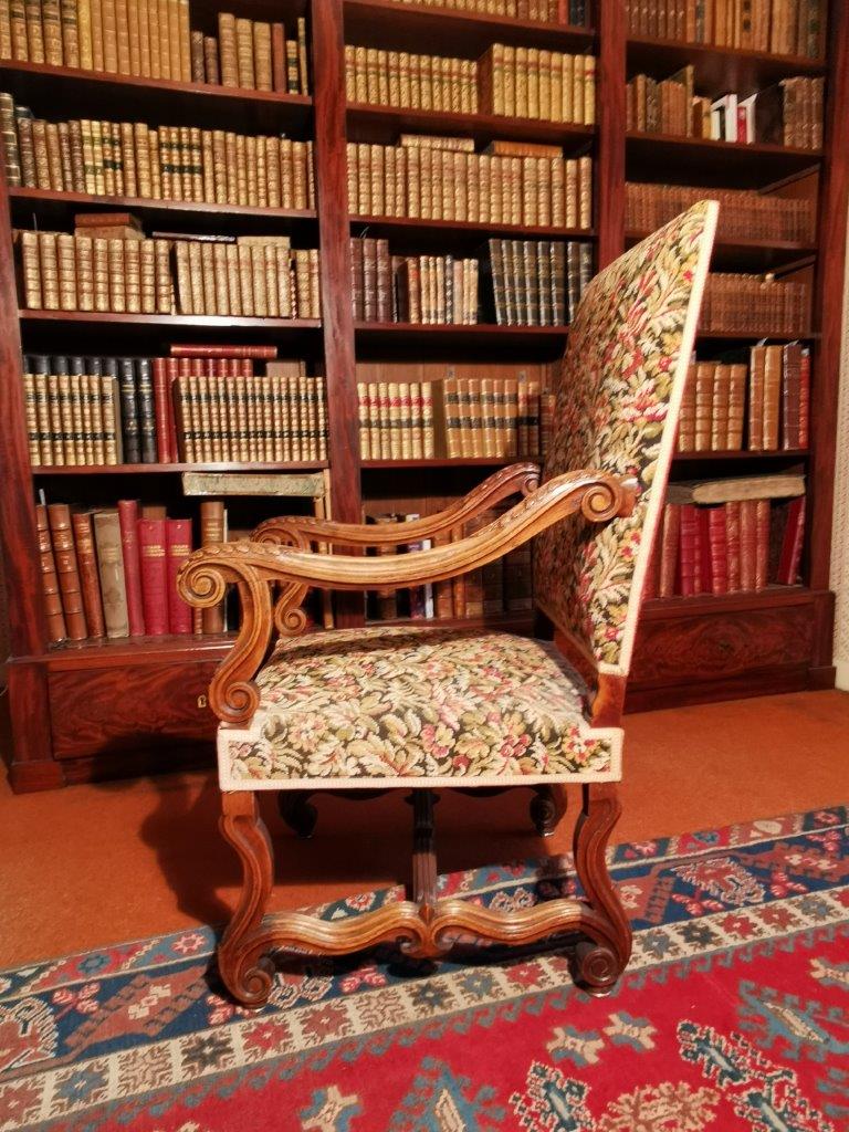 FAUTEUIL à DOSSIER DROIT en bois naturel les accotoirs à enroulements et décor de feuilles d'acanthe. Repose sur quatre pieds réunis par une entretoise en H.