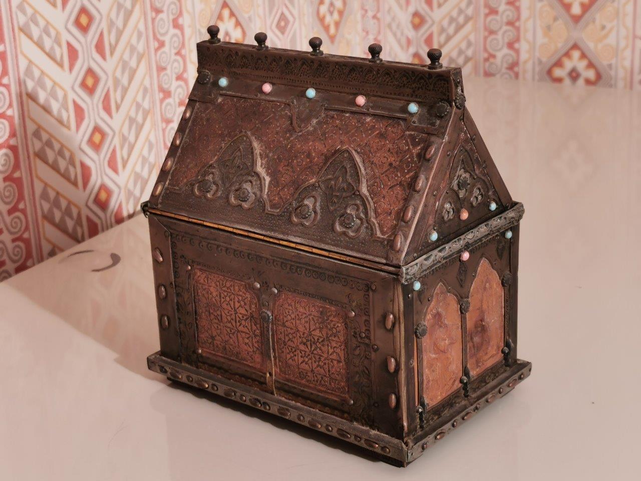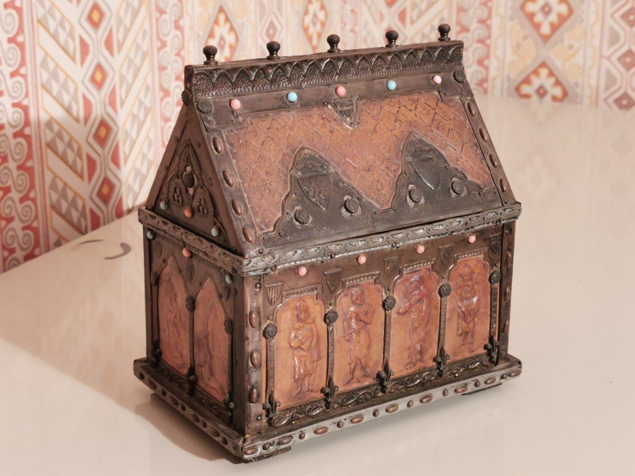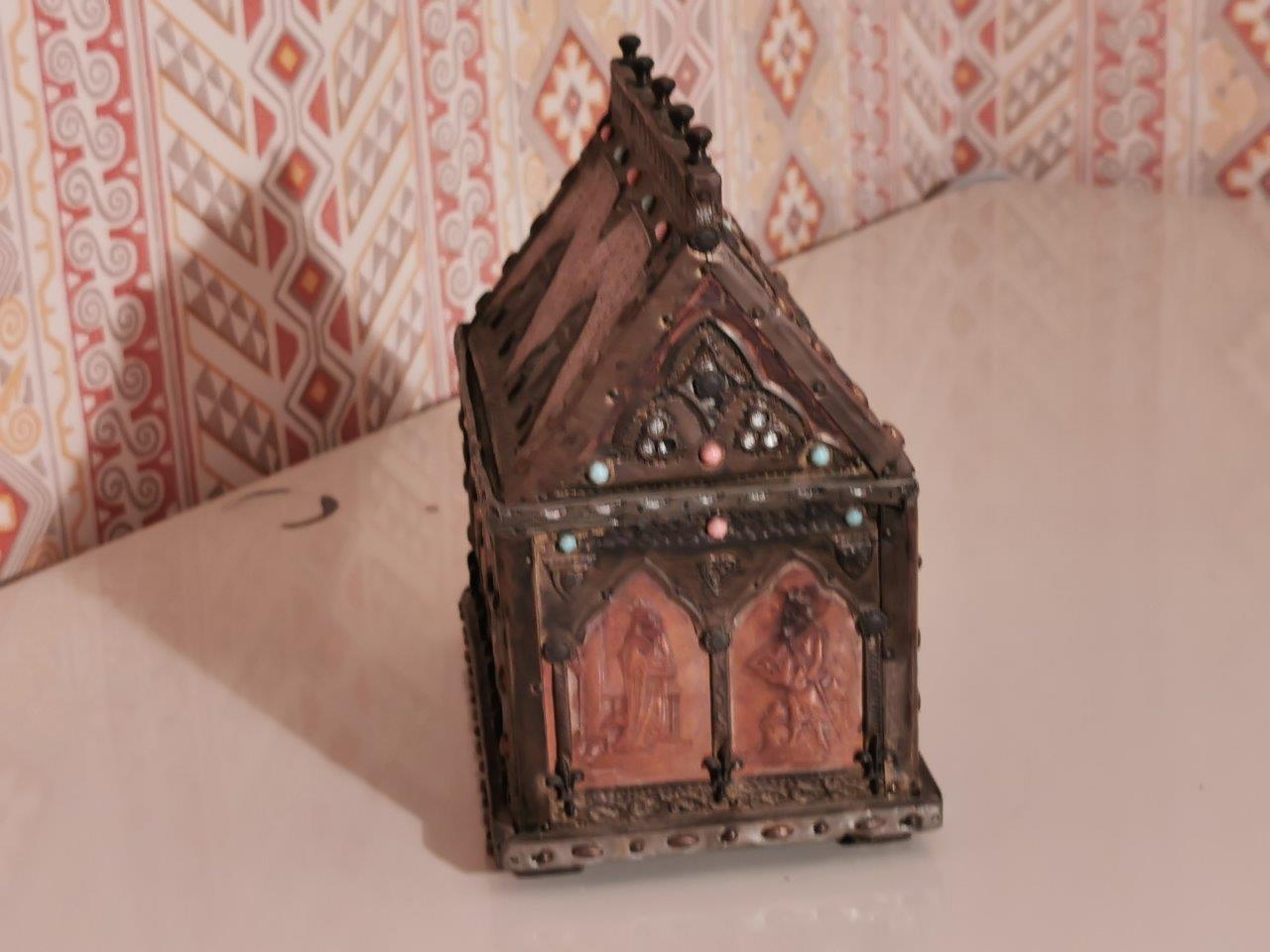 Petit COFFRET RELIQUAIRE en forme de CHAPELLE en cuir repoussé, métal et incrustation.