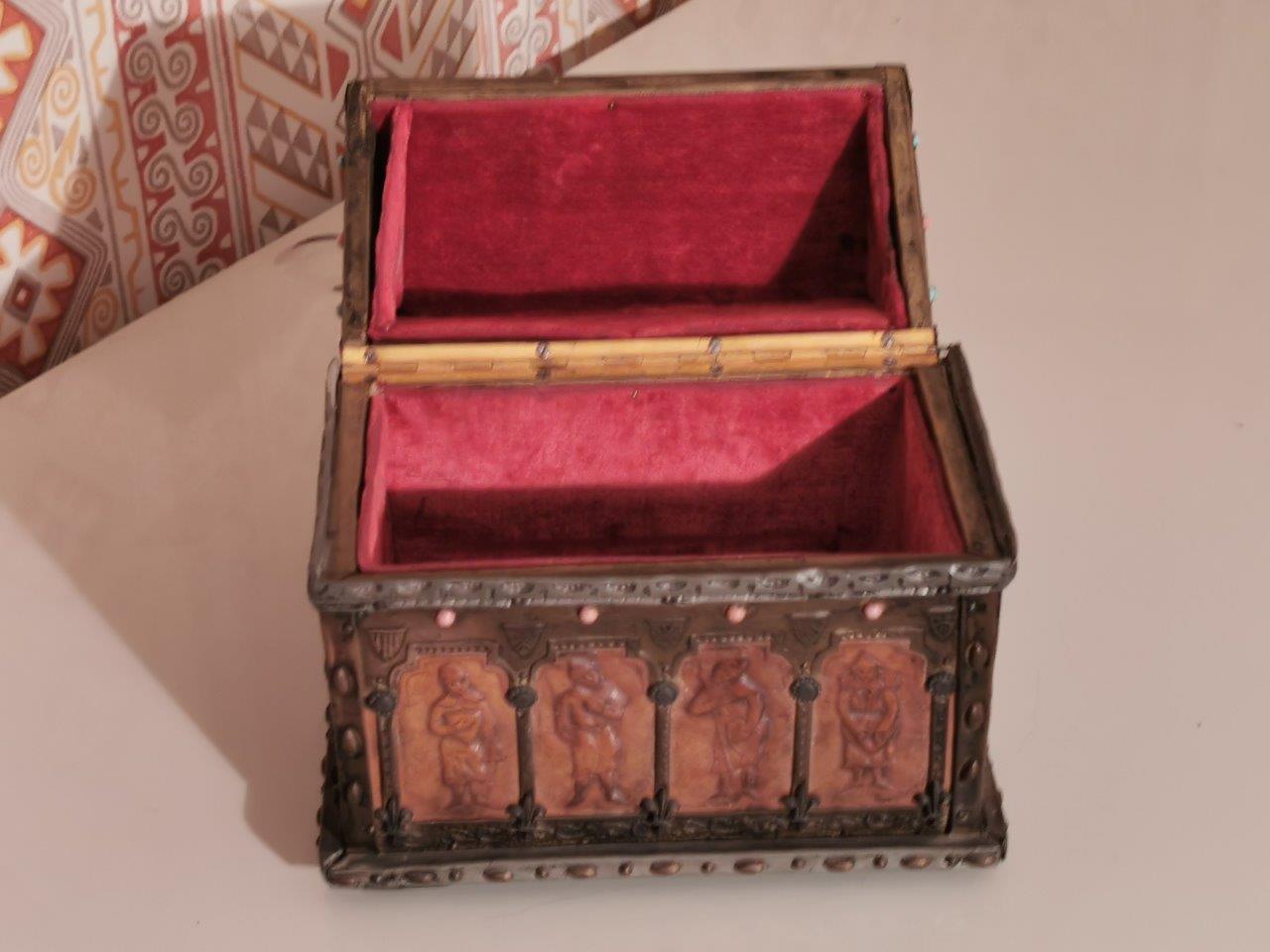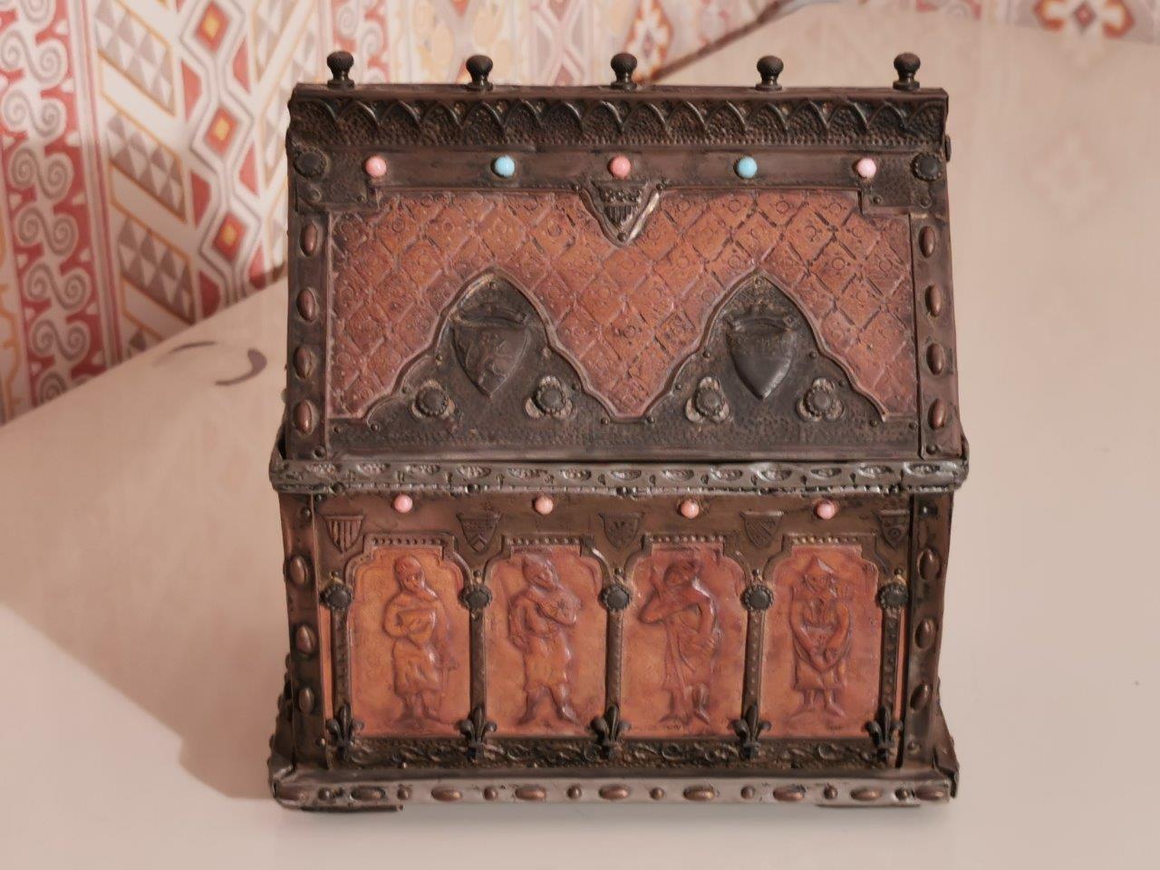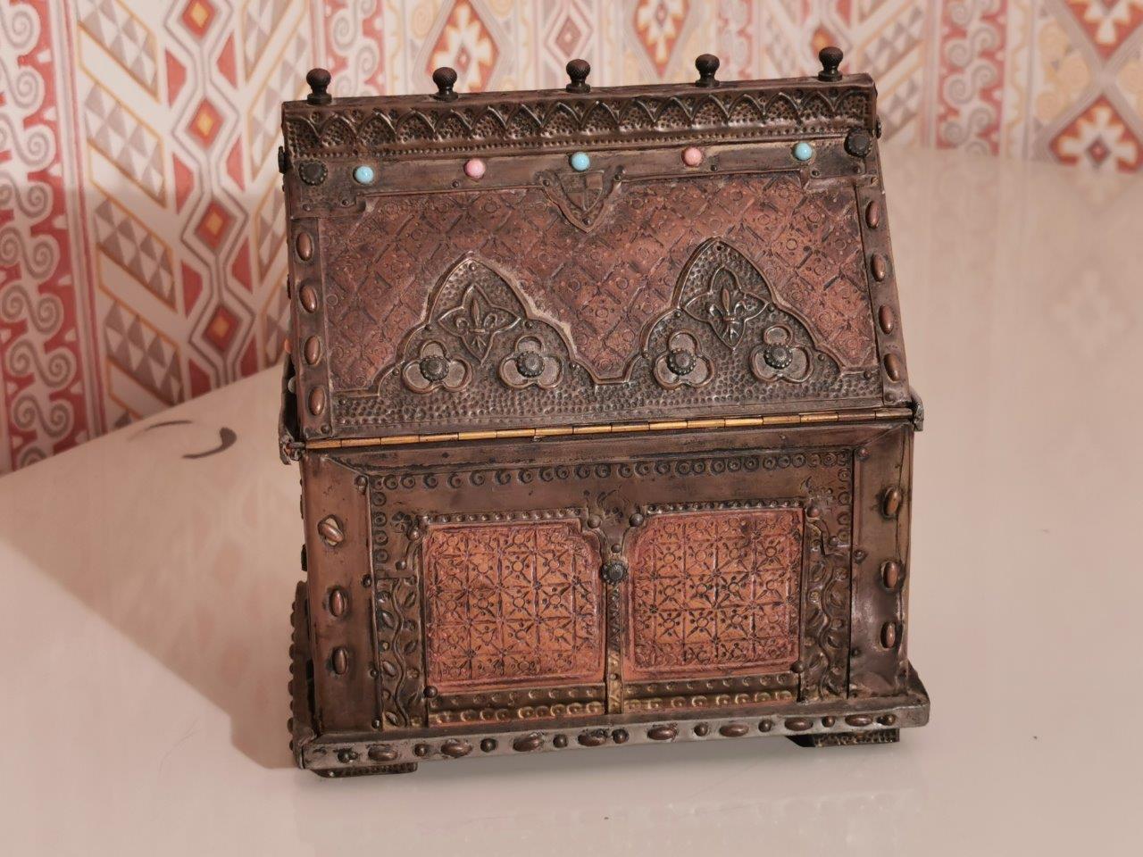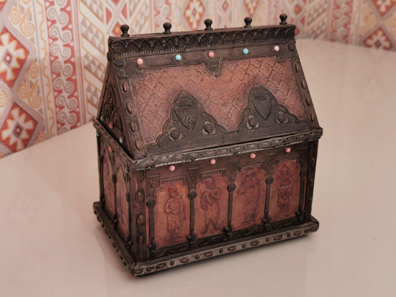 Petit COFFRET RELIQUAIRE en forme de CHAPELLE en cuir repoussé, métal et incrustation.