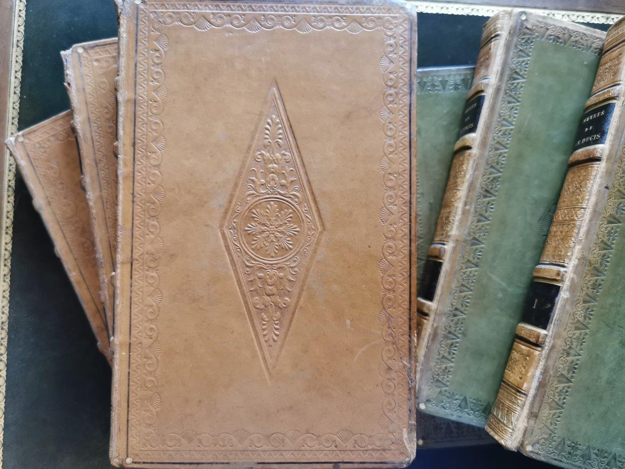 -Ducis: uvres. Paris, Nepveu,1819. 3 vol. in-8, plein veau olivâtre. Décor à froid sur les plats (roulette et grand losange central) ; décor doré sur le dos à 4 faux-nerfs. Toutes tranches dorées. Reliure signée Thouvenin. (Ors du dos ternis).